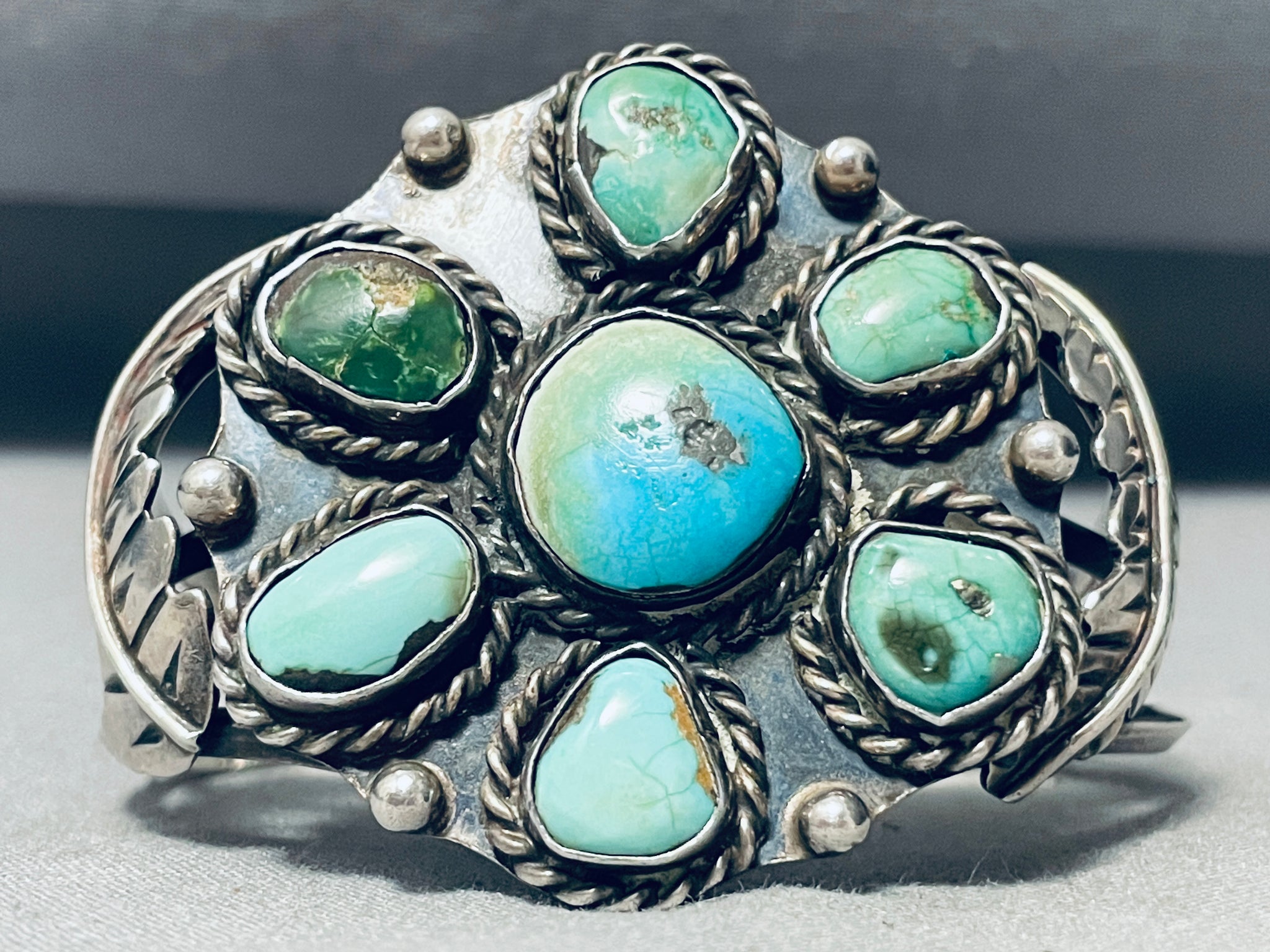 This is an exceptional vintage Navajo large turquoise cluster silver bracelet. This amazing bracelet contains beautiful turquoise stones that appear to be from the wonderful Royston turquoise stone with a single beautiful Cerrillos turquoise stone. Surrounding the stones are amazing silver ropes with accenting raindrops. This phenomenal bracelet consists of two accenting curved silver leaves. This bracelet contains a sturdy triple silver shank cuff. The center stone measures around 5/8" x 1/2". The width of the bracelet measures around 1-7/8". Sterling silver. Cir. Mid century . The inside end to end measures around 5" with an additional 1" gap. Sturdy 39 grams.