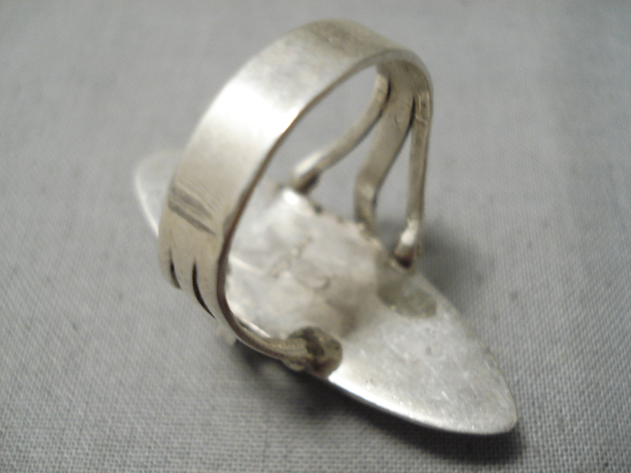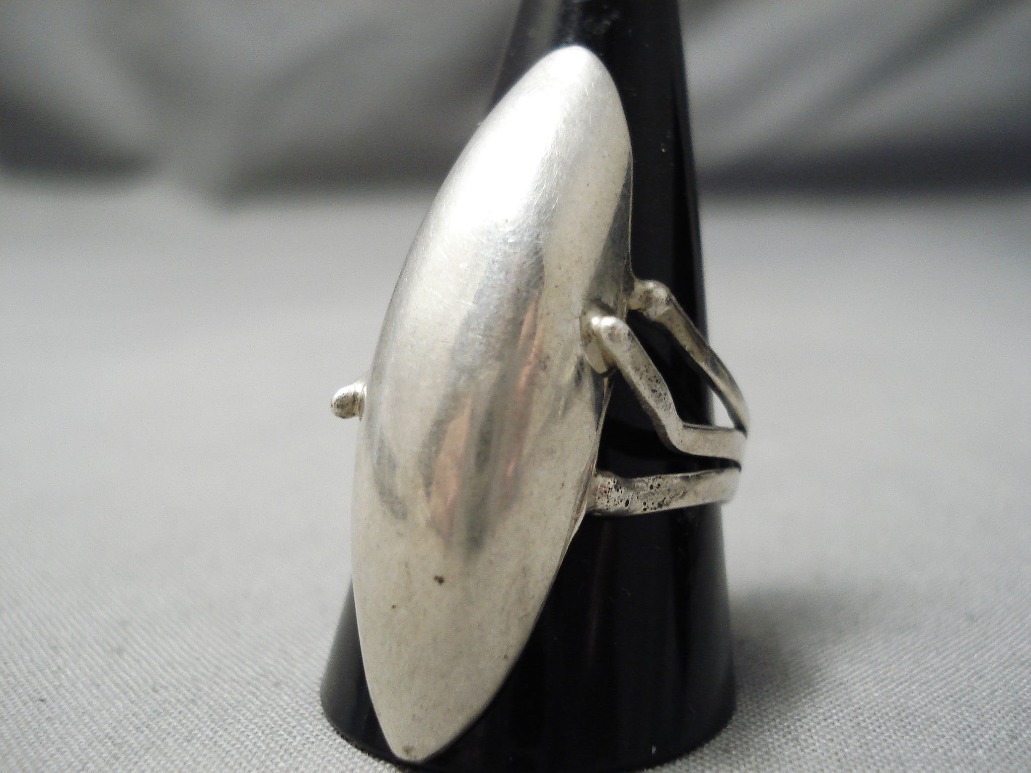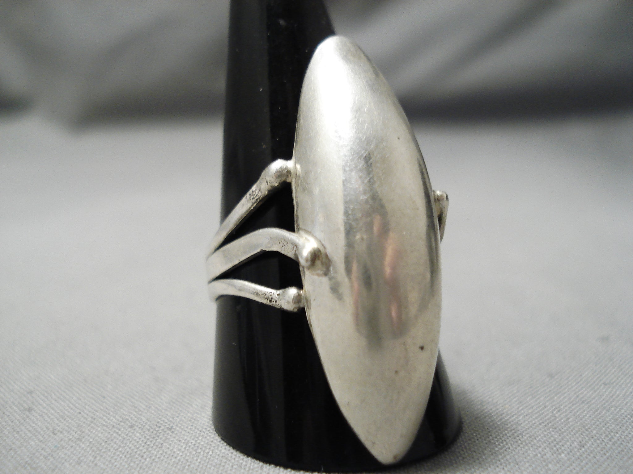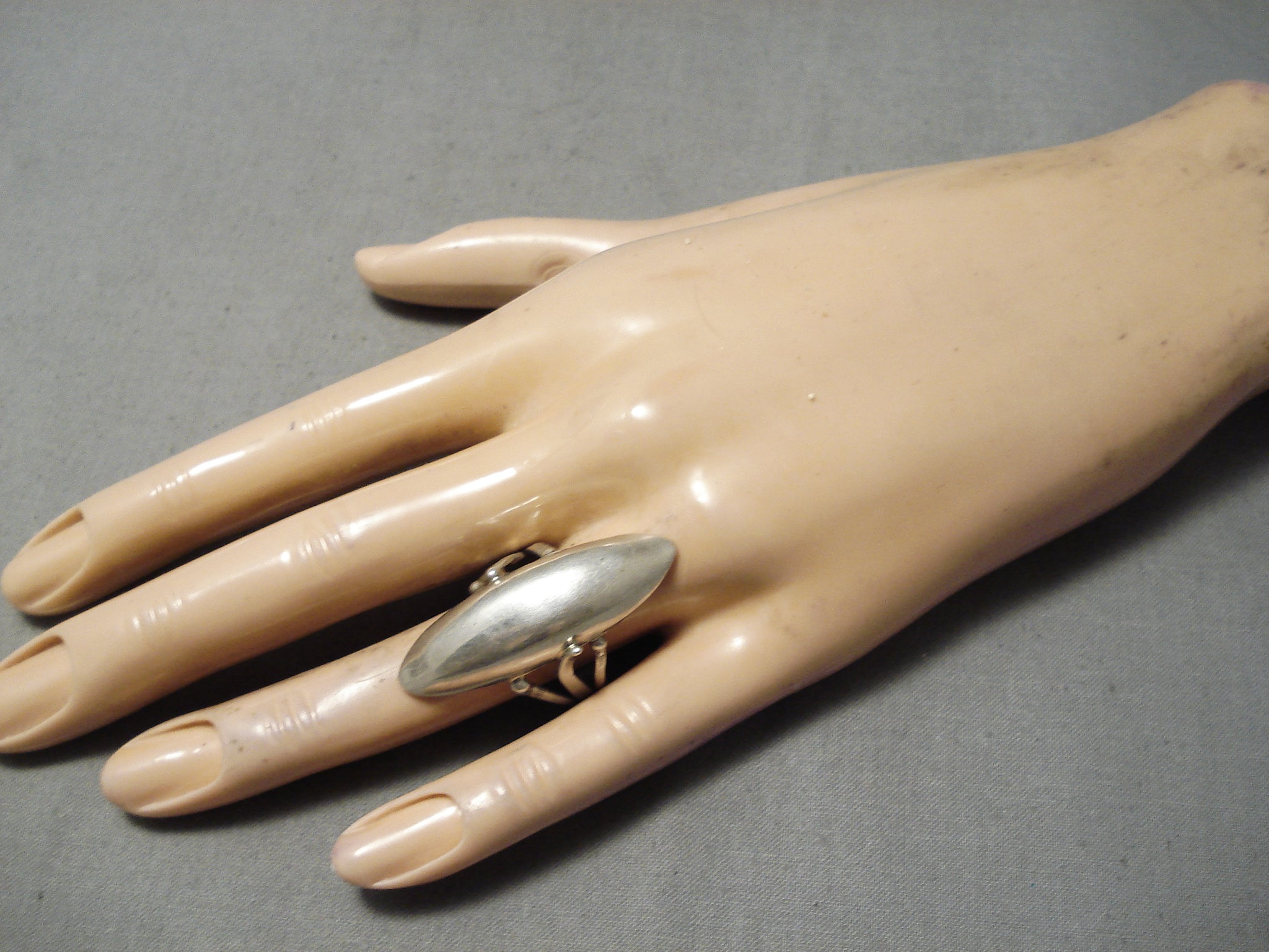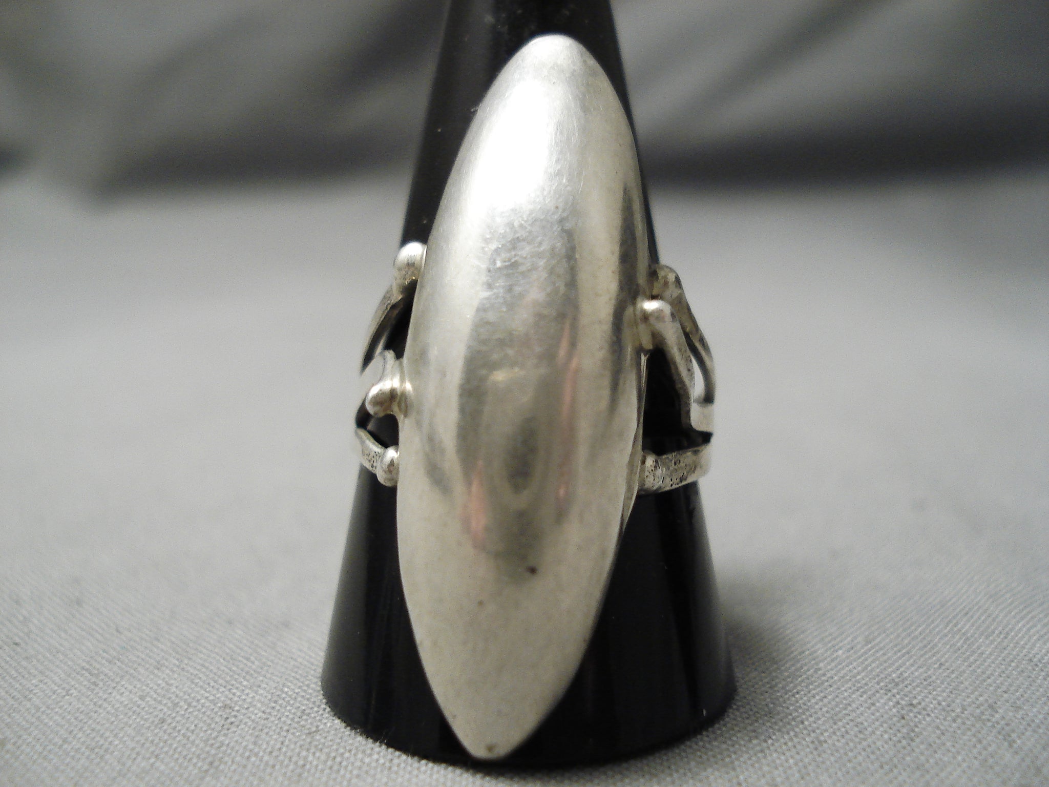 Up for sale is this fabulous vintage Hopi silver ring. This is a tremendous elongated torpedo shaped ring – and interesting how the artist chose the center rails on either side to wrap onto the sides of the domed face of the ring. A very nice look upon the finger. The ring face measures around 1-1/2" x 3/4". Signed by Hopi artist, Q. The ring size is around 10-1/2. Sterling silver. Sturdy 8 grams.