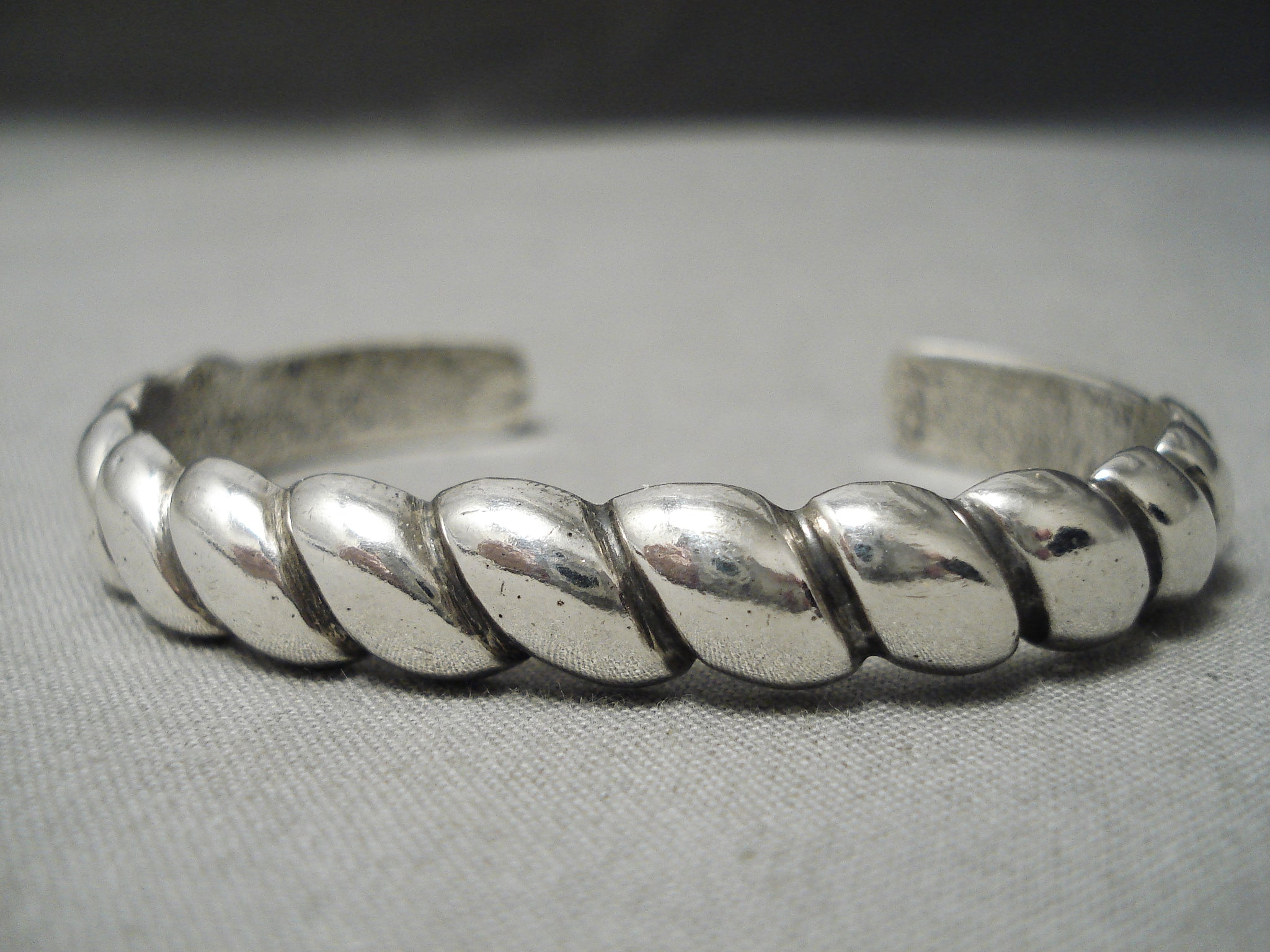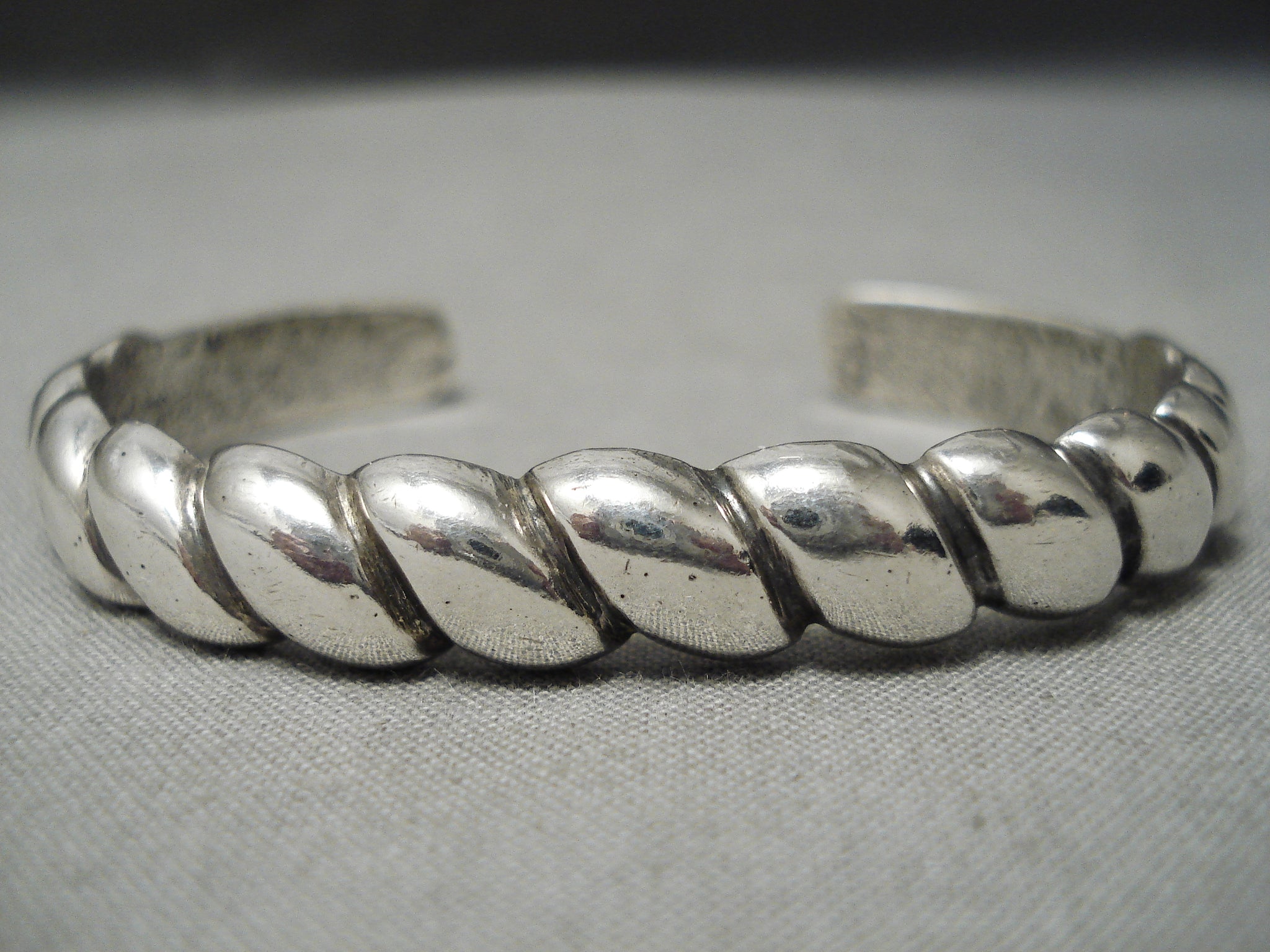 This is an amazing vintage Navajo all silver bracelet. This incredible bracelet is heavy and thick consisting of a unique twisted cuff design. This bracelet is hand casted with absolutely remarkable silver works. The width of the bracelet measures around 1/4". Sterling silver. Cir. Mid century . The inside end to end measures around 5-1/4" with an additional 1" gap. Sturdy 33 grams.