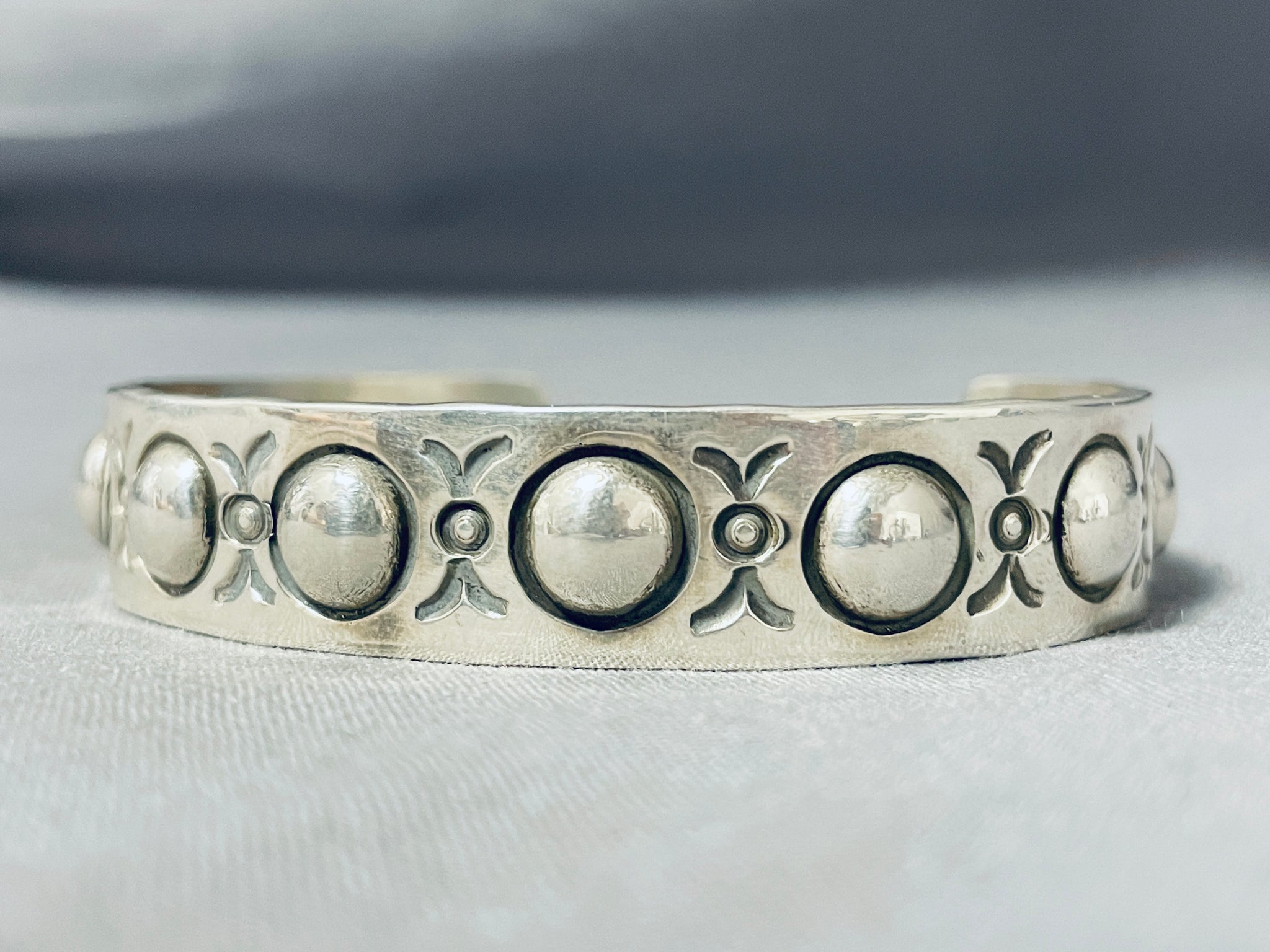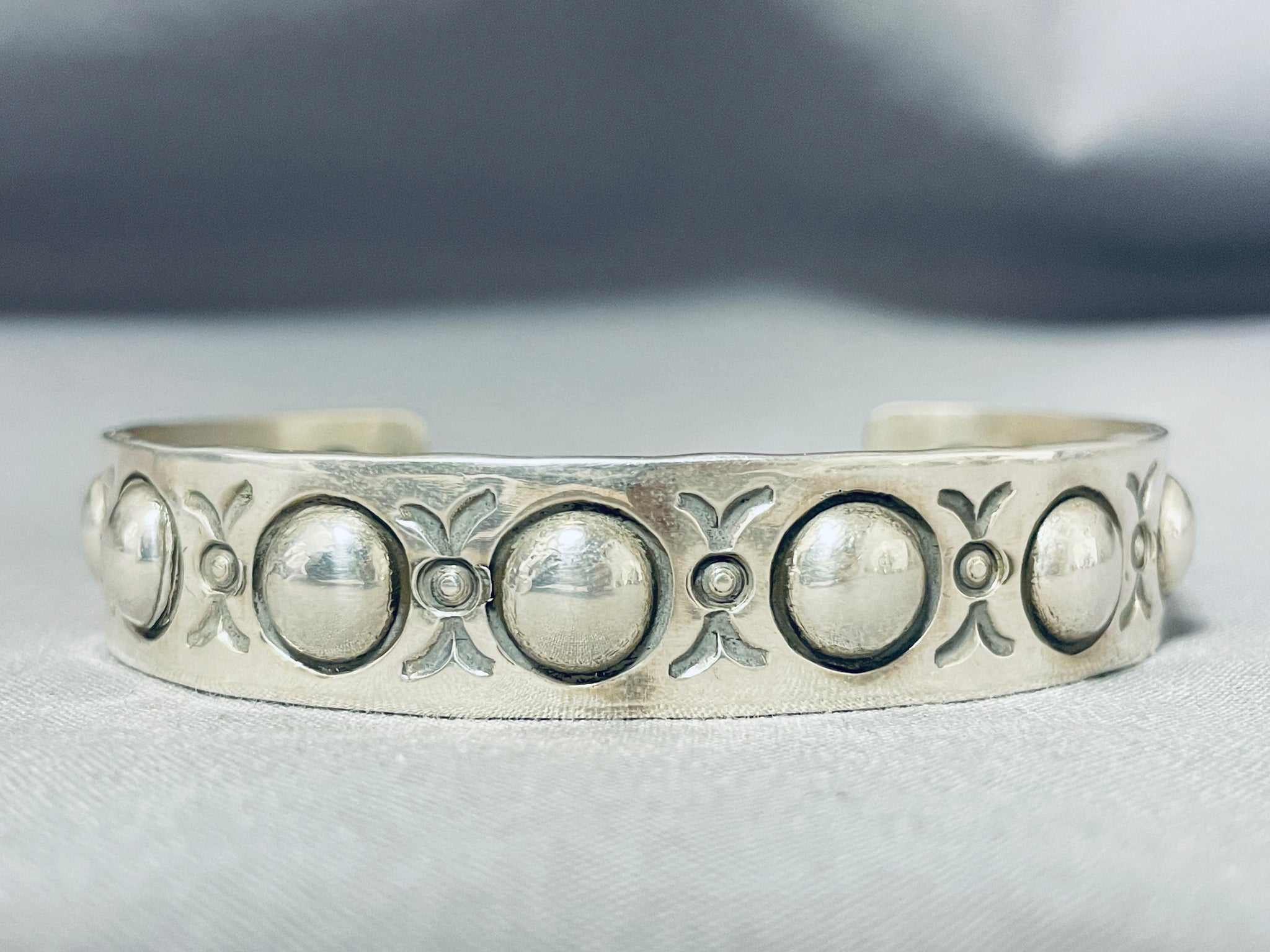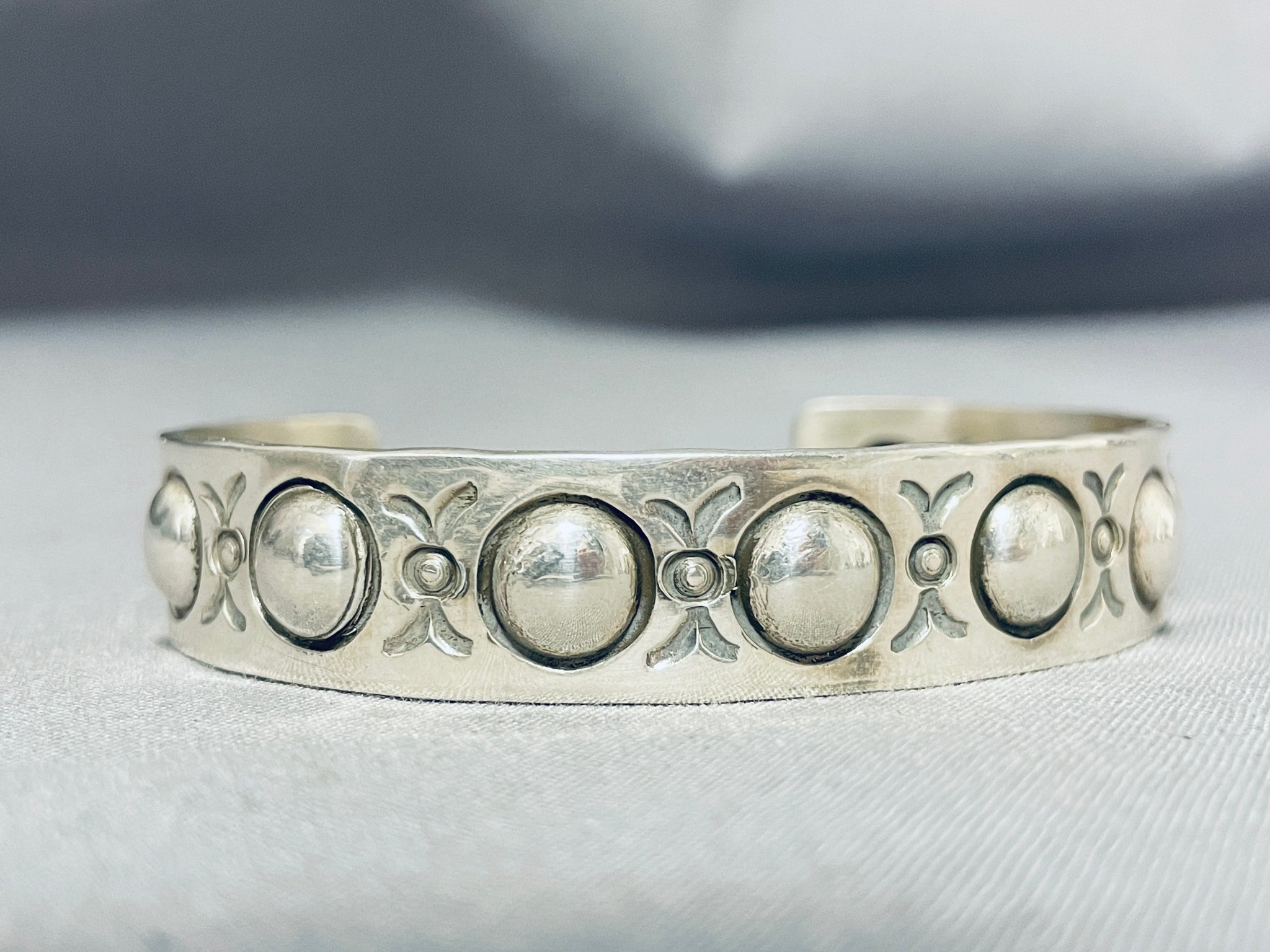 Here we have an exceptional Navajo silver bracelet having handcarved round silver repousse designs and accented with silver handstampings all across the handcarved solid silver cuff! Truly Unique! The width of the bracelet measures around 1/2". Signed by Navajo artist, Al Cleveland. Sterling silver, marked. The inside end to end measures around 6" with an additional 1-3/8" gap. Sturdy 33 grams.
