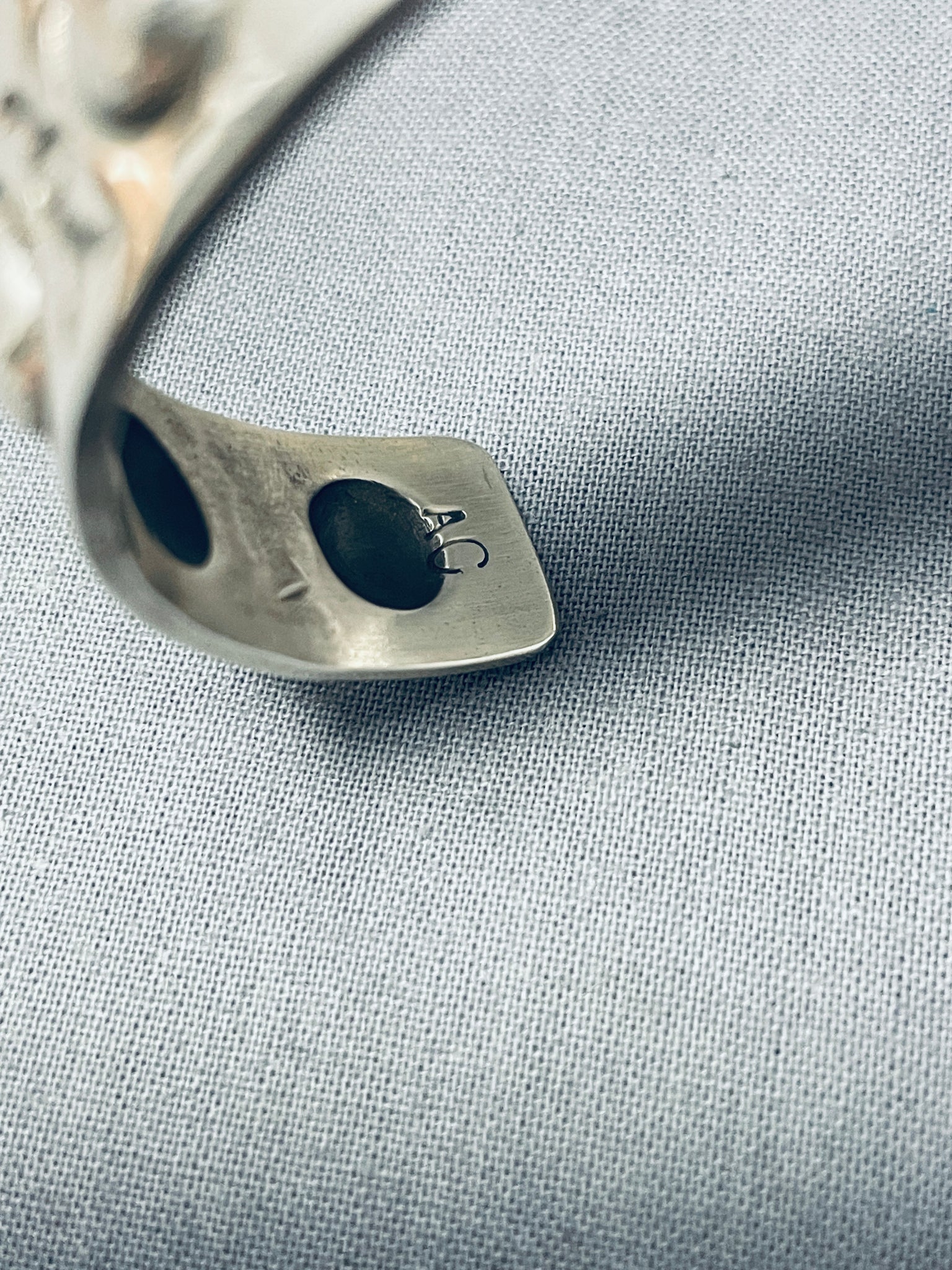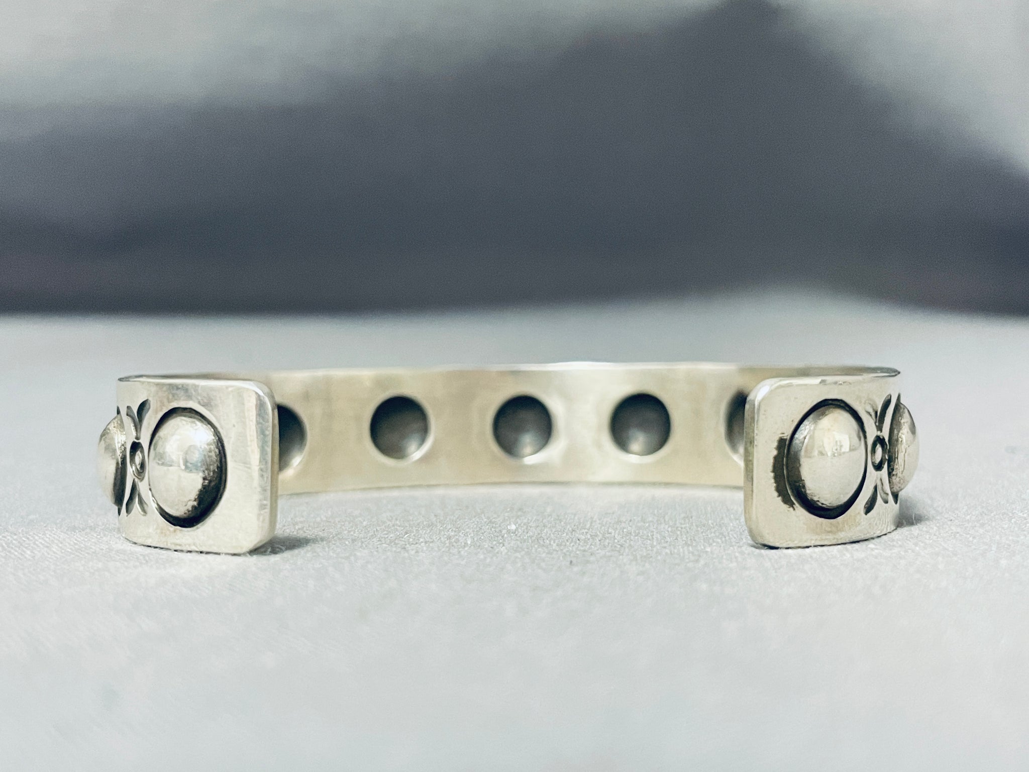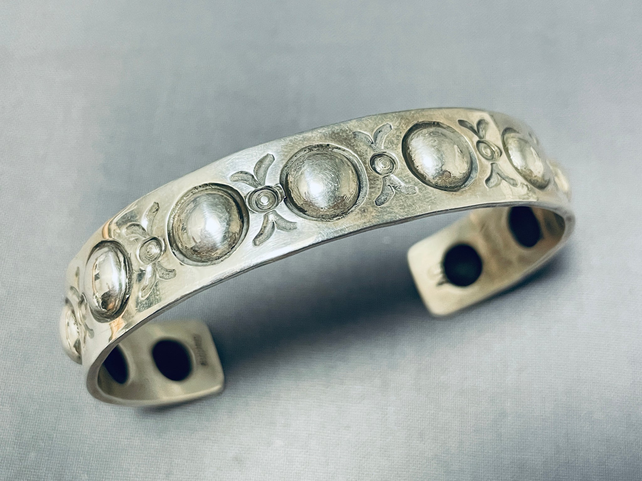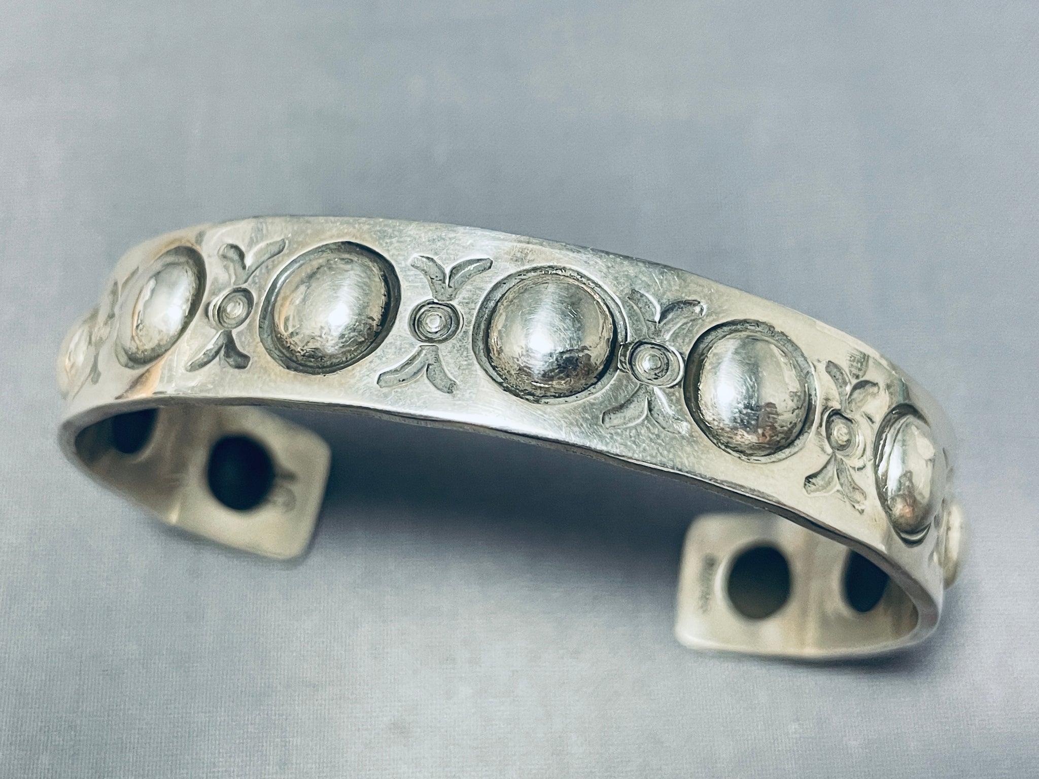 Here we have an exceptional Navajo silver bracelet having handcarved round silver repousse designs and accented with silver handstampings all across the handcarved solid silver cuff! Truly Unique! The width of the bracelet measures around 1/2". Signed by Navajo artist, Al Cleveland. Sterling silver, marked. The inside end to end measures around 6" with an additional 1-3/8" gap. Sturdy 33 grams.