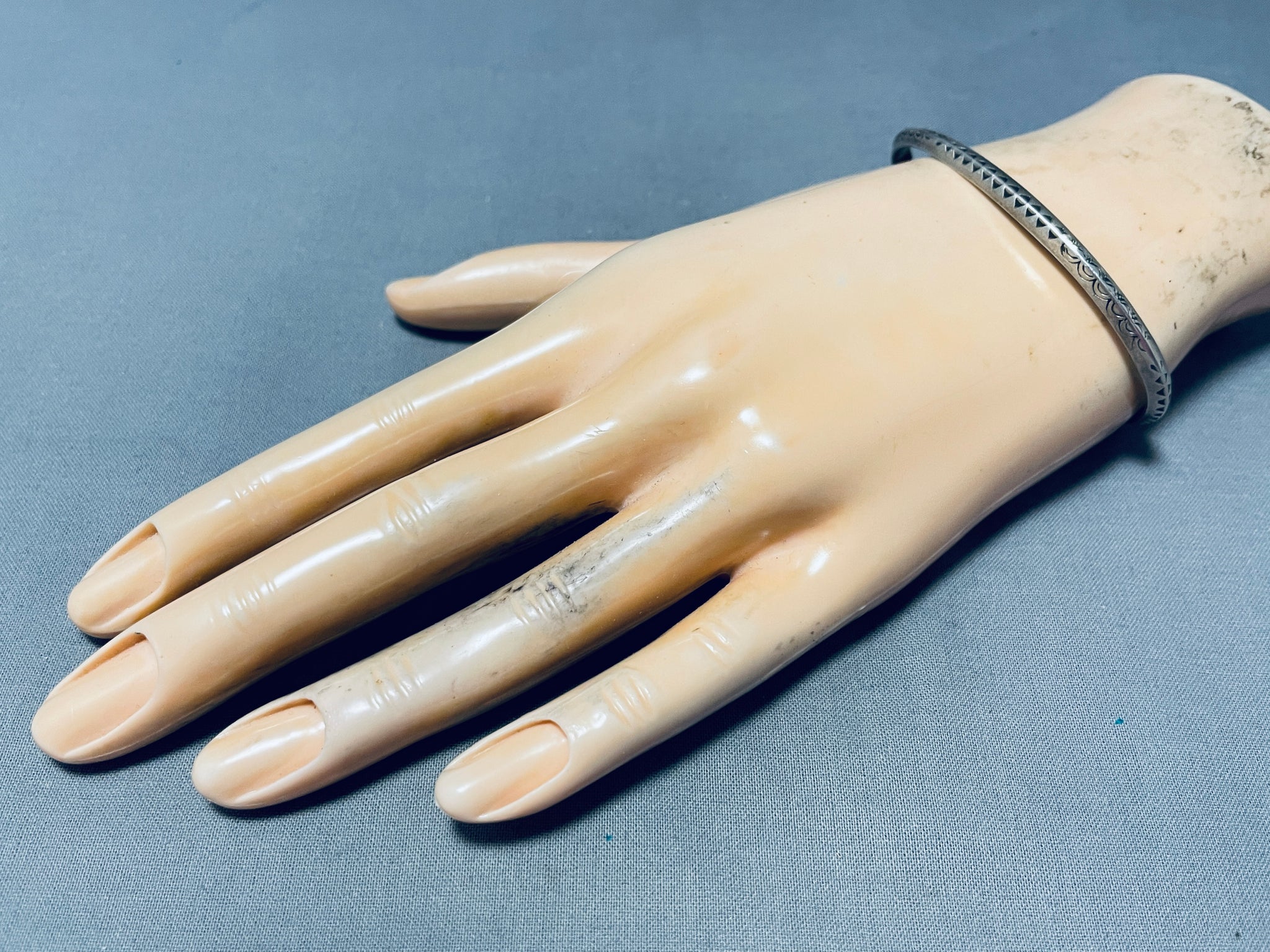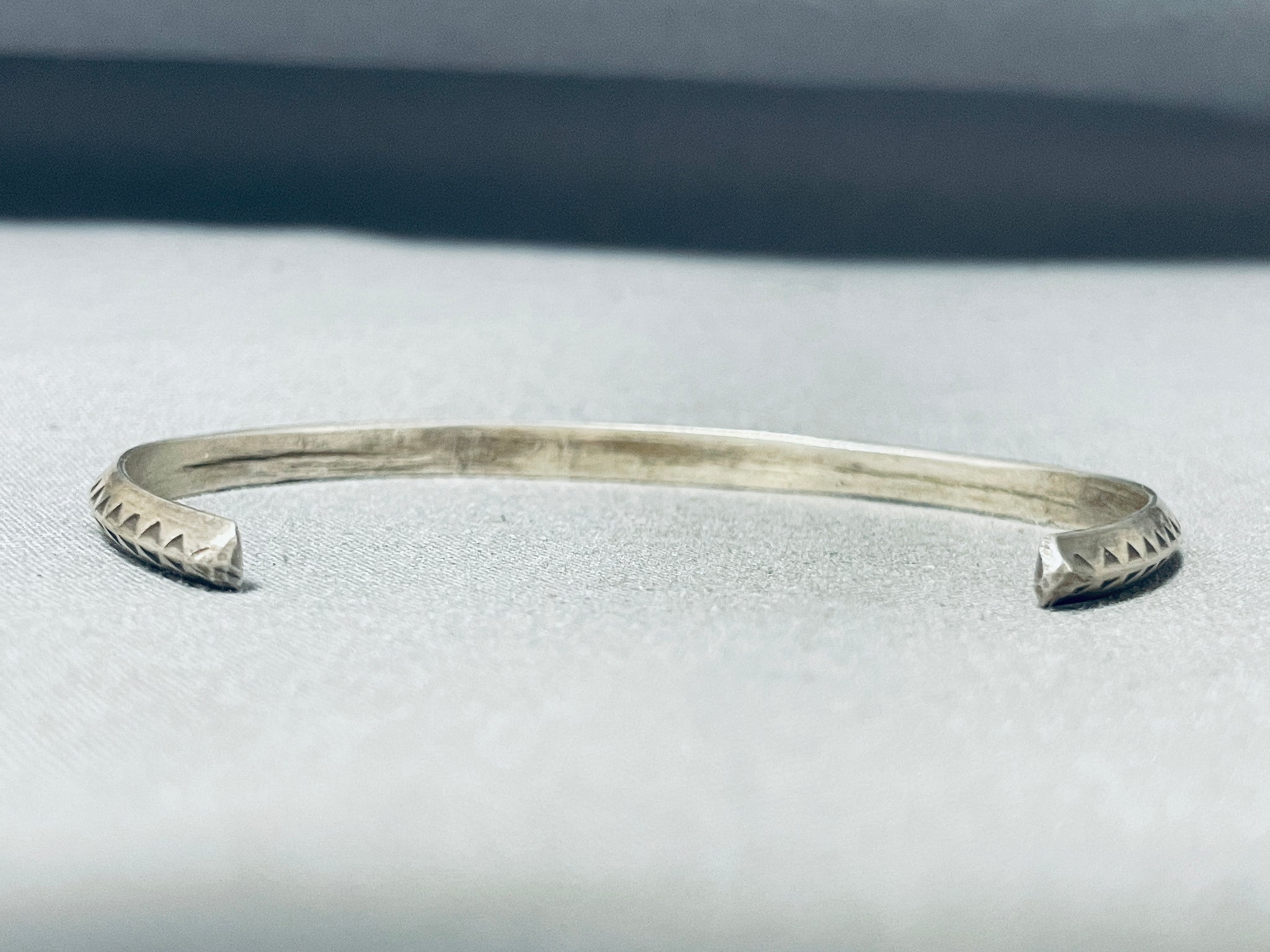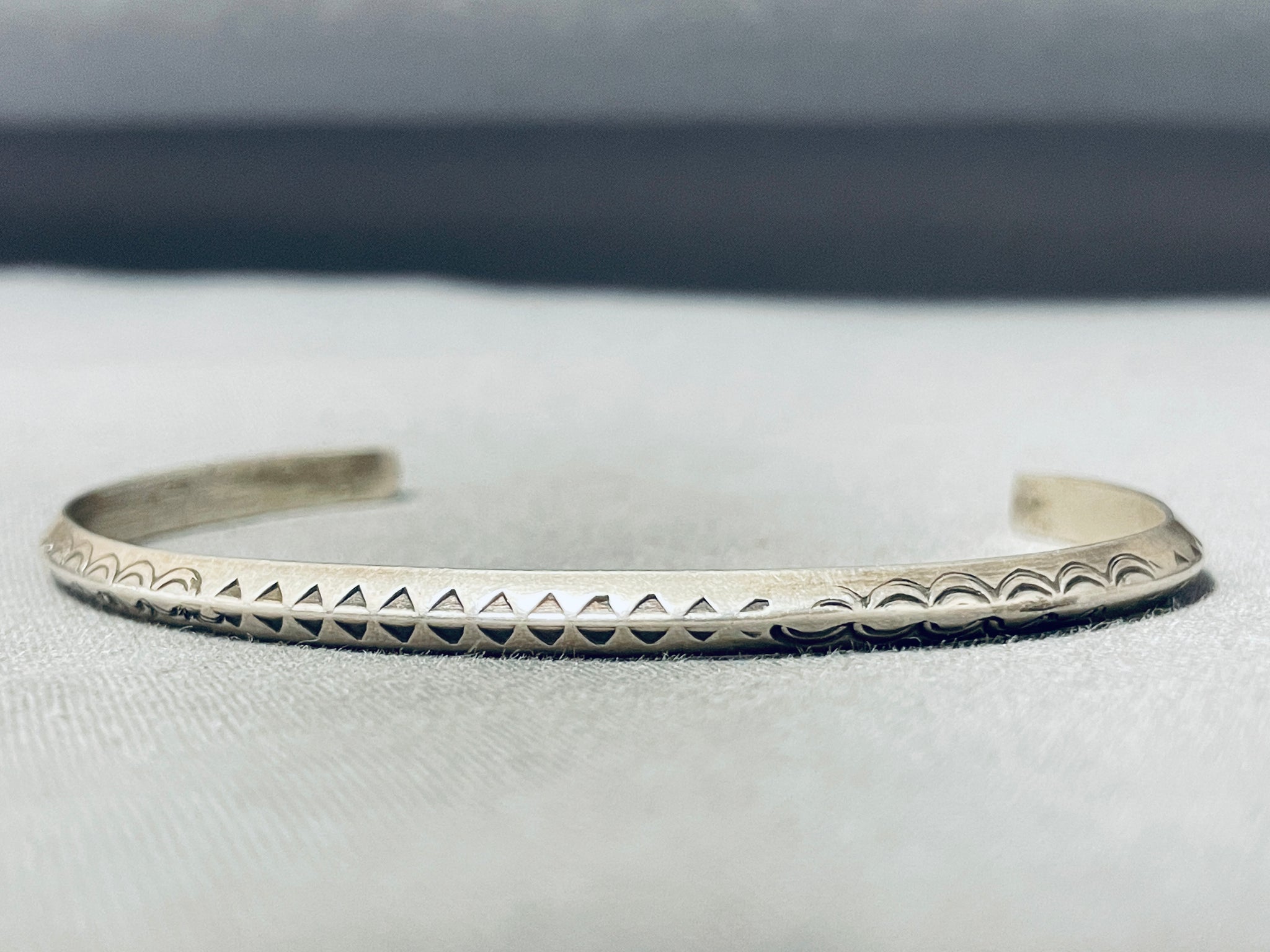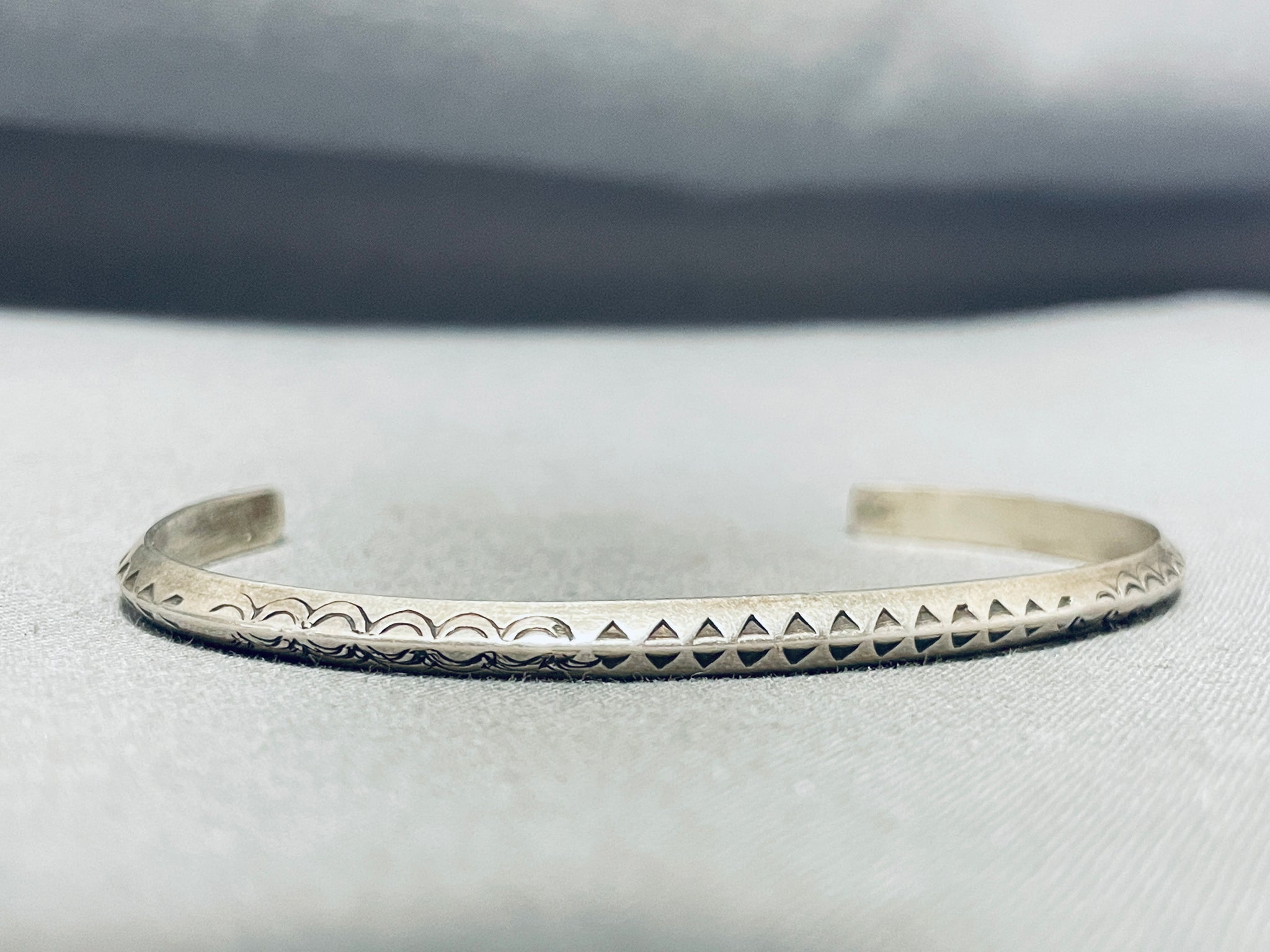 This is a lovely vintage Navajo bracelet! It features intricate hand carved and hand stamped designs across a solid silver cuff! Impressive Artistry! The width of the bracelet measures around 1/8". Sterling silver. The inside end to end measures around 5-1/8" with an additional 1-3/4" gap. Sturdy 9 grams.