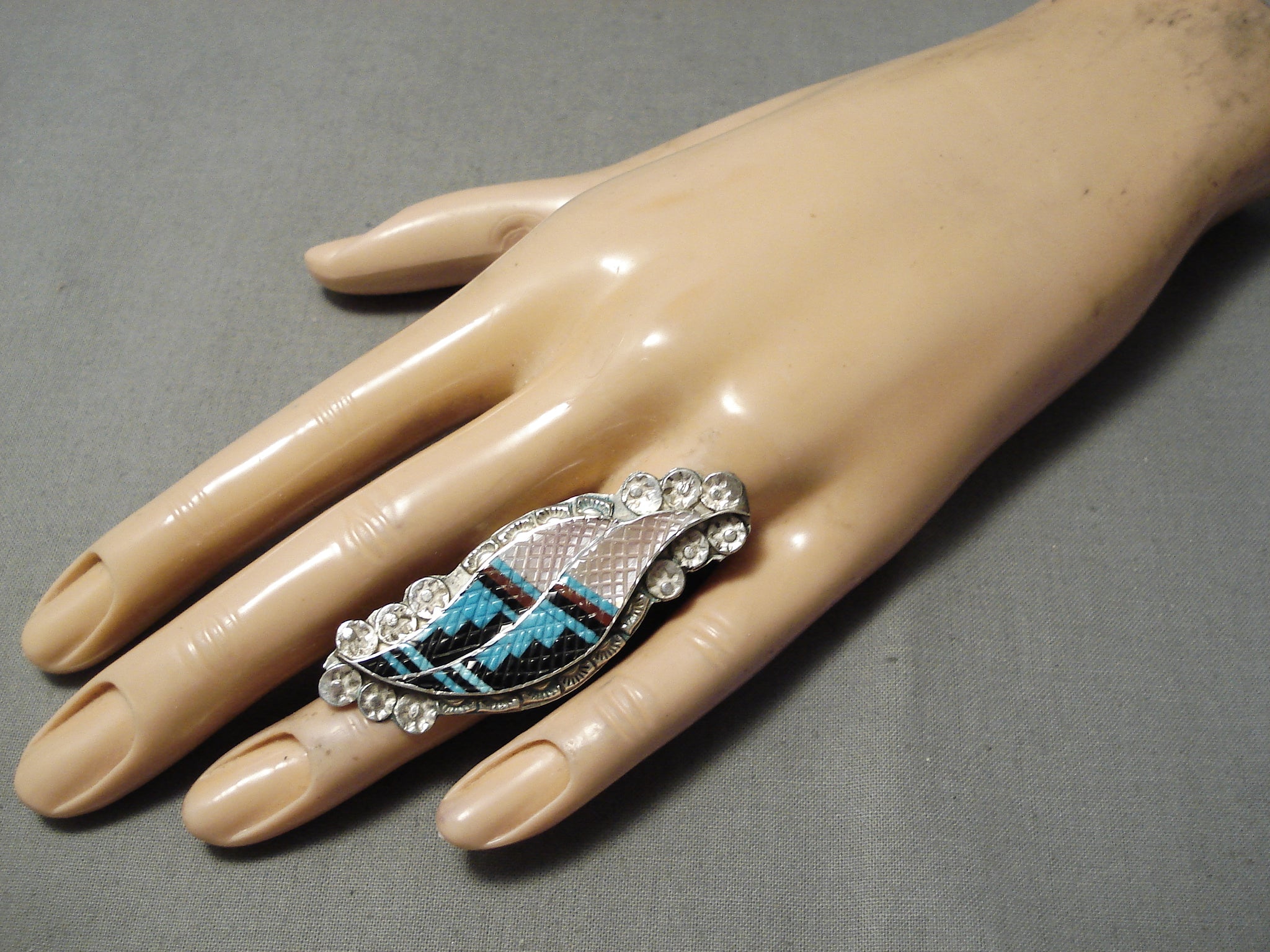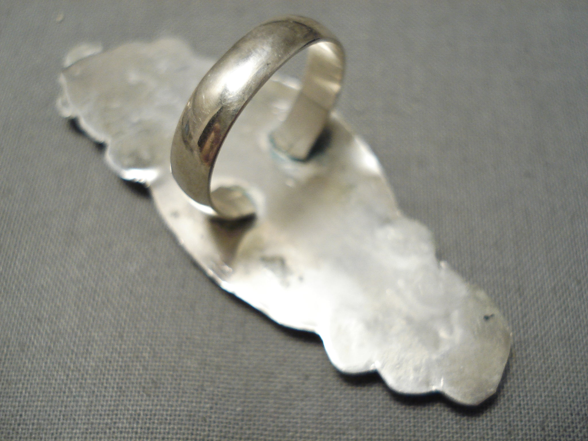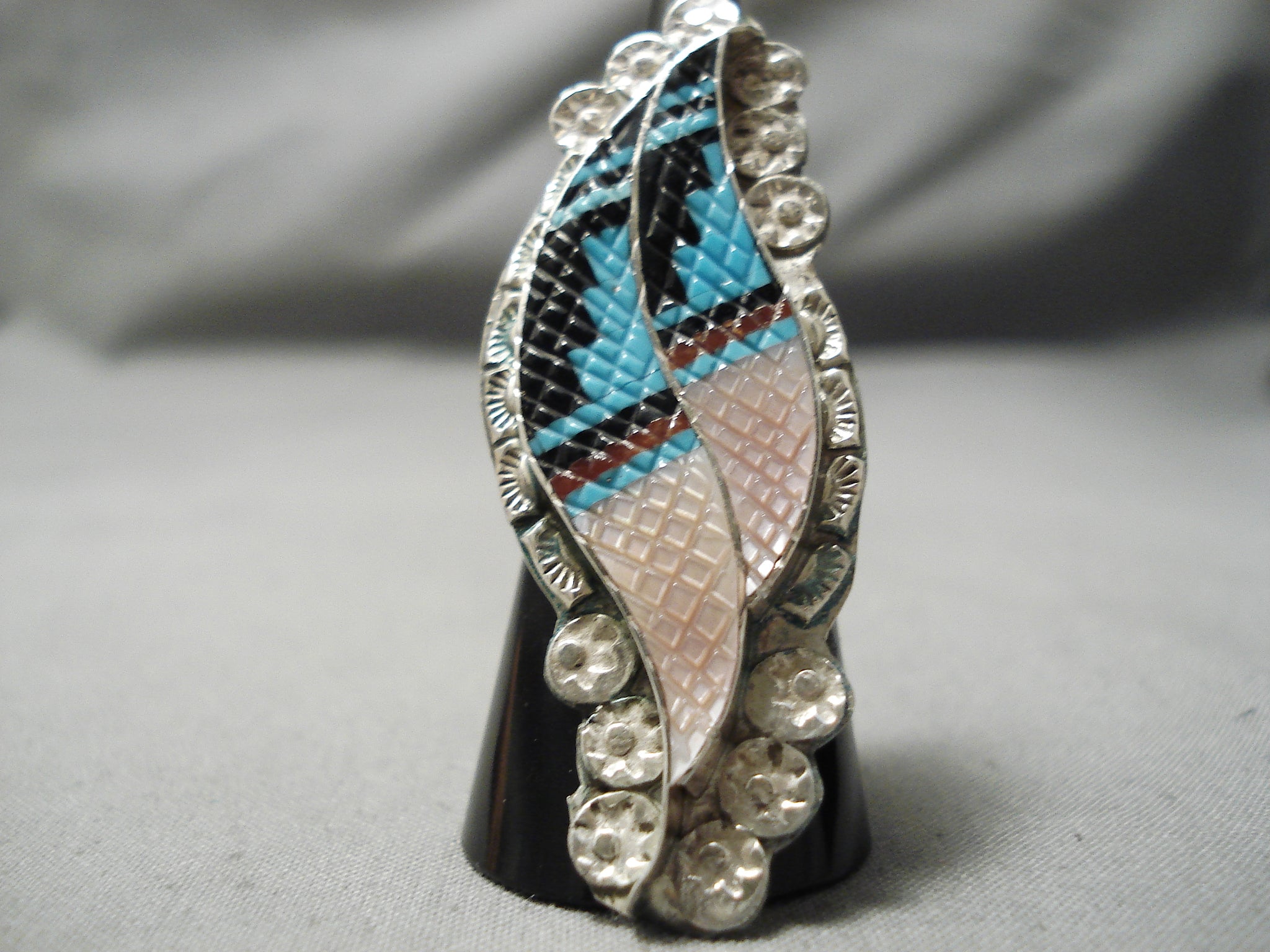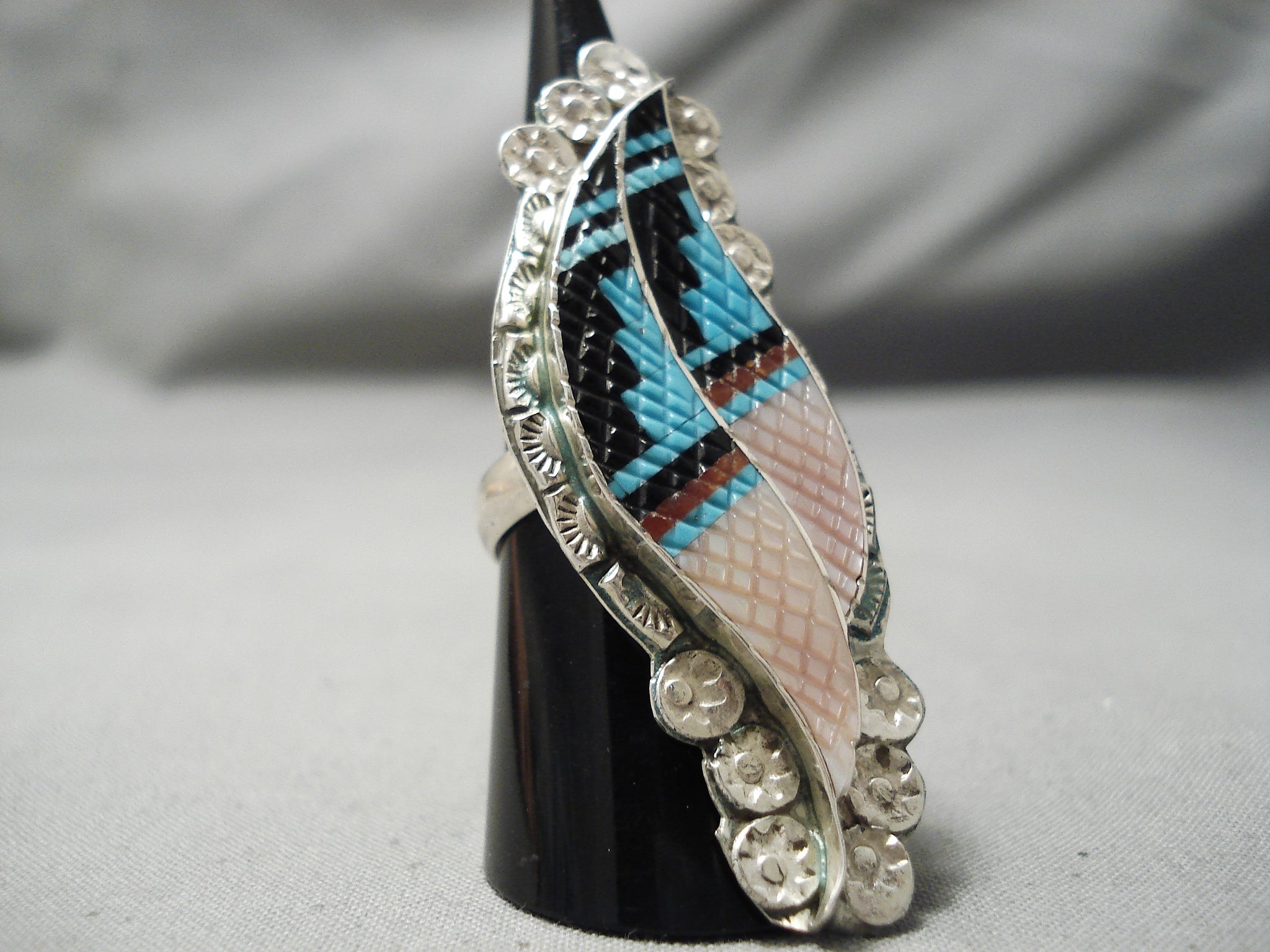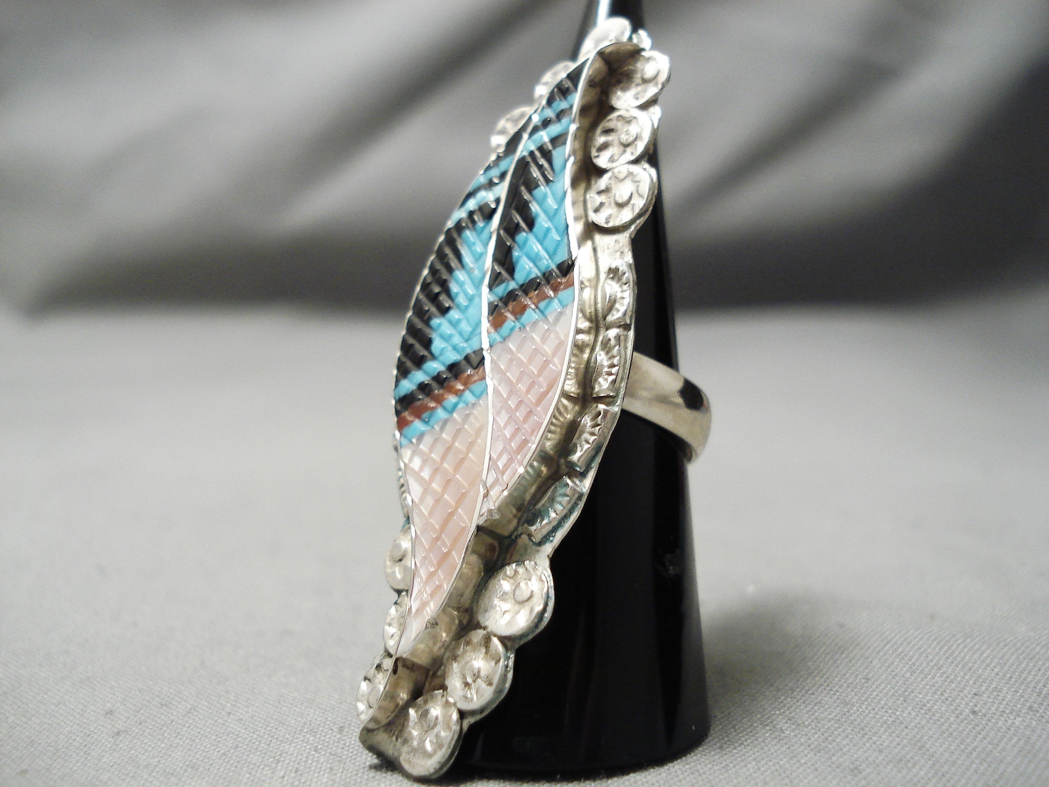 Amazing Hand Carved Zuni Native American Turquoise Sterling Silver Coral Ring