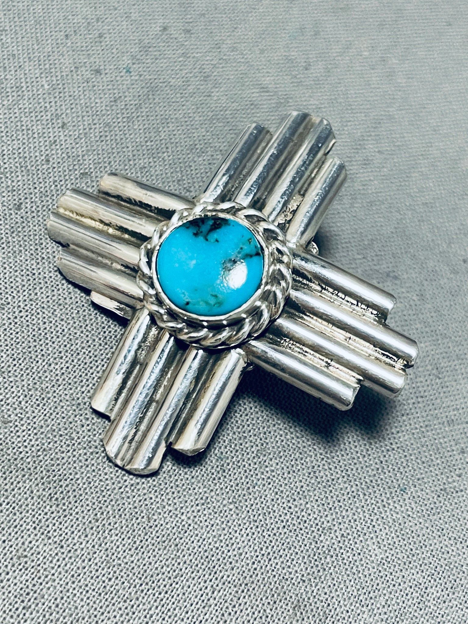 We are proud to offer this magnificent vintage Navajo silver tie pin. Welcome to New Mexico - or at least to the shape of the symbol of the state flag! Yes, this marvelous tie pin is in the shape of the iconic Zia symbol, which is loaded with wonderful symbolisms! And at the center of this thick pin is the stunning Blue Diamond turquoise stone! Located in central Nevada, the Blue Diamond turquoise mine hosts some of the hardest turquoise produced. The turquoise from this mine, like diamonds, is both hard and beautiful - hence, the Name! This turquoise features a dark smokey matrix encompassed by a brilliant blue. A Really Nice Piece! The center stone measures around 3/8" x 3/8". Sterling silver, marked. Signed by Navajo artist, Robert Yellowhorse. The pin measures around 1-1/2" x 1-1/2". Sturdy 12 grams.