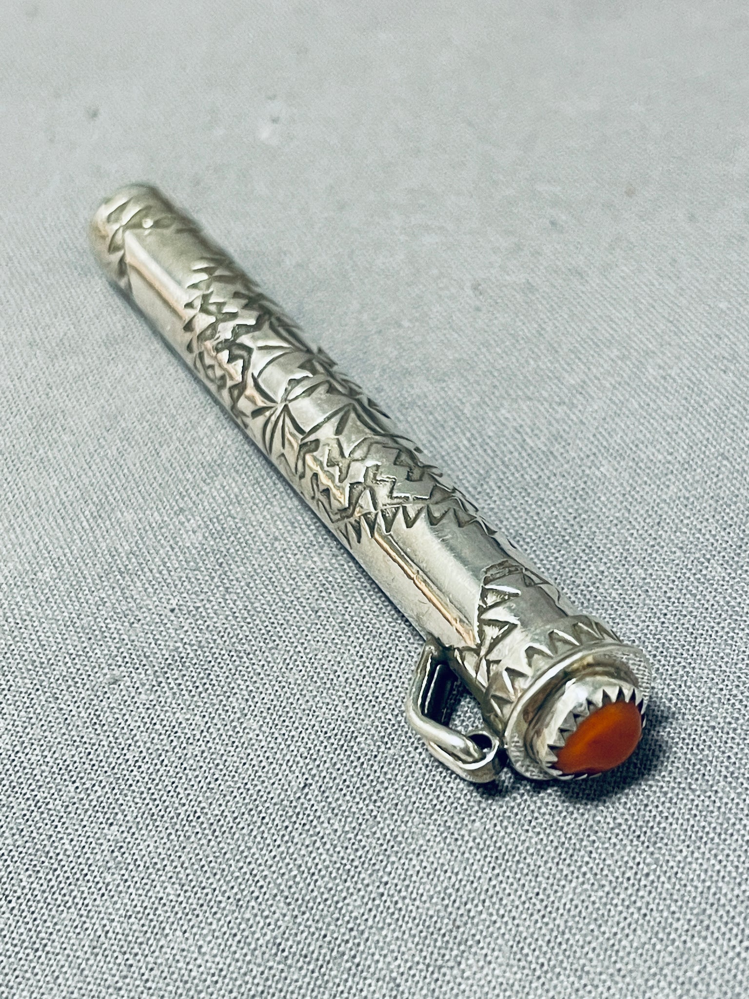 Amazing Native American Navajo Coral Sterling Silver Toothpick Holder Signed