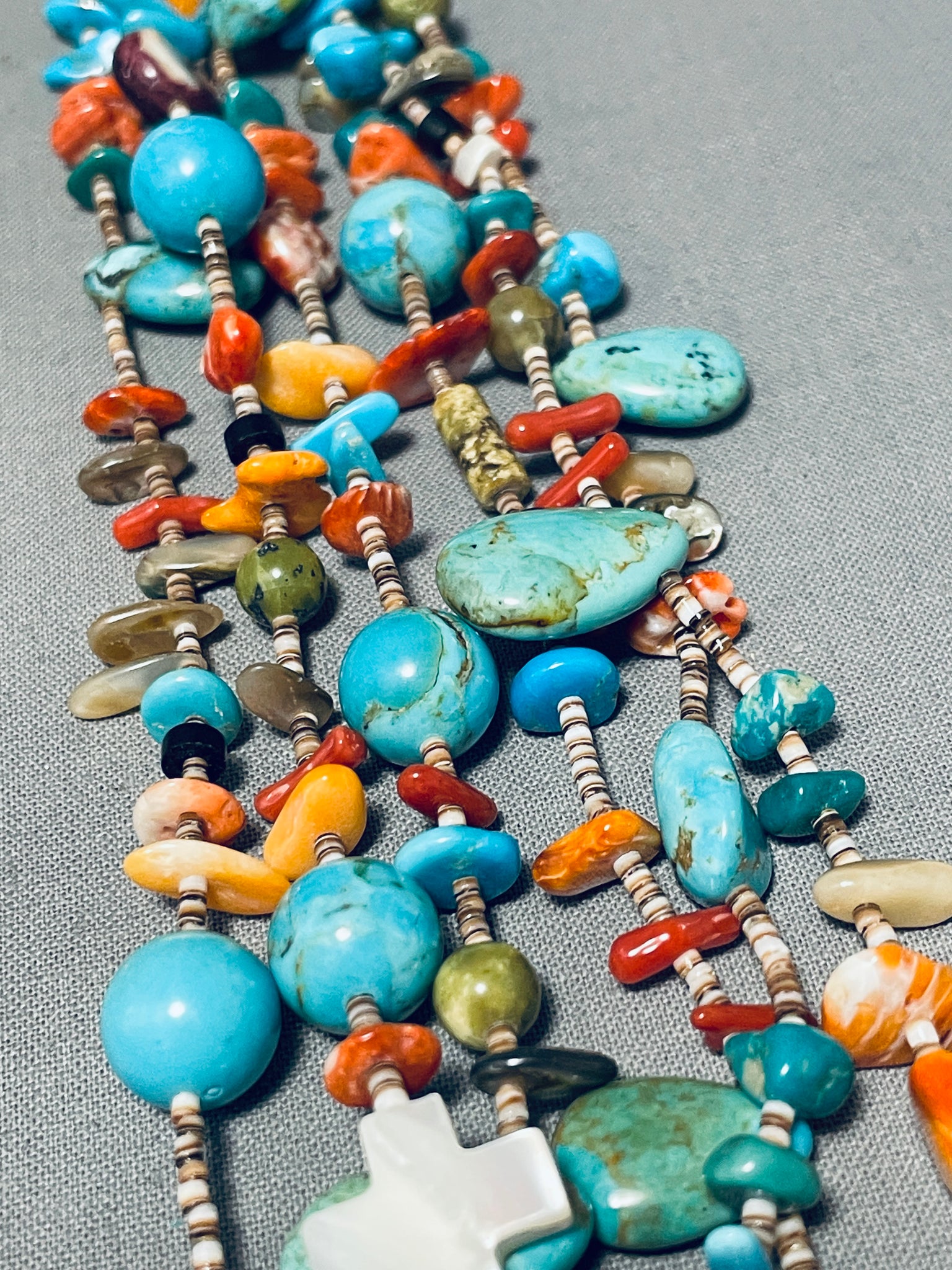 Amazing Native American Navajo Turquoise Coral Spiny 6 Strand Silver Treasure Necklace