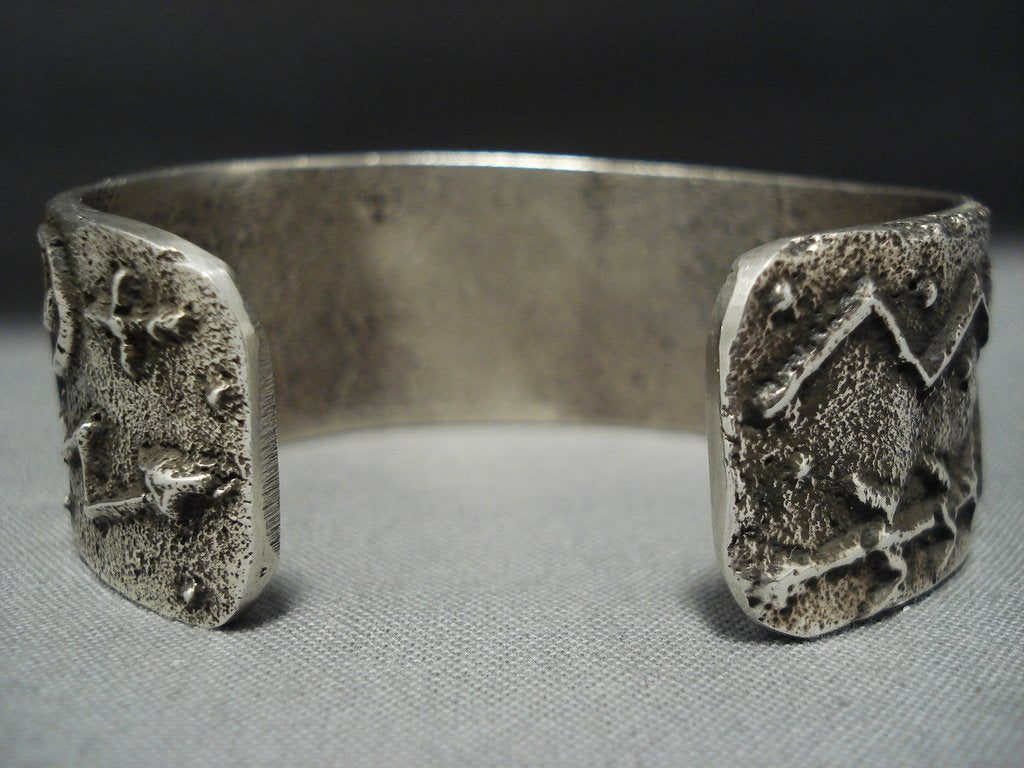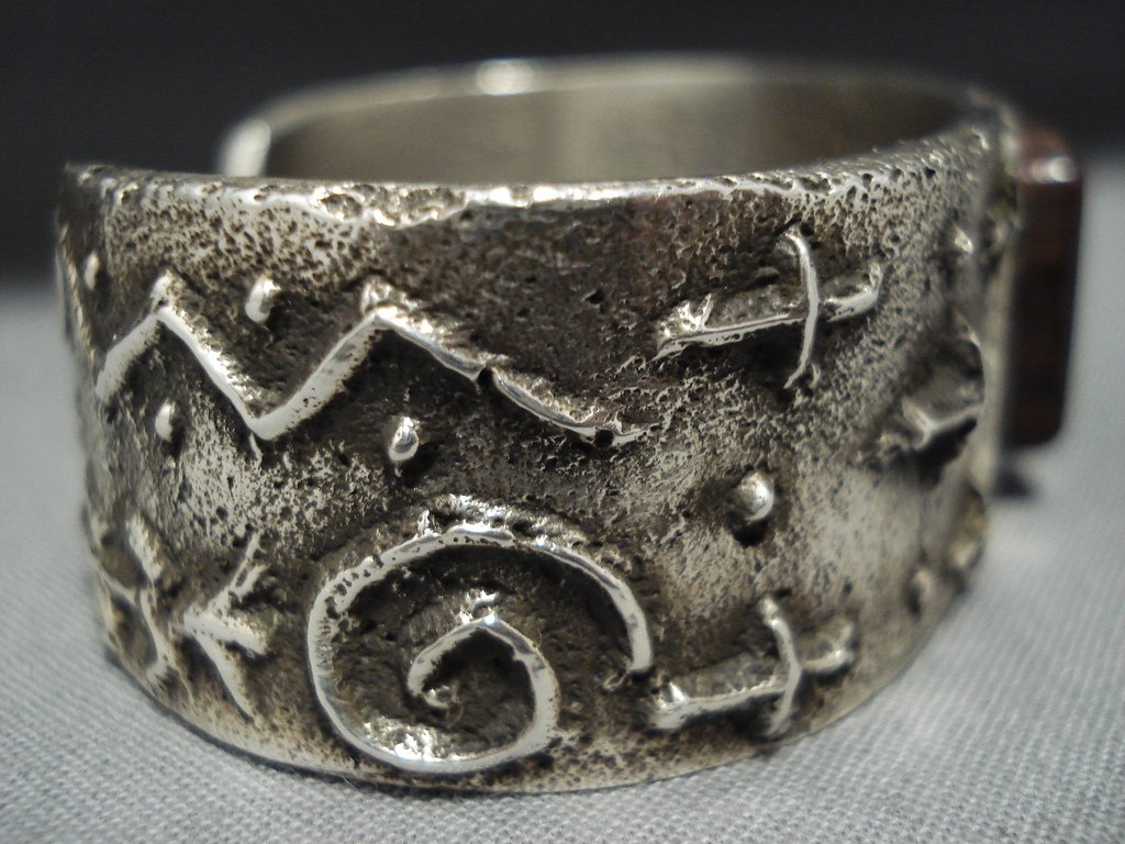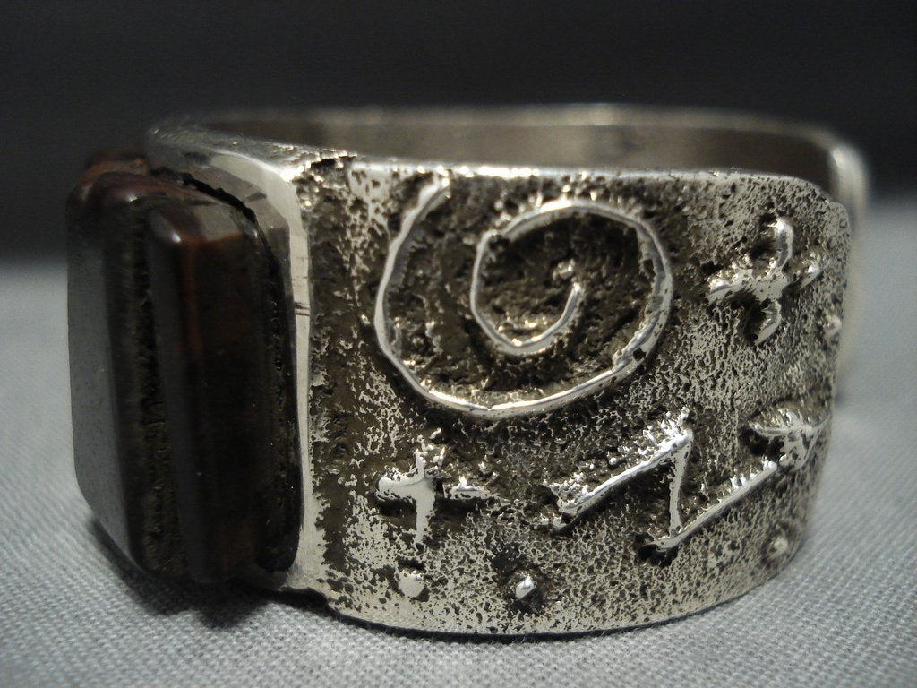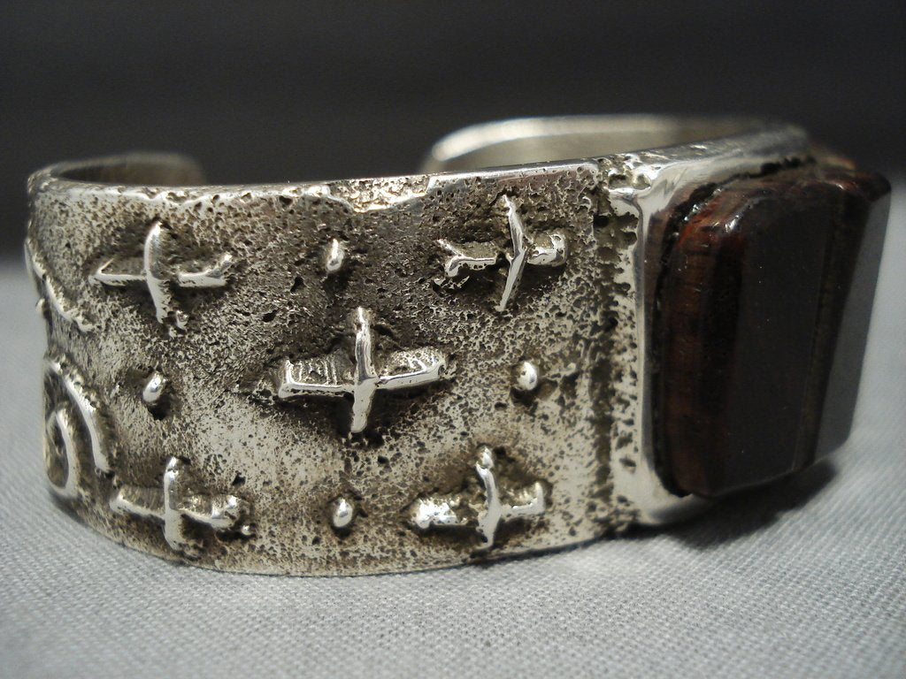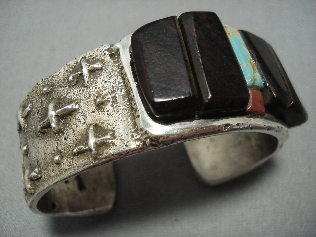 Here we have an amazing Navajo Native American jewelry silver bracelet having an off center row of ironwood stones, turquoise and coral, on a handcarved solid silver cuff with a textured silver surface and handcarved silver crosses, silver swirls and silver cornstalk designs! Very Unique! Large ironwood stone measures about 5/8" x 1/2". Turquoise measures around 1/2" x 1/8". Coral measures about 1/4" x 1/8". The width of the bracelet measures around 3/4". Signed by Navajo Native American jewelry artist, Stu Billie. Sterling silver, marked. The inside end to end measures around 5" with an additional 7/8" gap. Sturdy 69 grams.