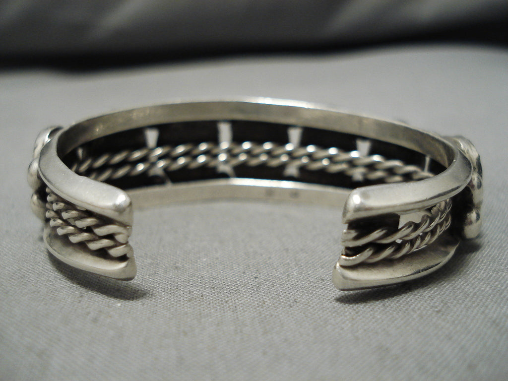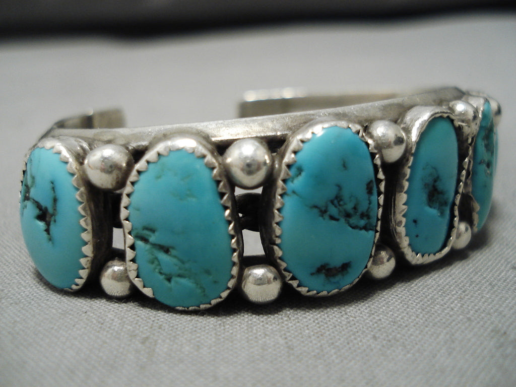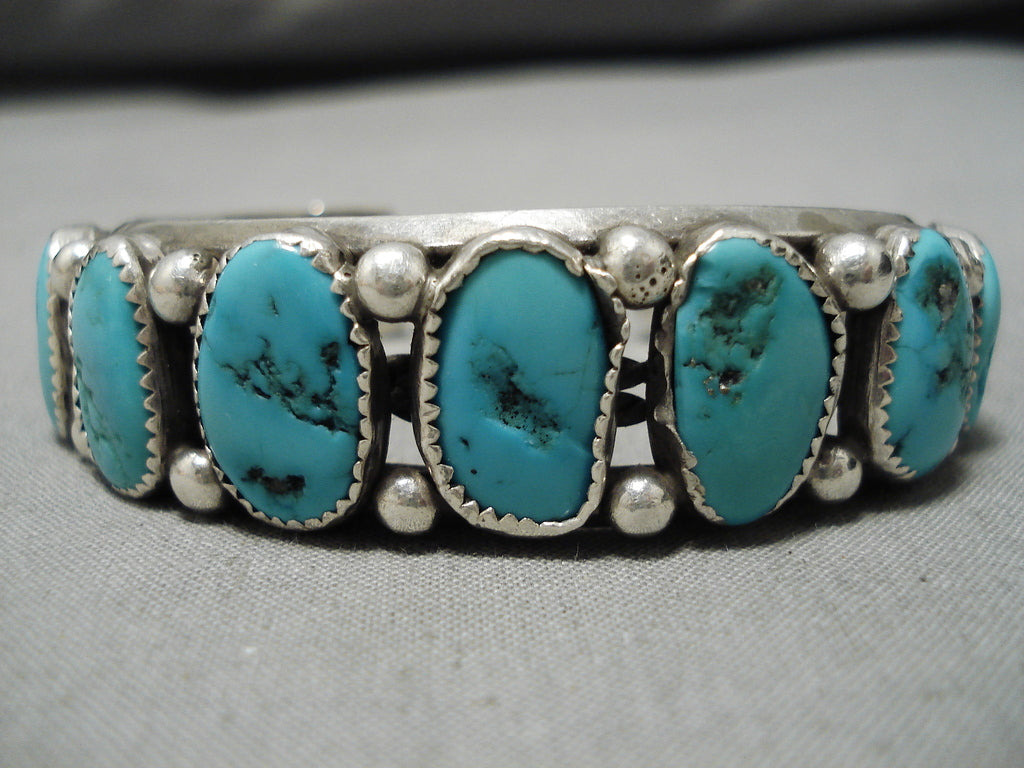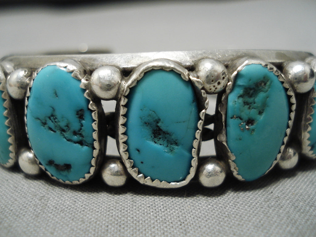 This is a magnificent Navajo turquoise row silver bracelet. This outstanding piece contains 7 very old blue turquoise stones. Surrounding the stones are wonderful large silver raindrops. This bracelet consists of a superior quadruple silver shank cuff with the two center ones being hand twisted. This bracelet is very thick and sturdy. The center stone measures around 1/2" x 3/8". The width of the bracelet measures around 3/4". Signed by Navajo artist, Rue Rose . Sterling silver. Cir. 1970's+. The inside end to end measures around 5" with an additional 3/4" gap. Sturdy 41 grams.