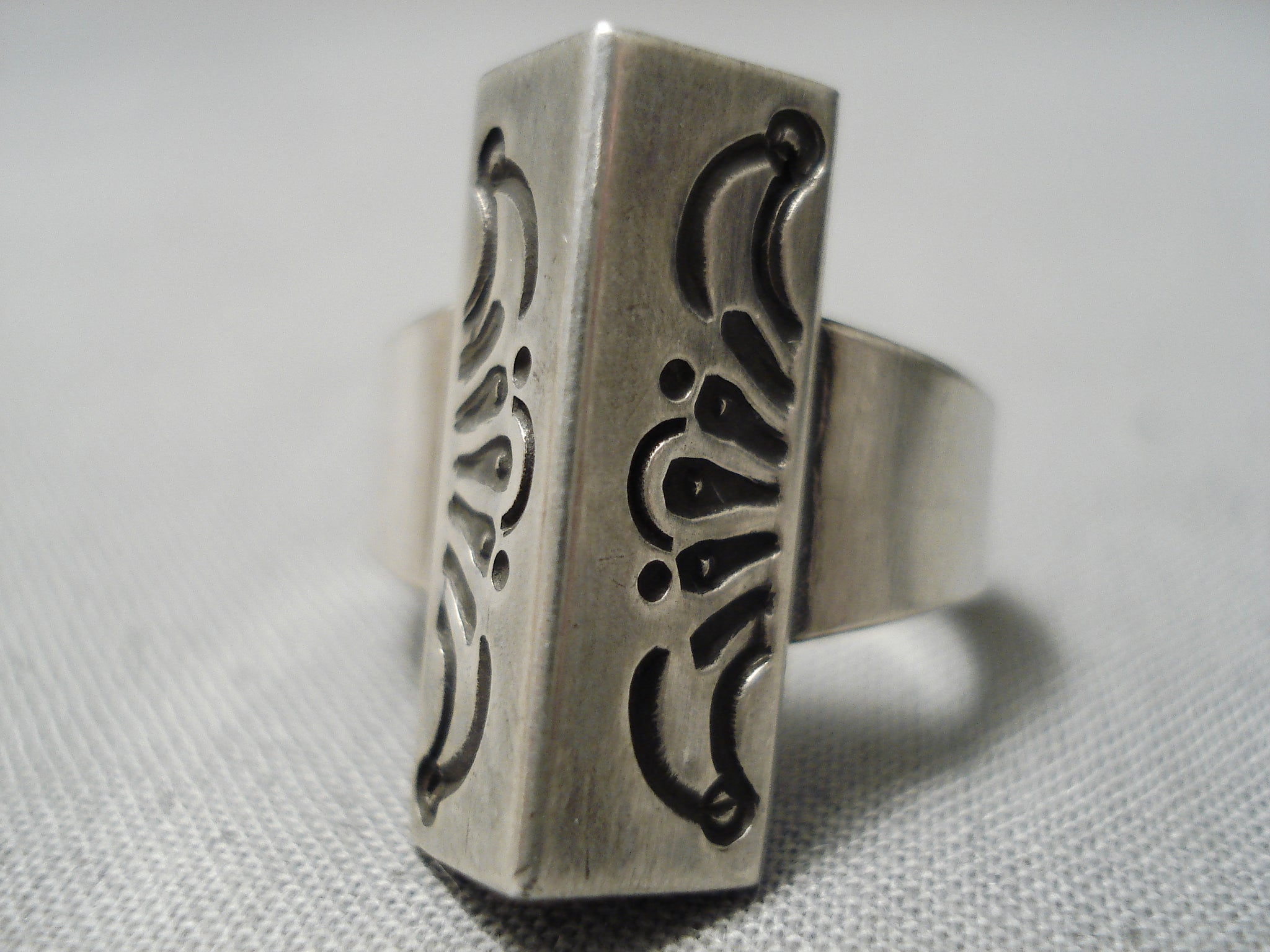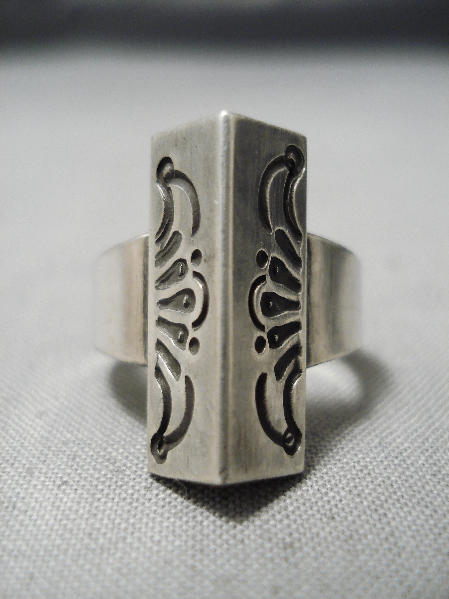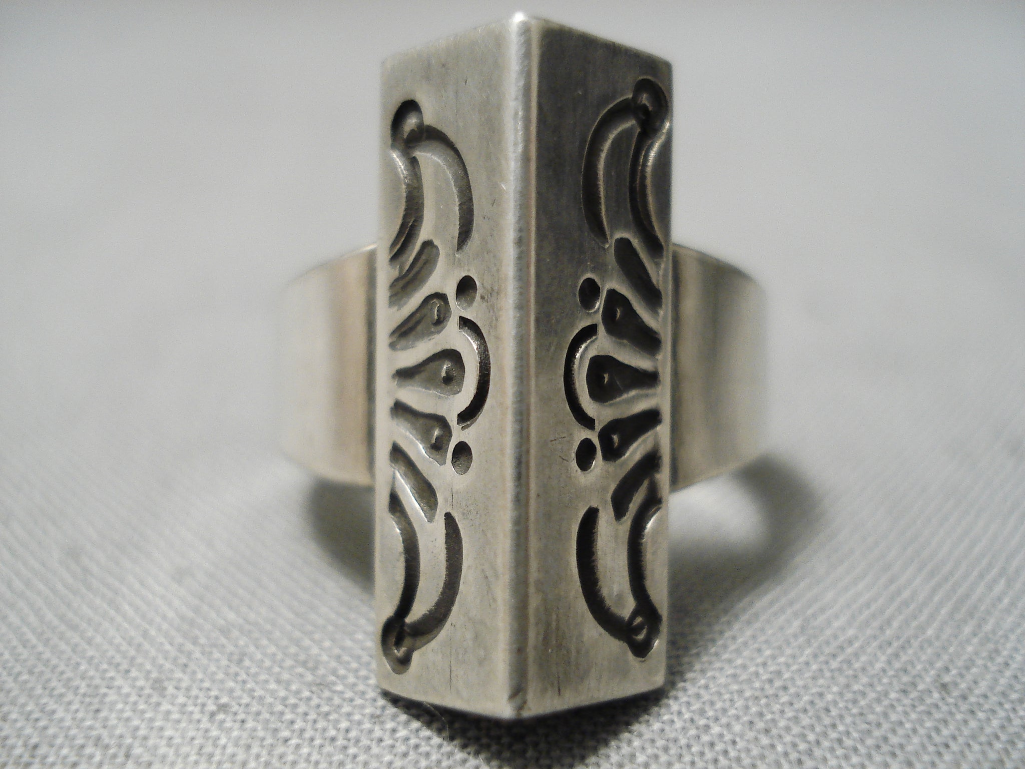 A tremendous vintage Navajo silver ring. Vertically set across the band of this ring is the cool dimensional ¾” long handstamped triangular prism! The ring face measures around 3/4" x 3/4". Signed by Navajo artist, Edison Sandy Smith. The ring size is around 6-1/2. Sterling silver, marked. Sturdy 12 grams.