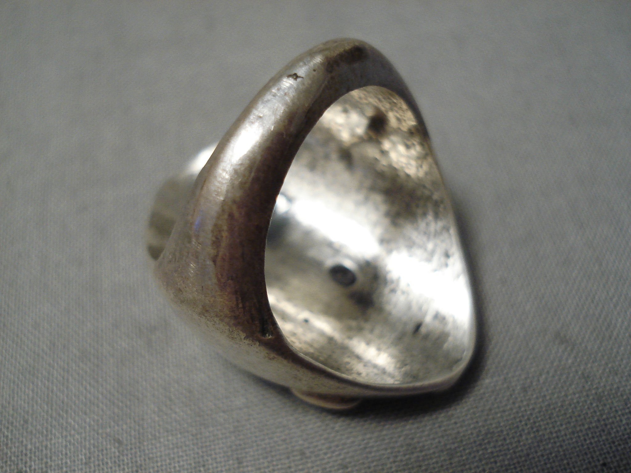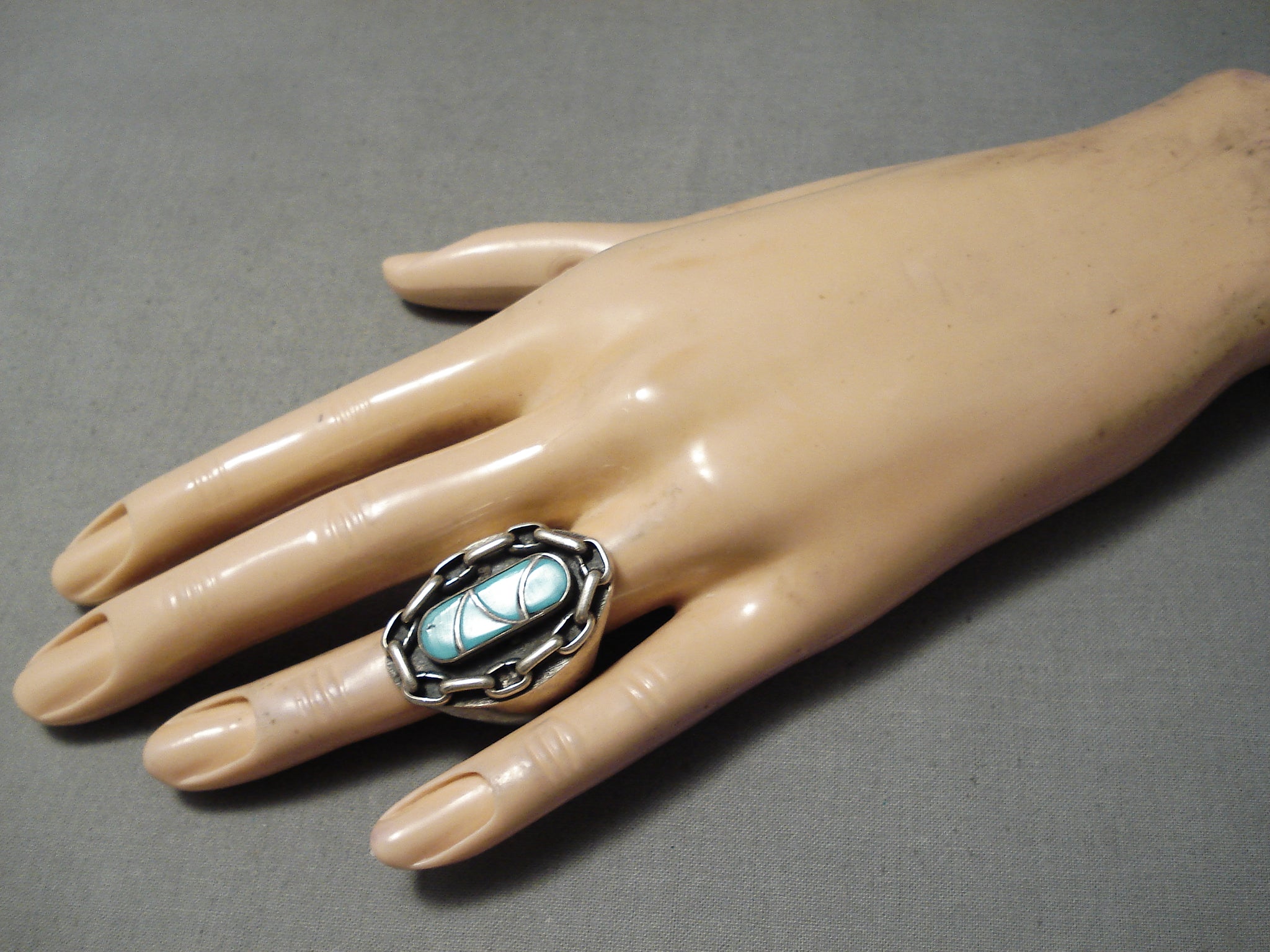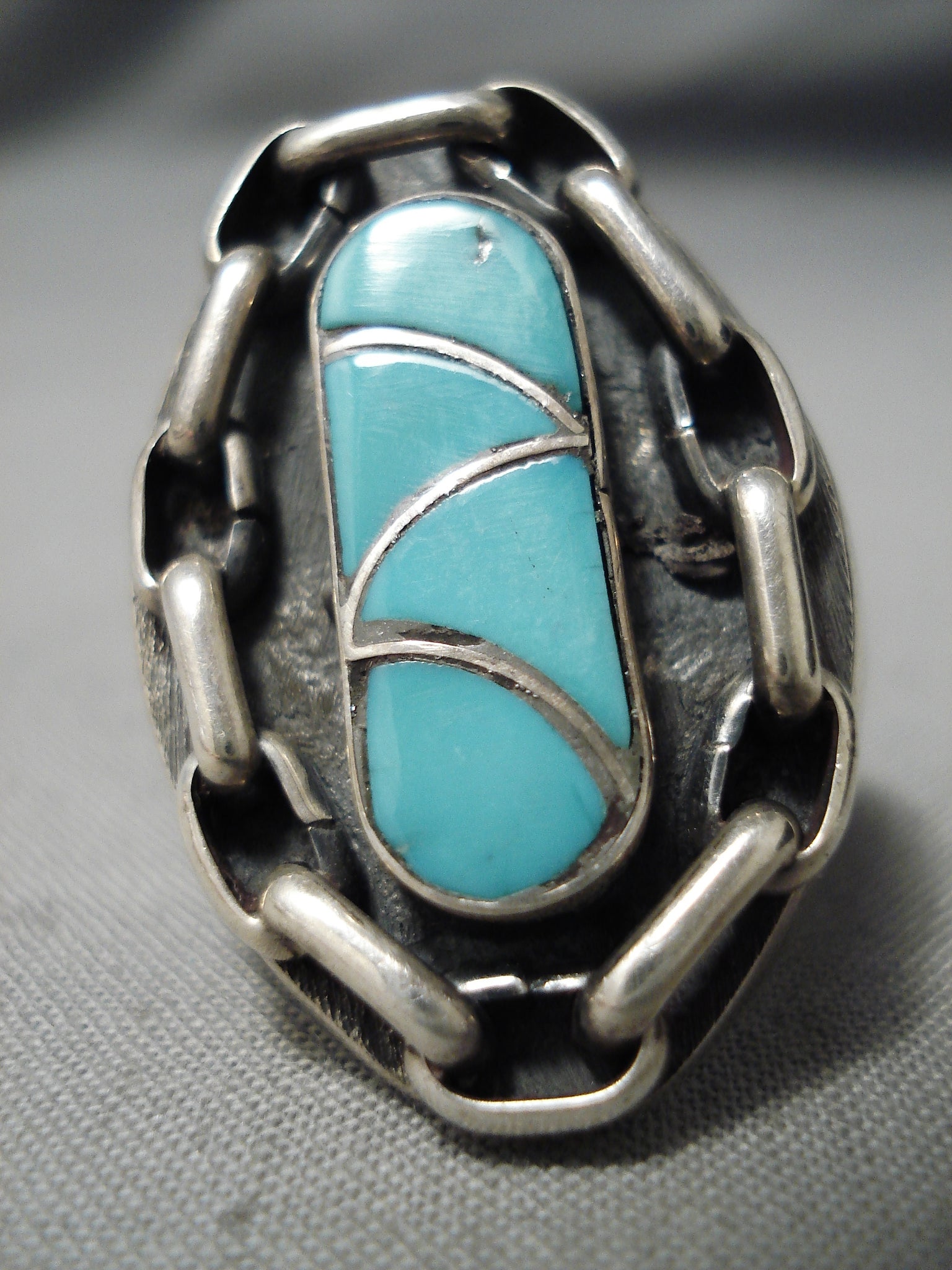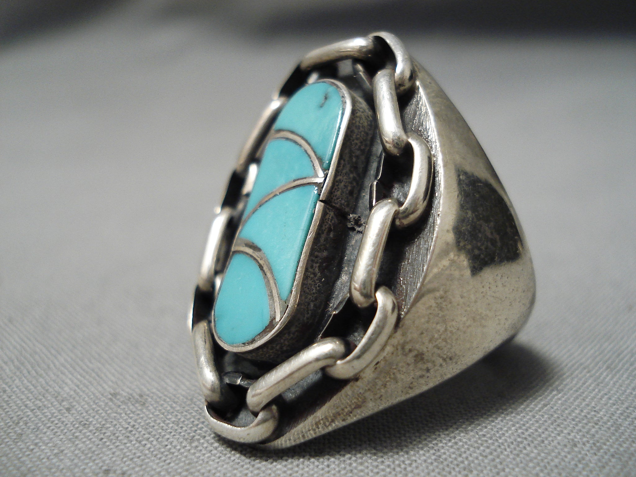 Amazing Vintage Huge Native American Navajo Turquoise Inlay Sterling Silver Chain Ring Heavy
