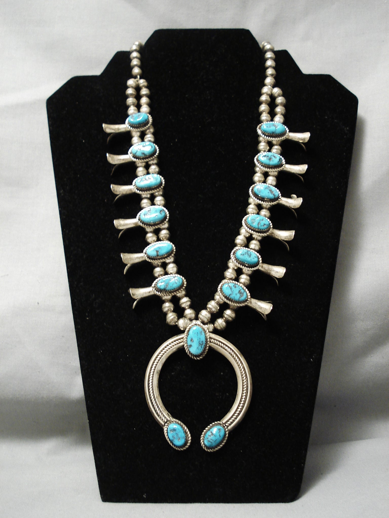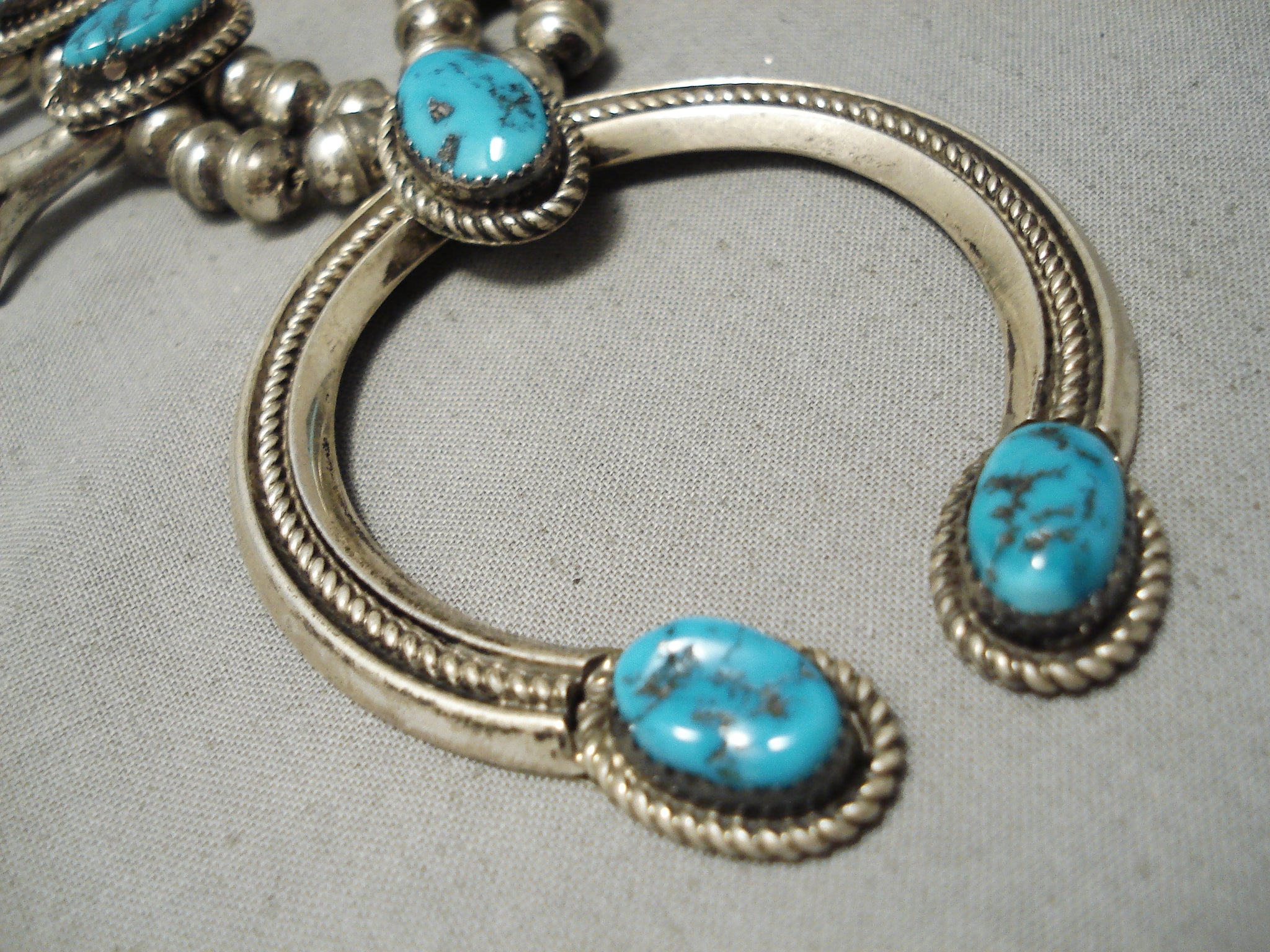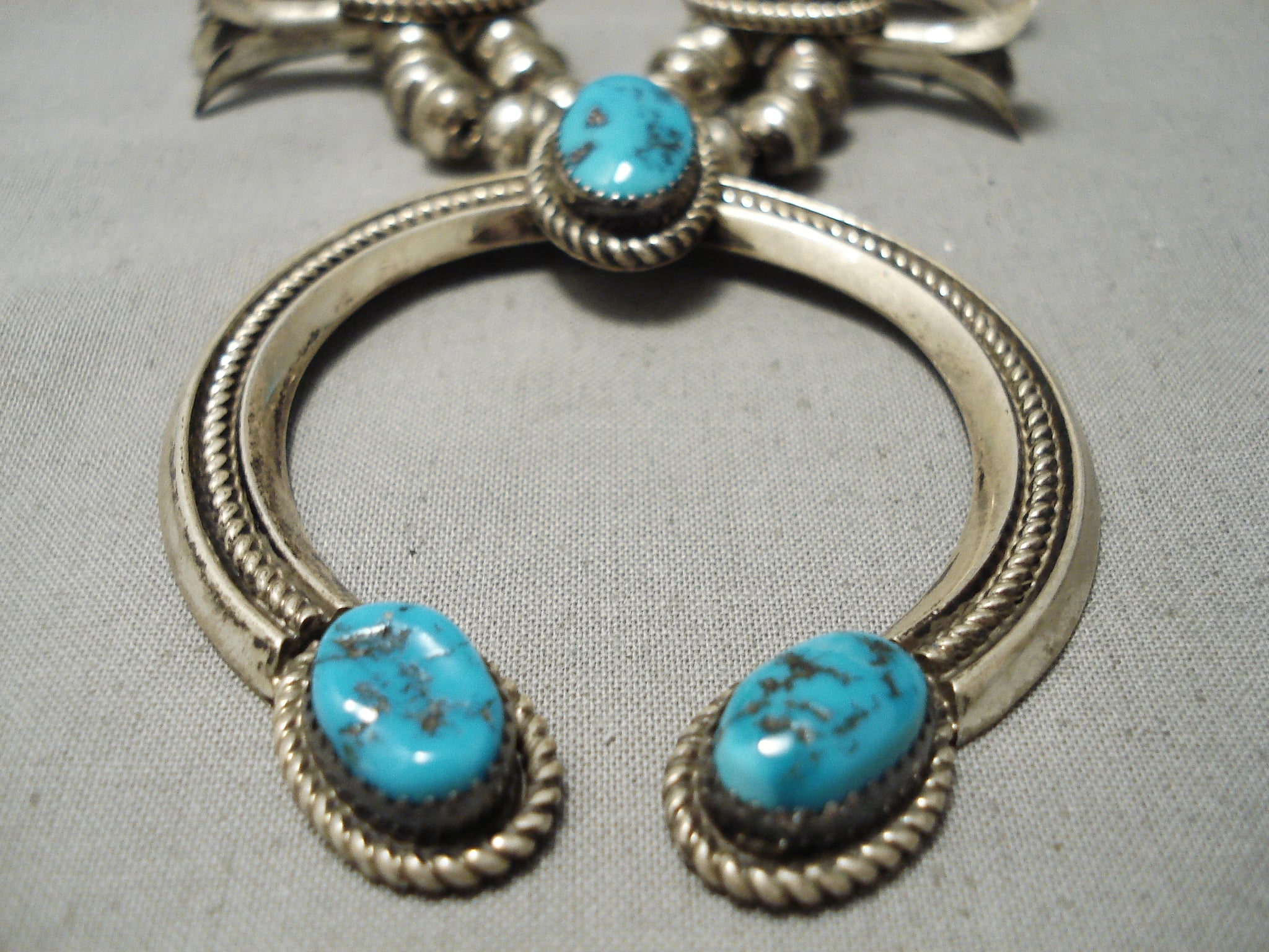 Amazing Vintage Native American Navajo Blue Turquoise Sterling Silver Squash Blossom Necklace