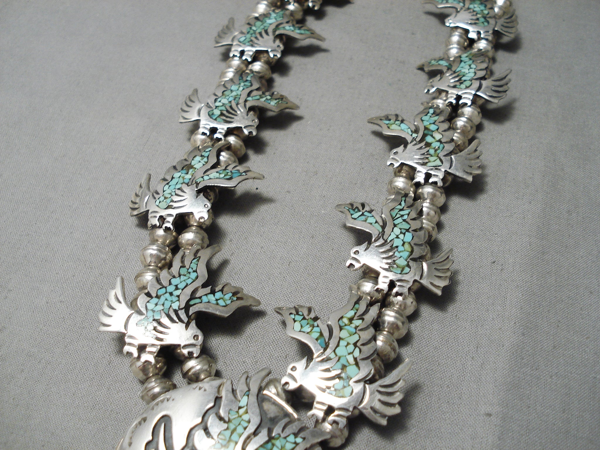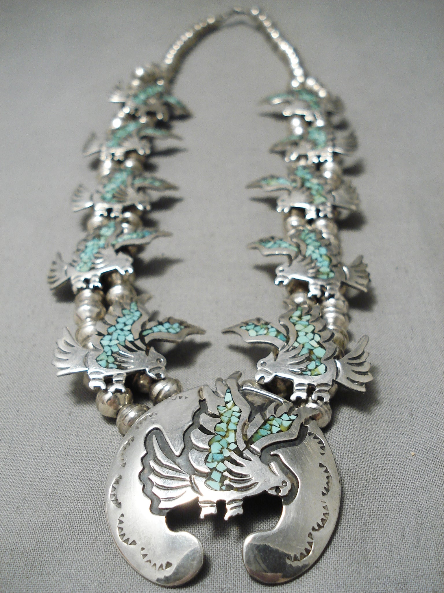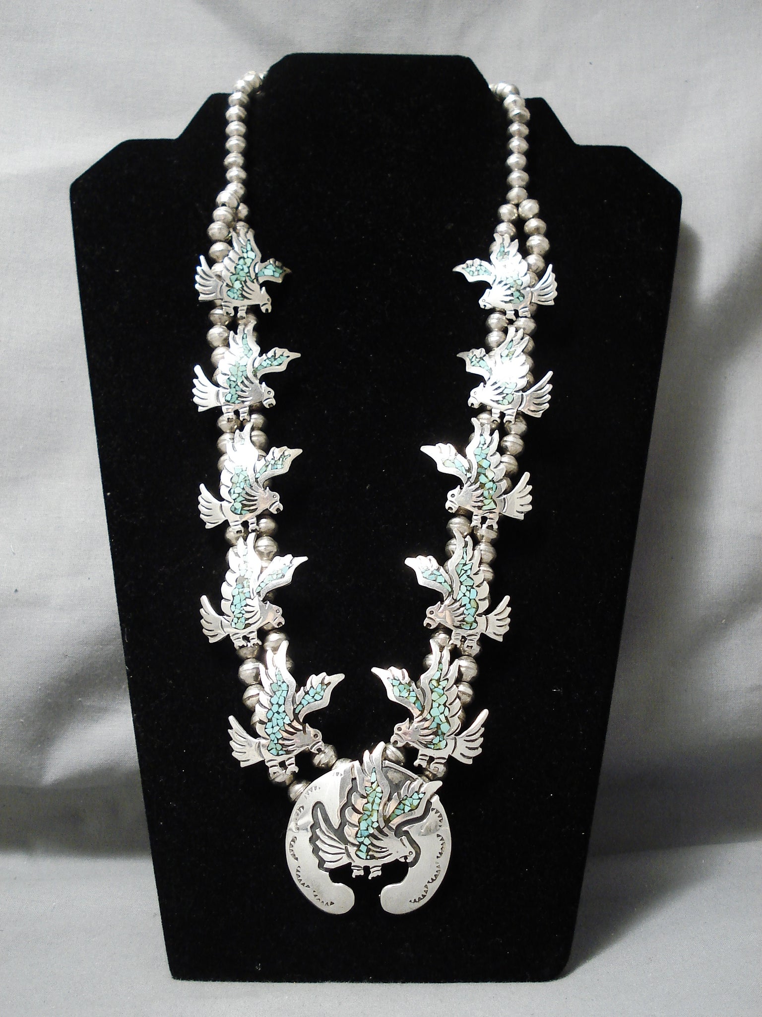 Amazing Vintage Native American Navajo Green Turquoise Sterling Silver Squash Blossom Necklace