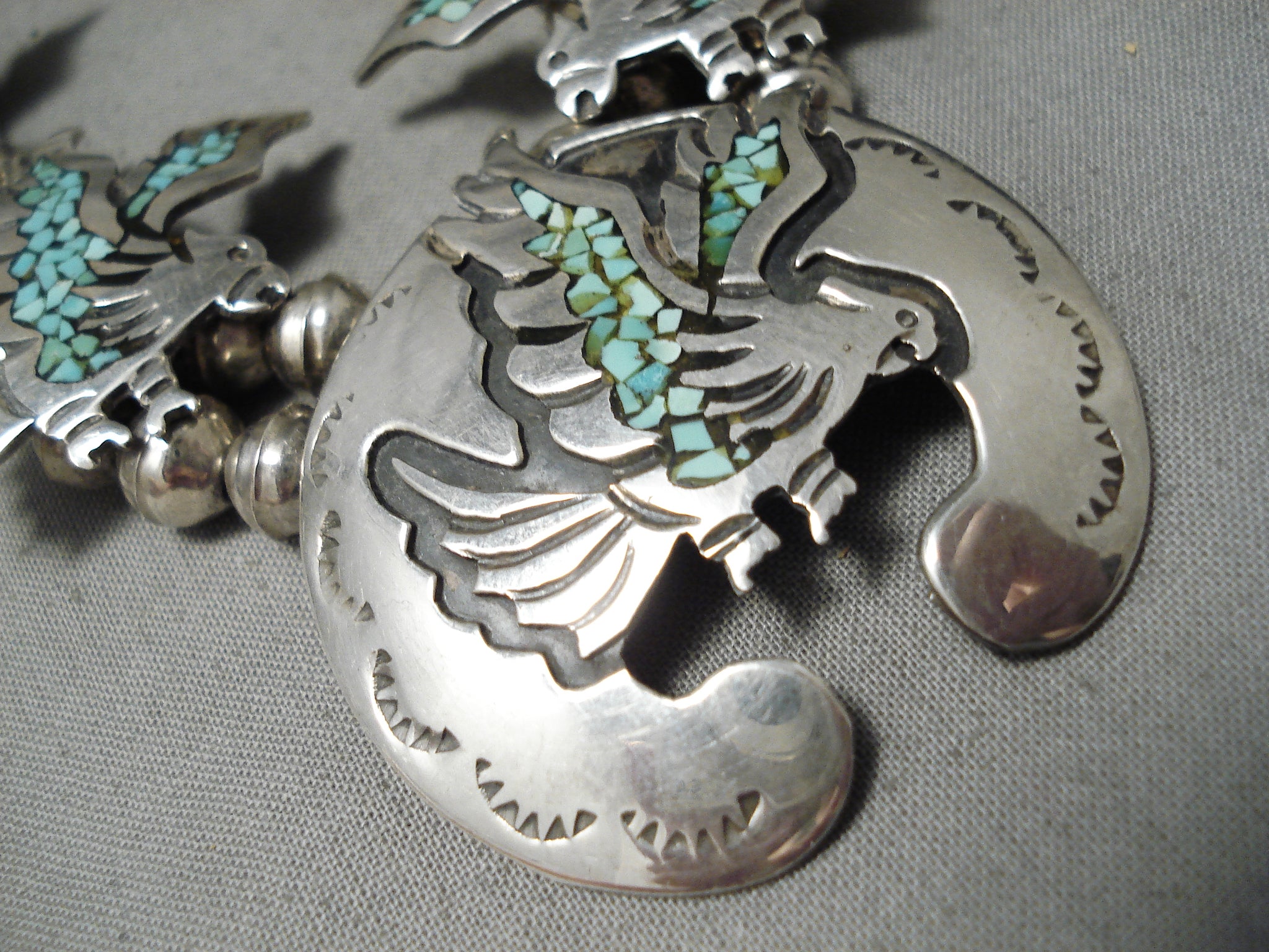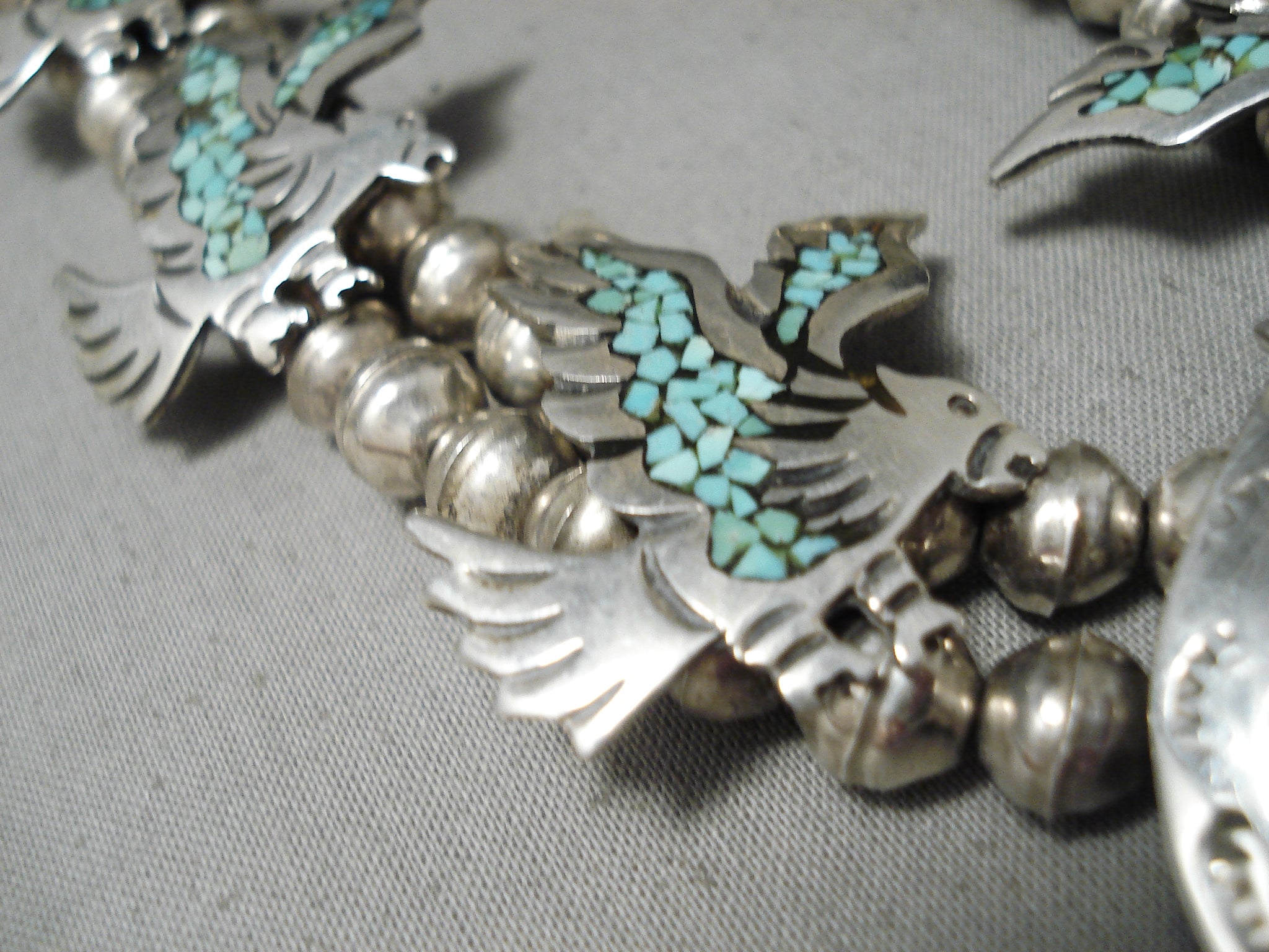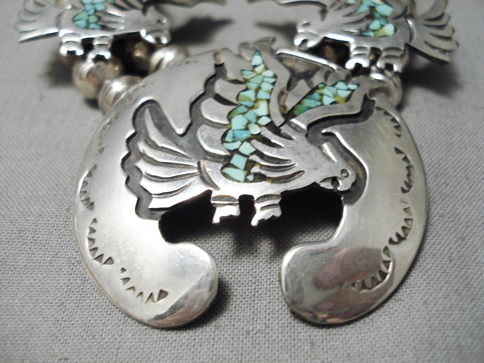 Amazing Vintage Native American Navajo Green Turquoise Sterling Silver Squash Blossom Necklace