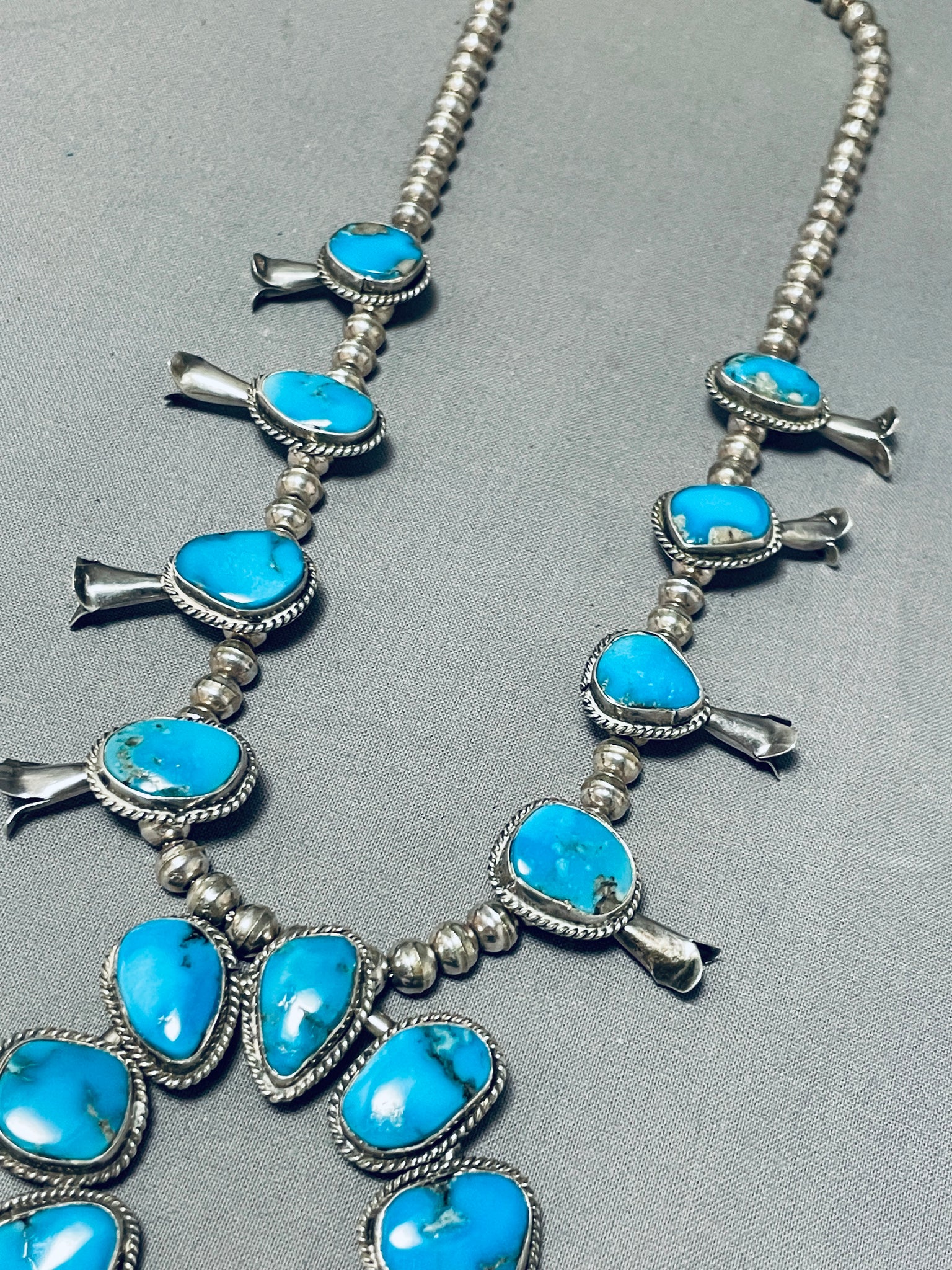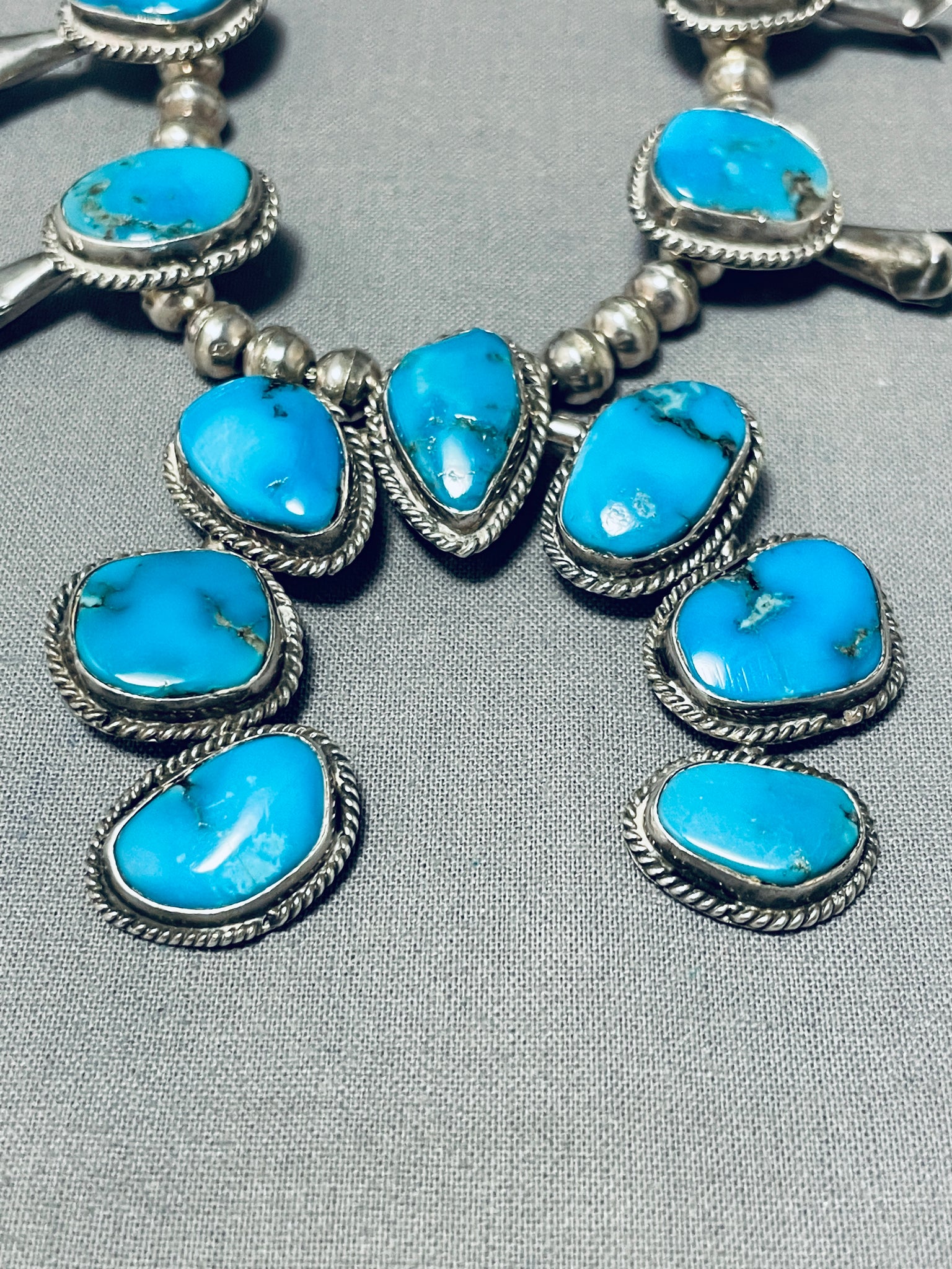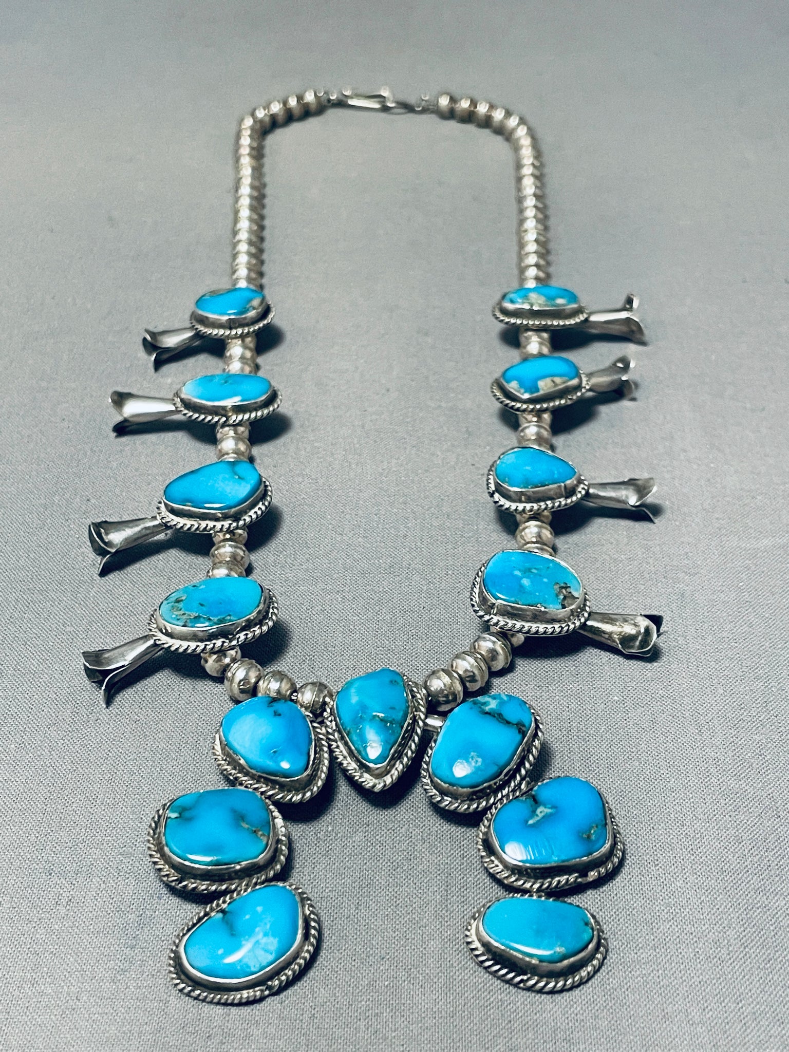 Amazing Vintage Native American Navajo Kingman Turquoise Sterling Silver Squash Blossom Necklace
