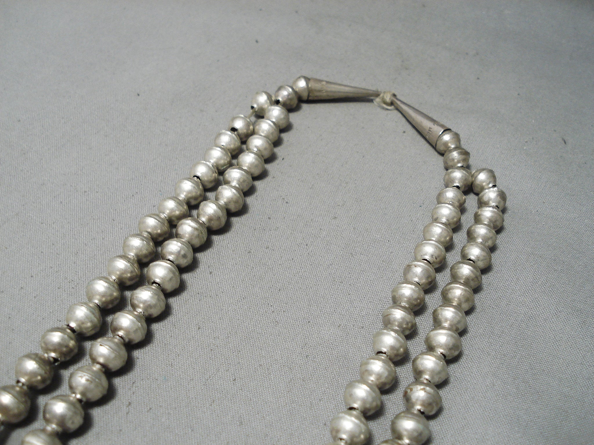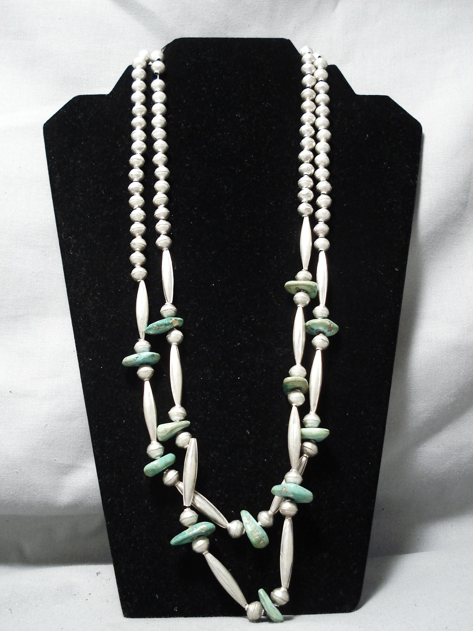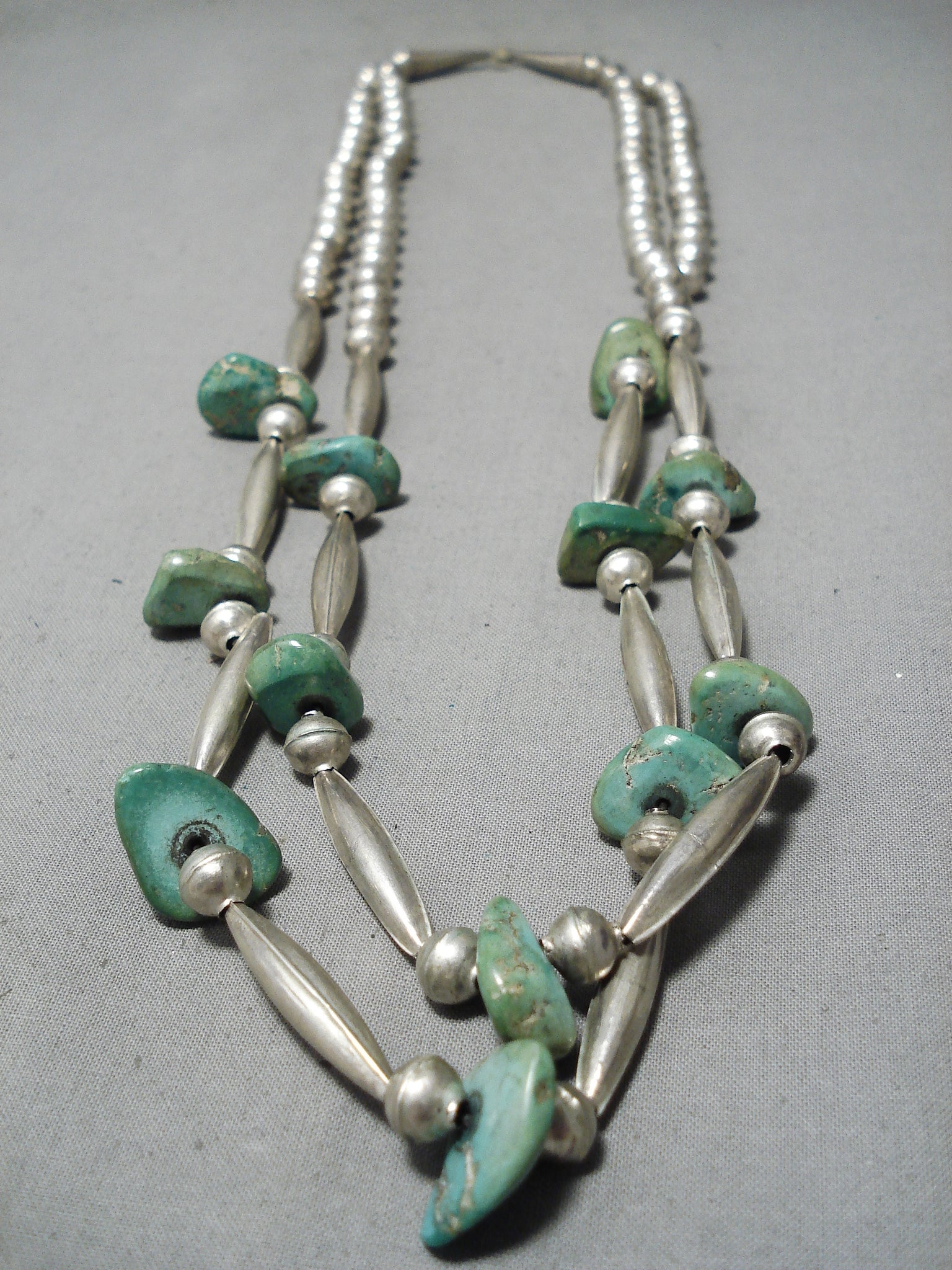 Up for sale is this remarkable vintage Navajo silver necklace. This is a wonderful 2-strand necklace of Royston turquoise, silver beads, 1-1/8” silver spindles – marvelously arranged! The largest of turquoise is about ¾” x 5/8”. Sterling silver. The length of the necklace measures around 28". Sturdy 76 grams. Cir. Mid Century.