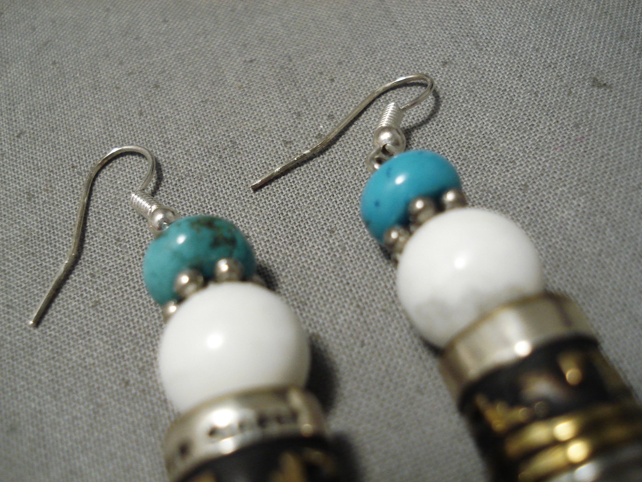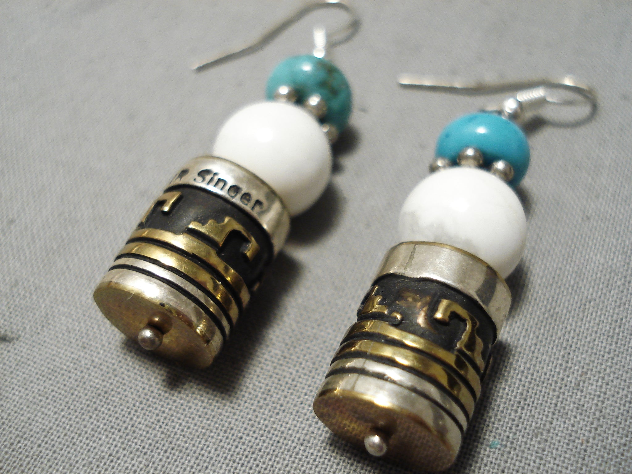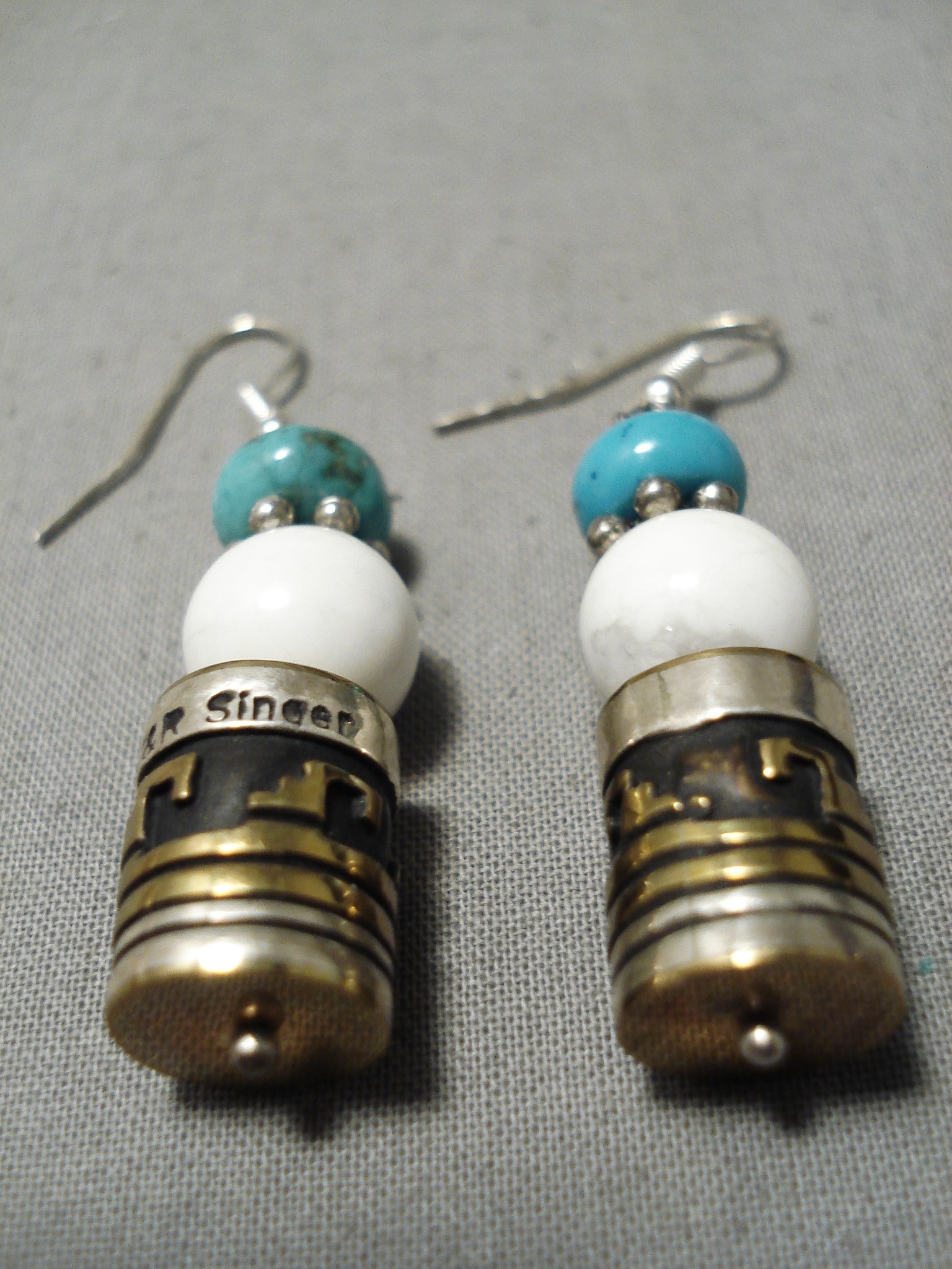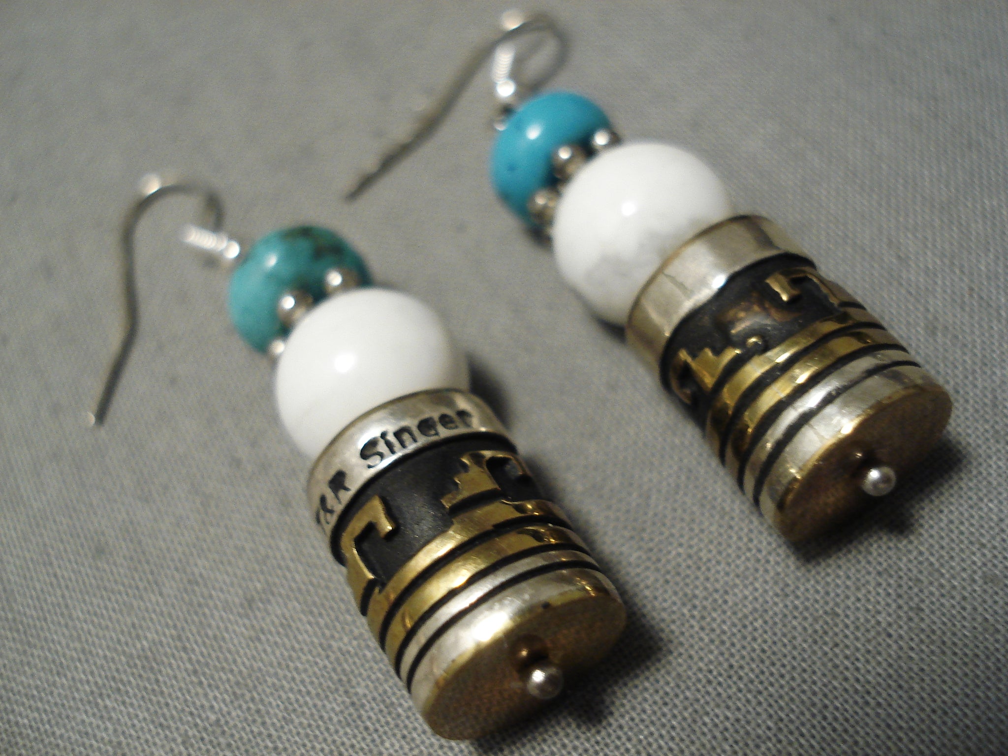 This is a striking vintage Navajo pair of Rose Singer silver and gold earrings. These earrings are very rare as they were handmade by the famous artist Thoms Singers wife, Rose Singer. Located on each earring is a wonderful turquoise stone, silver flower bead and white stone with a beautiful silver and gold drum bead. Each earring measures around 1-1/4" X 3/8". Each drum bead on the earrings contain amazing geometric patterns and line segments. Sterling silver. Signed by Navajo artist, T & R Singer . Cir. 1970's+. The earrings weigh around 12 grams.