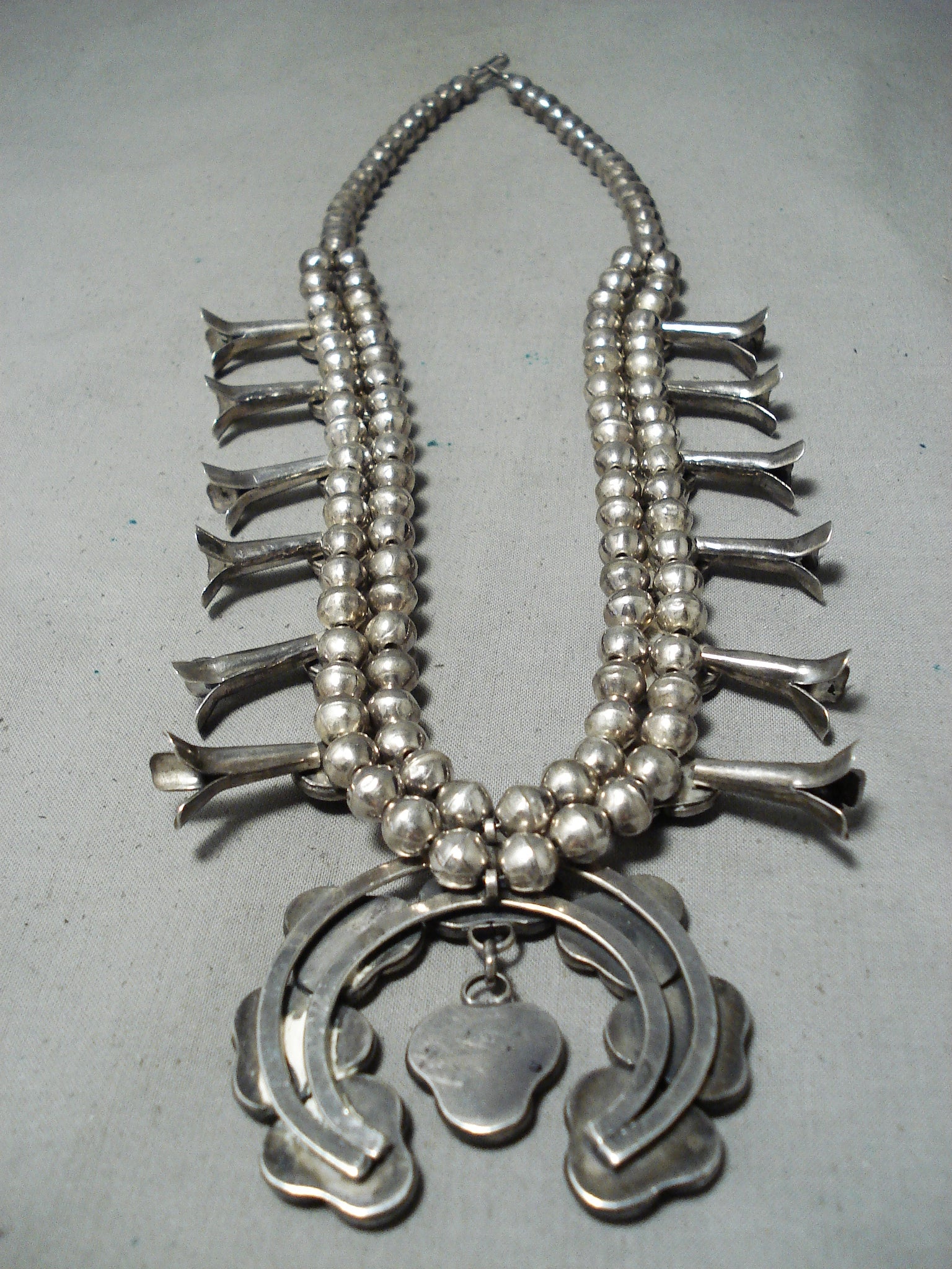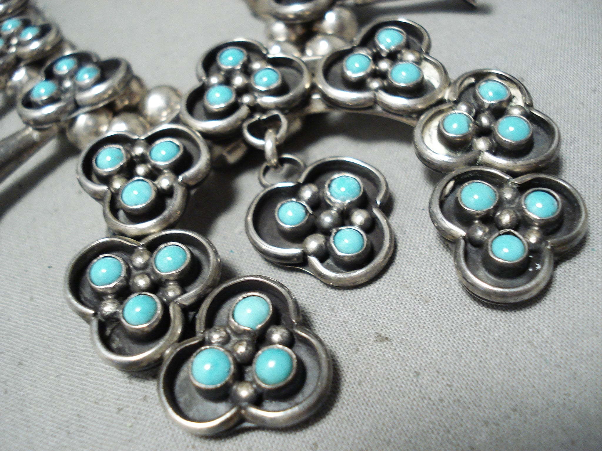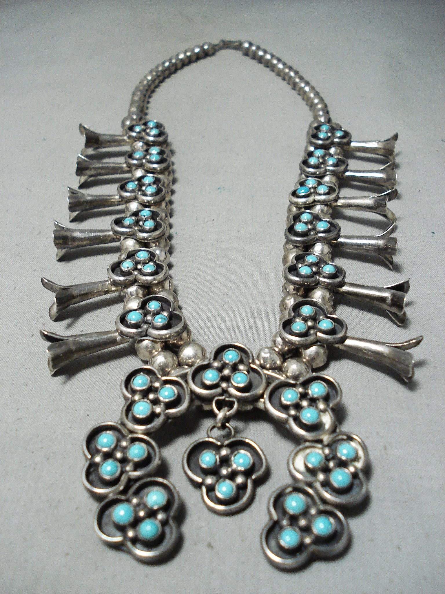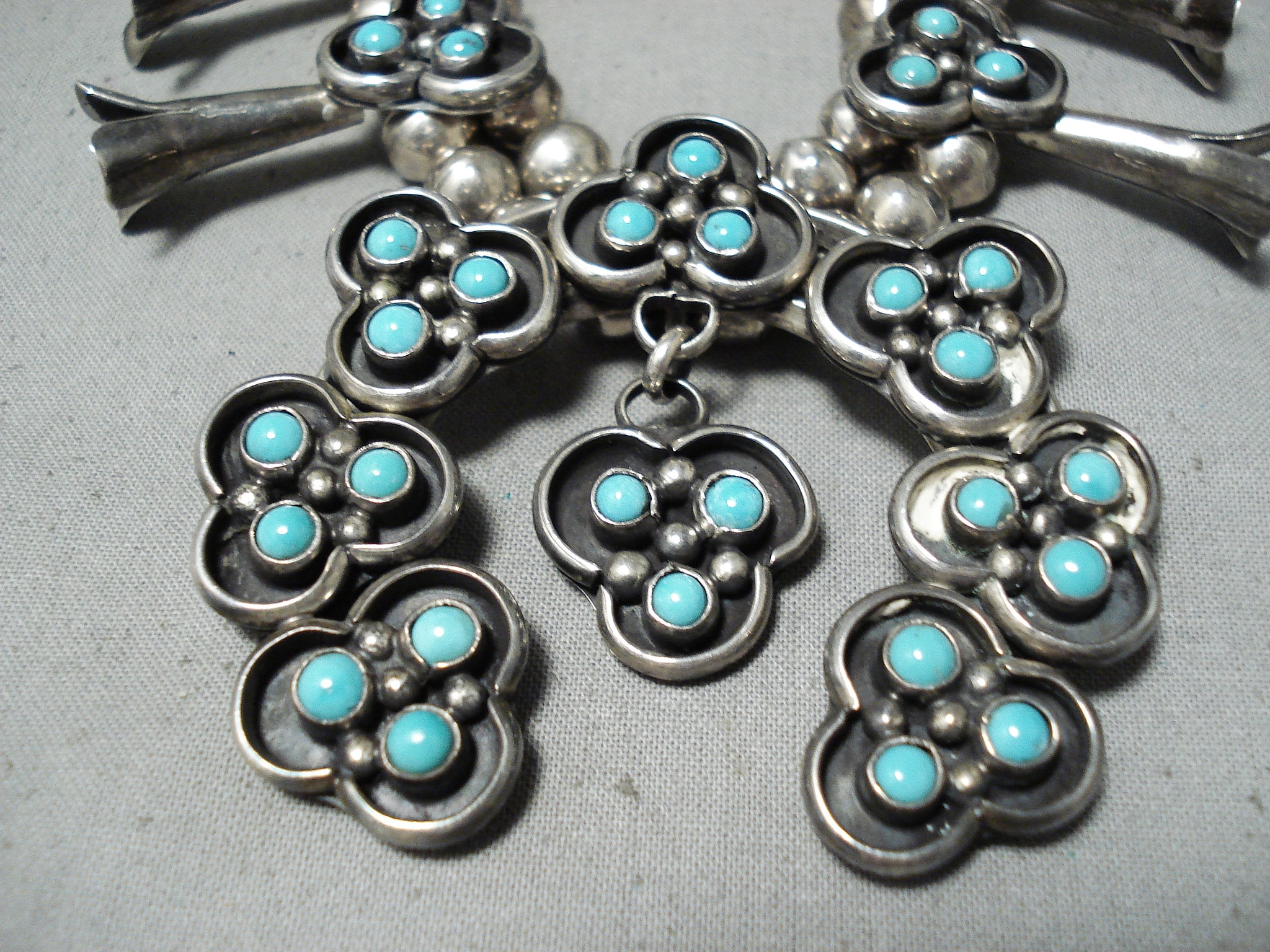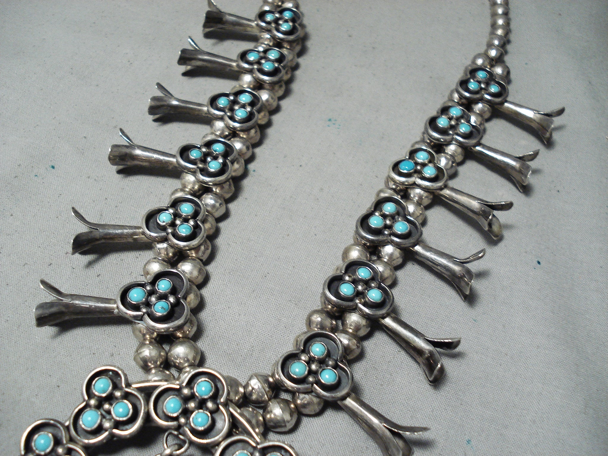 Amazing Vintage Native American Navajo Snake Turquoise Sterling Silver Squash Blossom Necklace