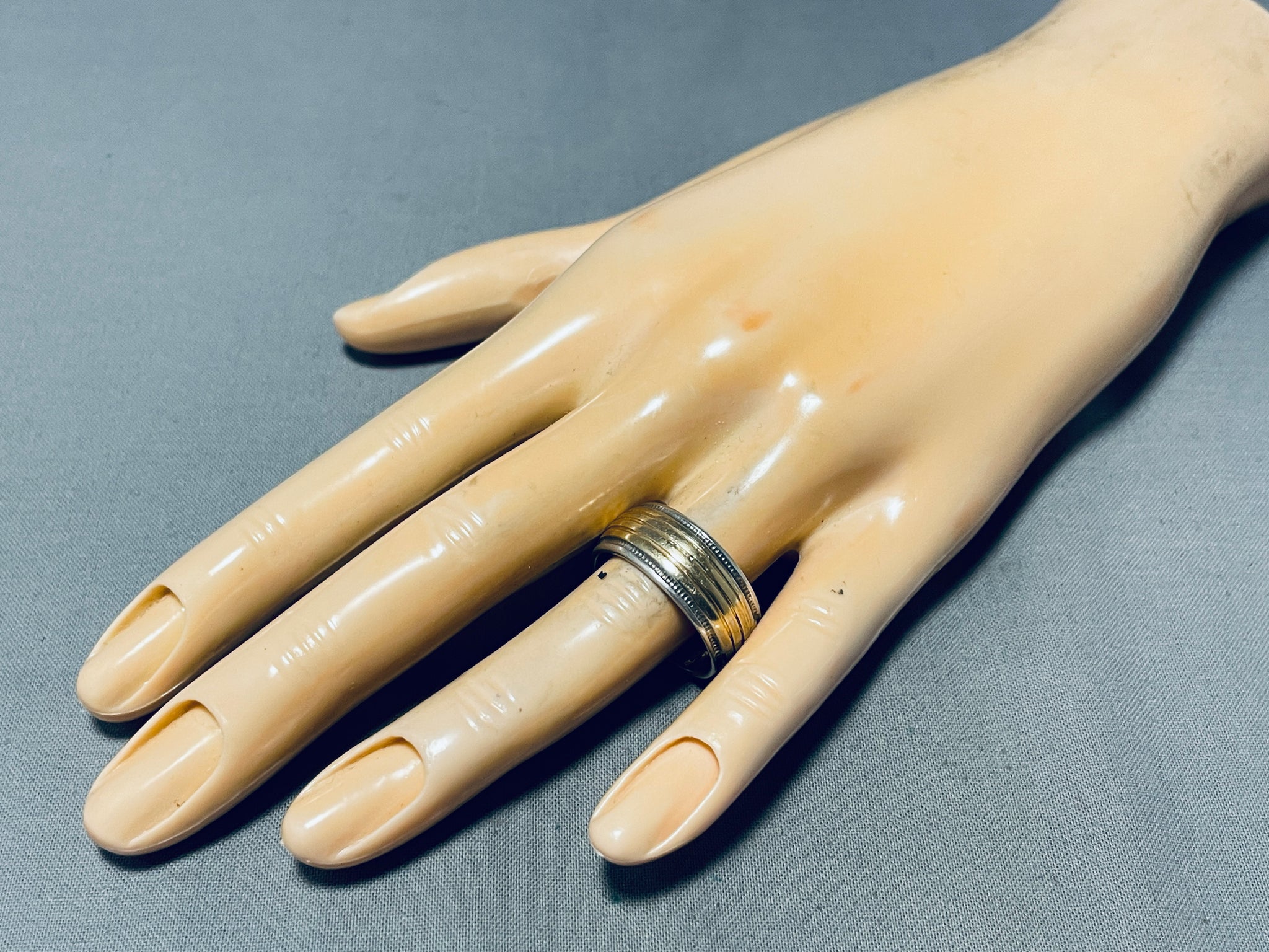 This is an incredible vintage Navajo silver and gold ring. Such a cool wide band! This two-tone ring has a ¼" wide spine of the 14k gold rivers that wrap all around the entire ring! Sweet! The ring face measures around 3/8" x 7/8". Signed by Navajo artist, V. Hicks. The ring size is around 10-1/2. Sterling silver and 14k gold, both marked. Sturdy 6 grams.