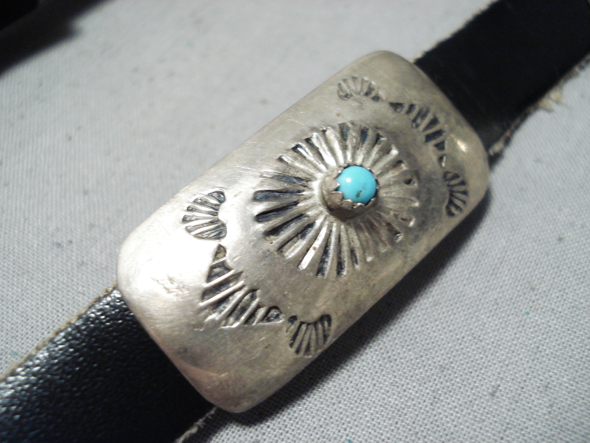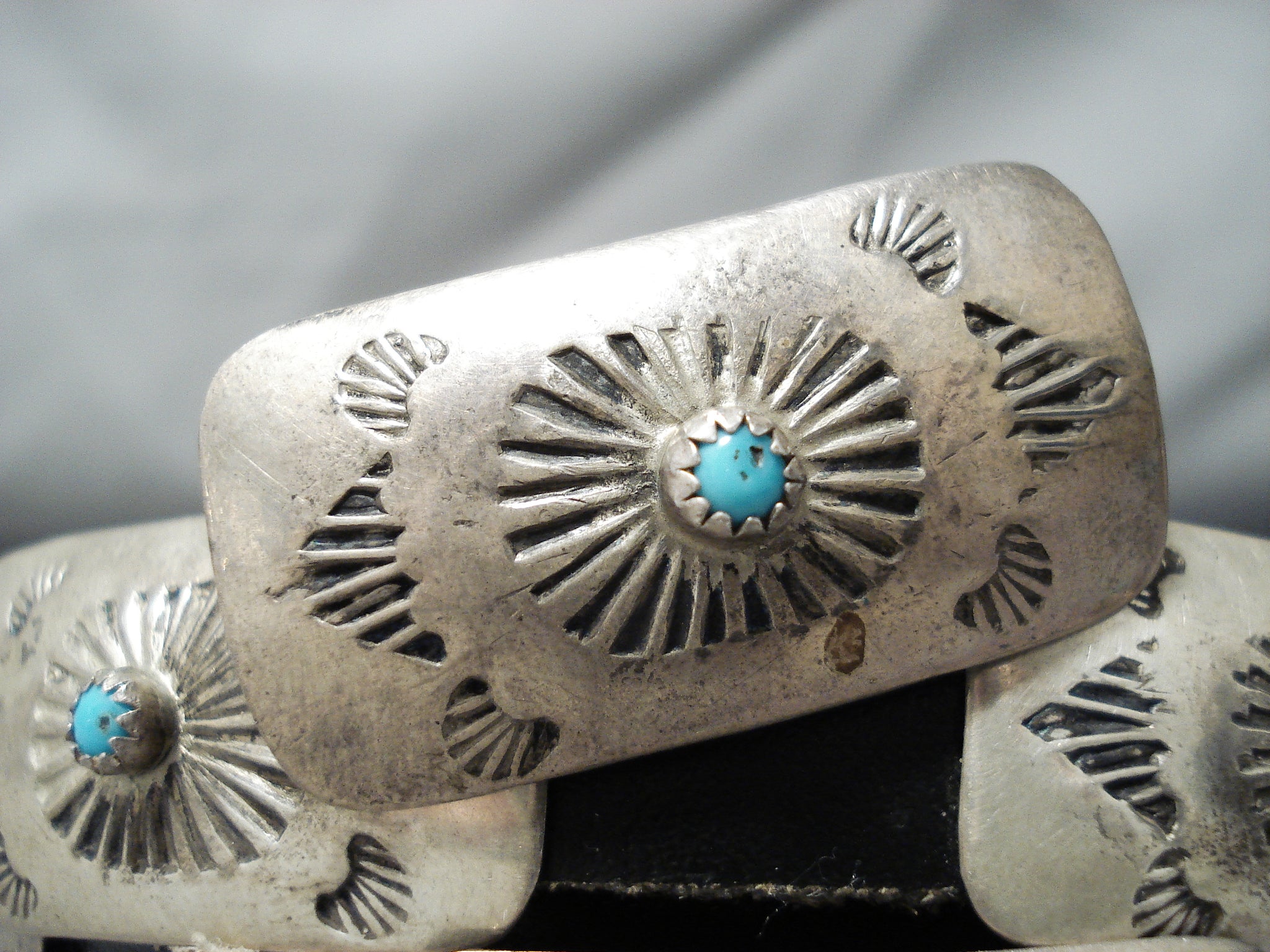 We are proud to offer this tremendous vintage Navajo concho belt with handcarved rectangular convex silver conchos with turquoise round centers and silver handstampings on a black leather belt! Absolutely Phenomenal! The belt width is about 1/2". Each concho measures around 1-1/2" x 5/8". The stones measure around 1/8" x 1/8". Sterling silver. This belt will fit a waist size between 30" and 44". Sturdy 84 grams.