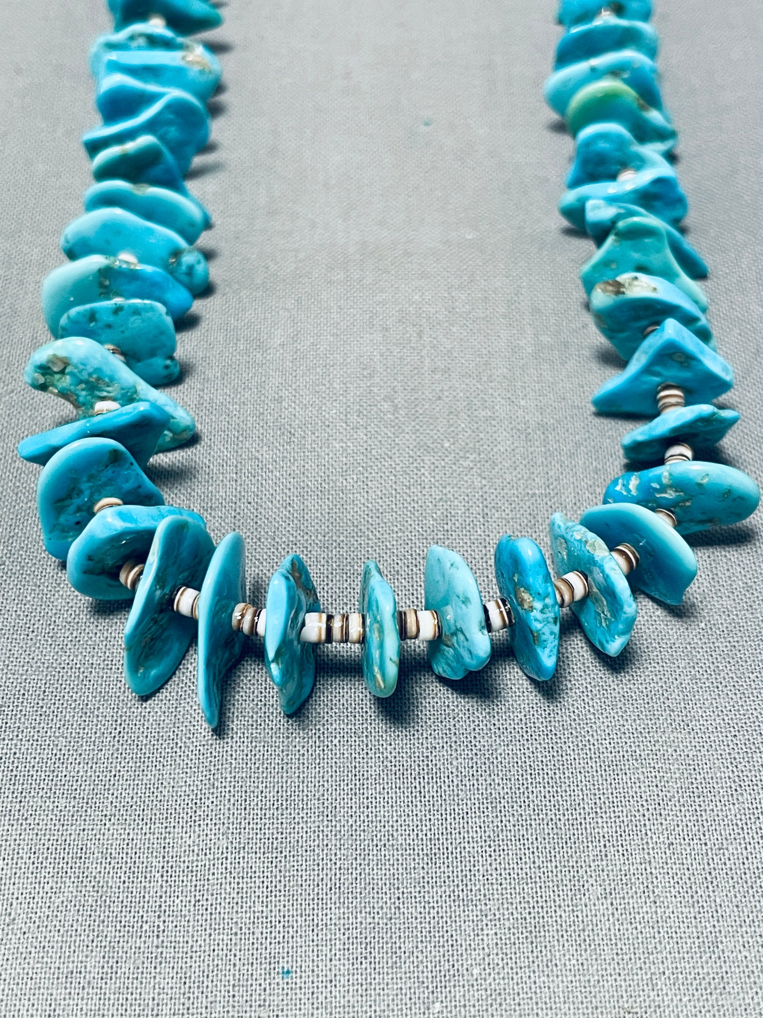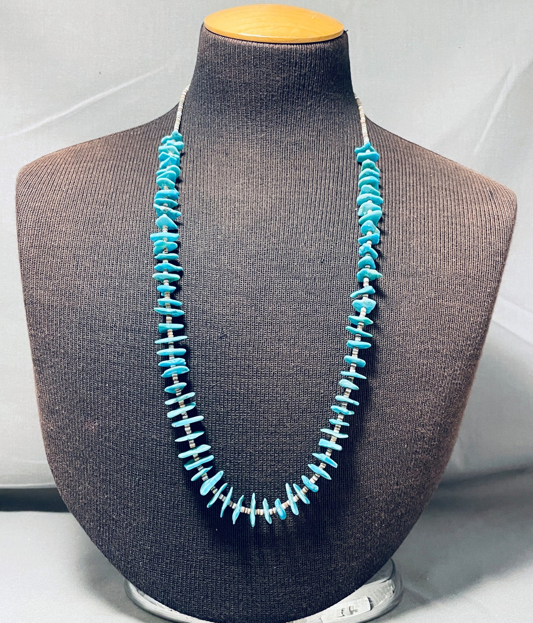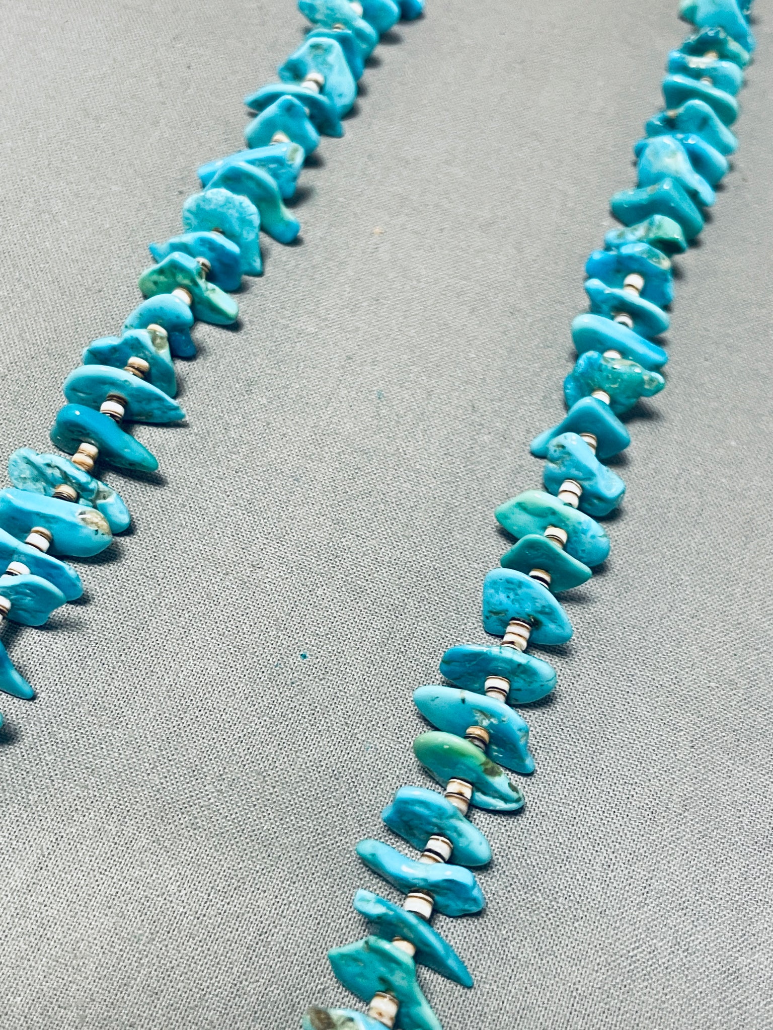 Up for sale is this fabulous vintage Navajo necklace featuring a single strand of turquoise slabs and heishi beads, with a silver hook and eye clasp! Absolutely Brilliant! Sterling silver. The length of the necklace measures around 26". Sturdy 37 grams.