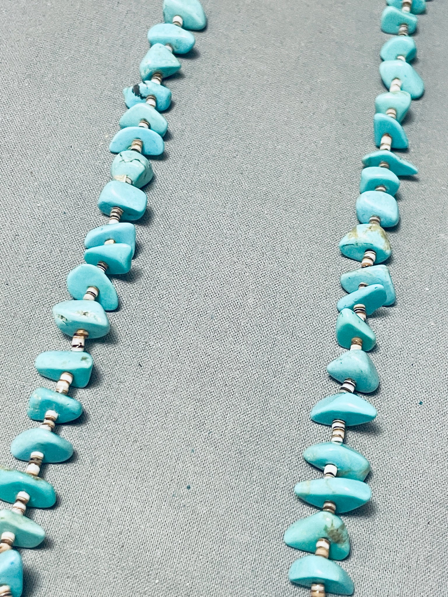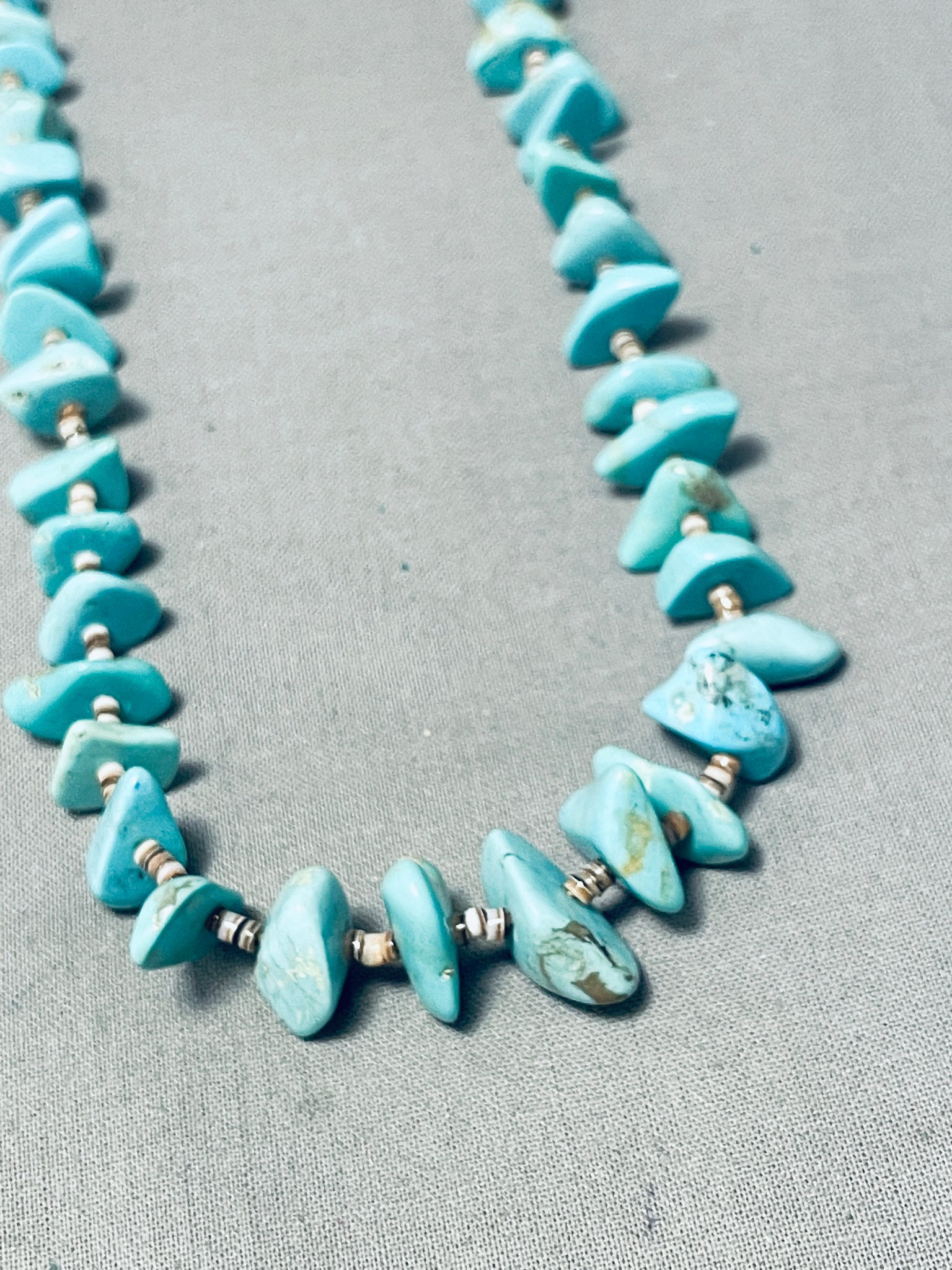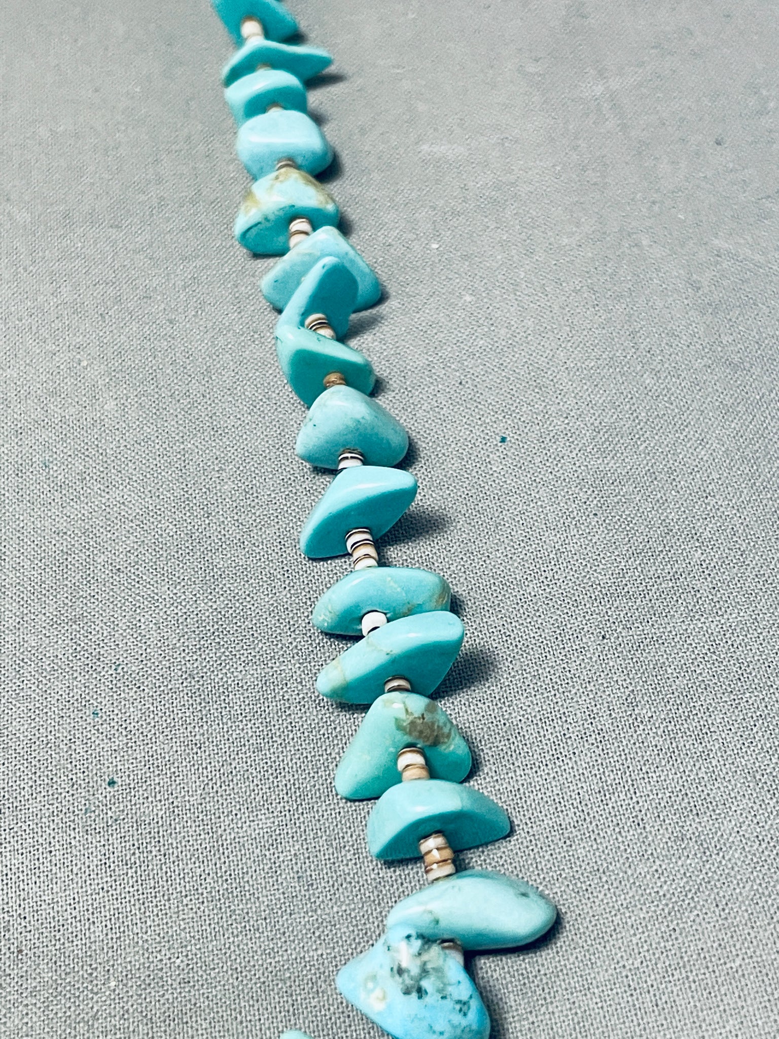 This is a superlative vintage Navajo necklace. This attractive necklace boasts over 50! superior turquoise stones, separated and accented with pretty tan heishi! The largest of stones measures about ¾" x ½". Sterling silver. The length of the necklace measures around 29". Sturdy 30 grams.