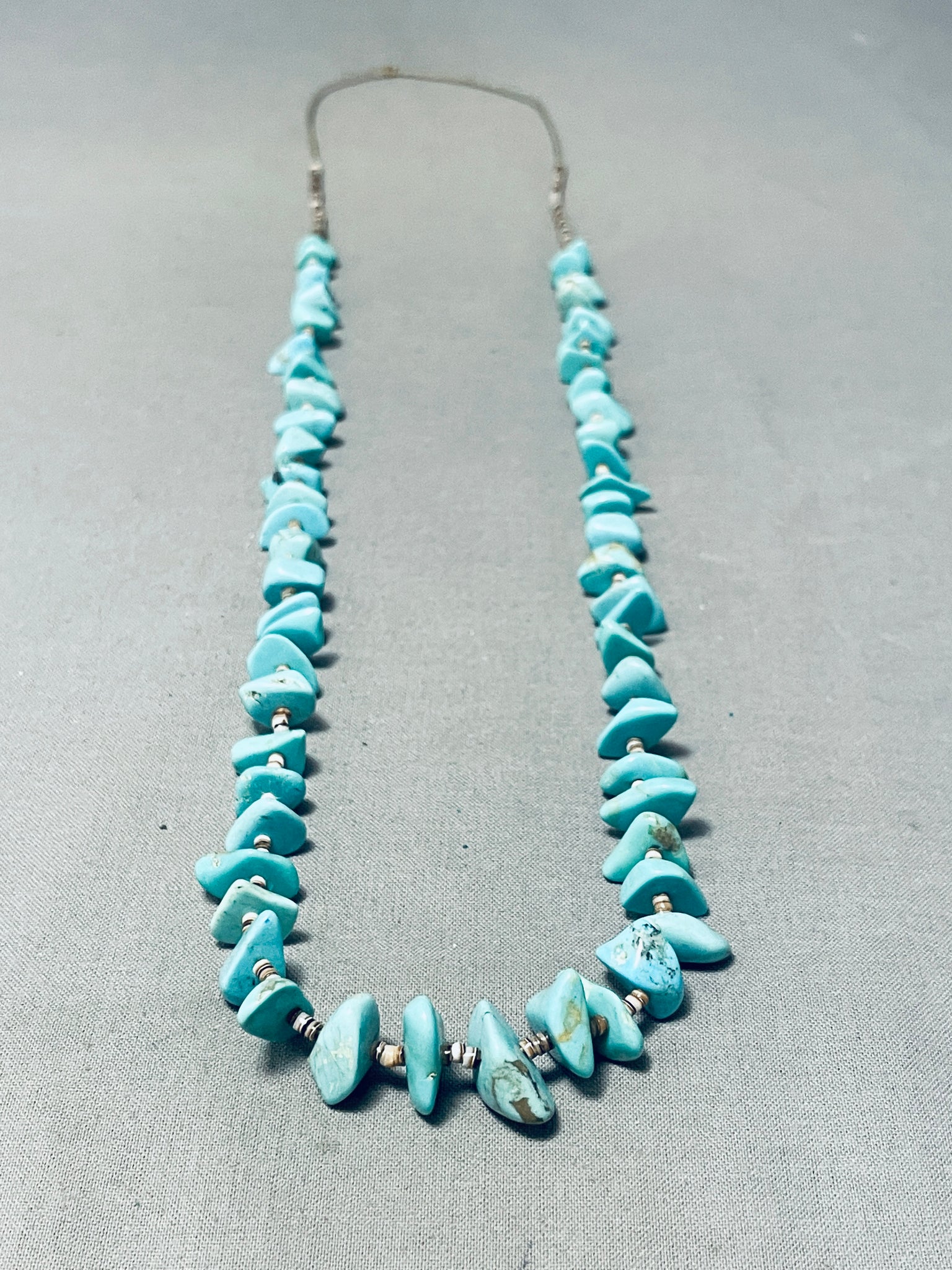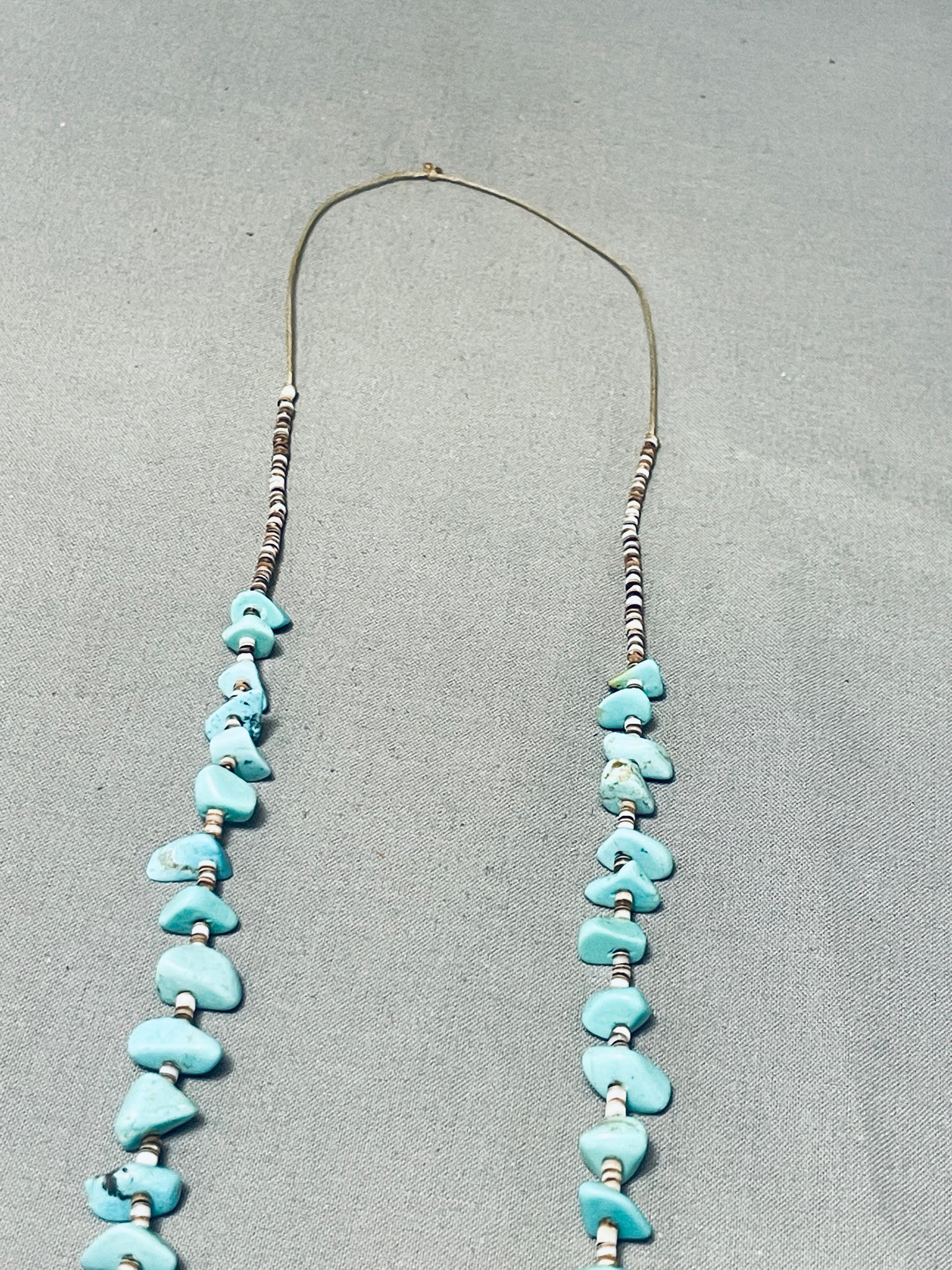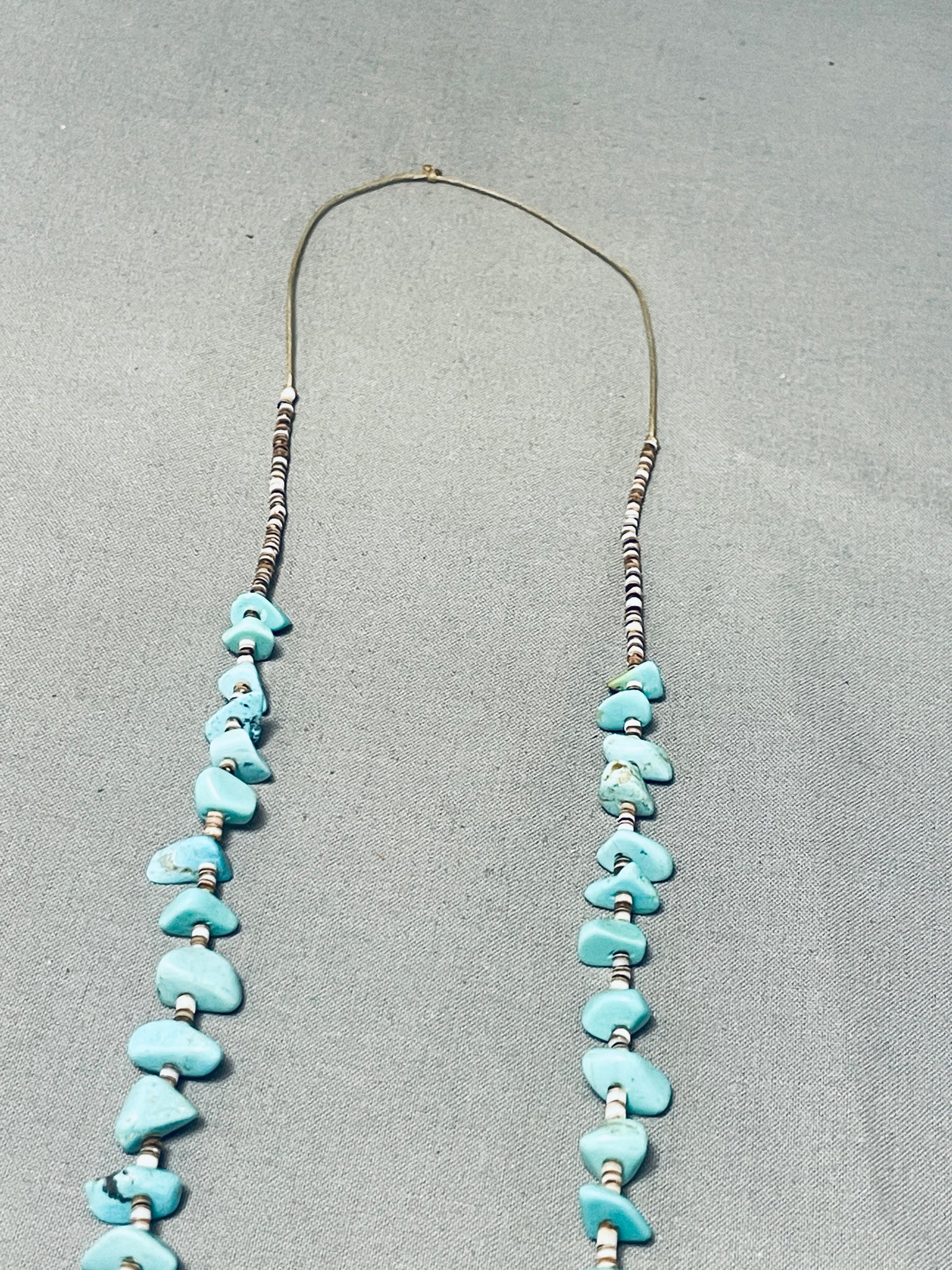 This is a superlative vintage Navajo necklace. This attractive necklace boasts over 50! superior turquoise stones, separated and accented with pretty tan heishi! The largest of stones measures about ¾" x ½". Sterling silver. The length of the necklace measures around 29". Sturdy 30 grams.