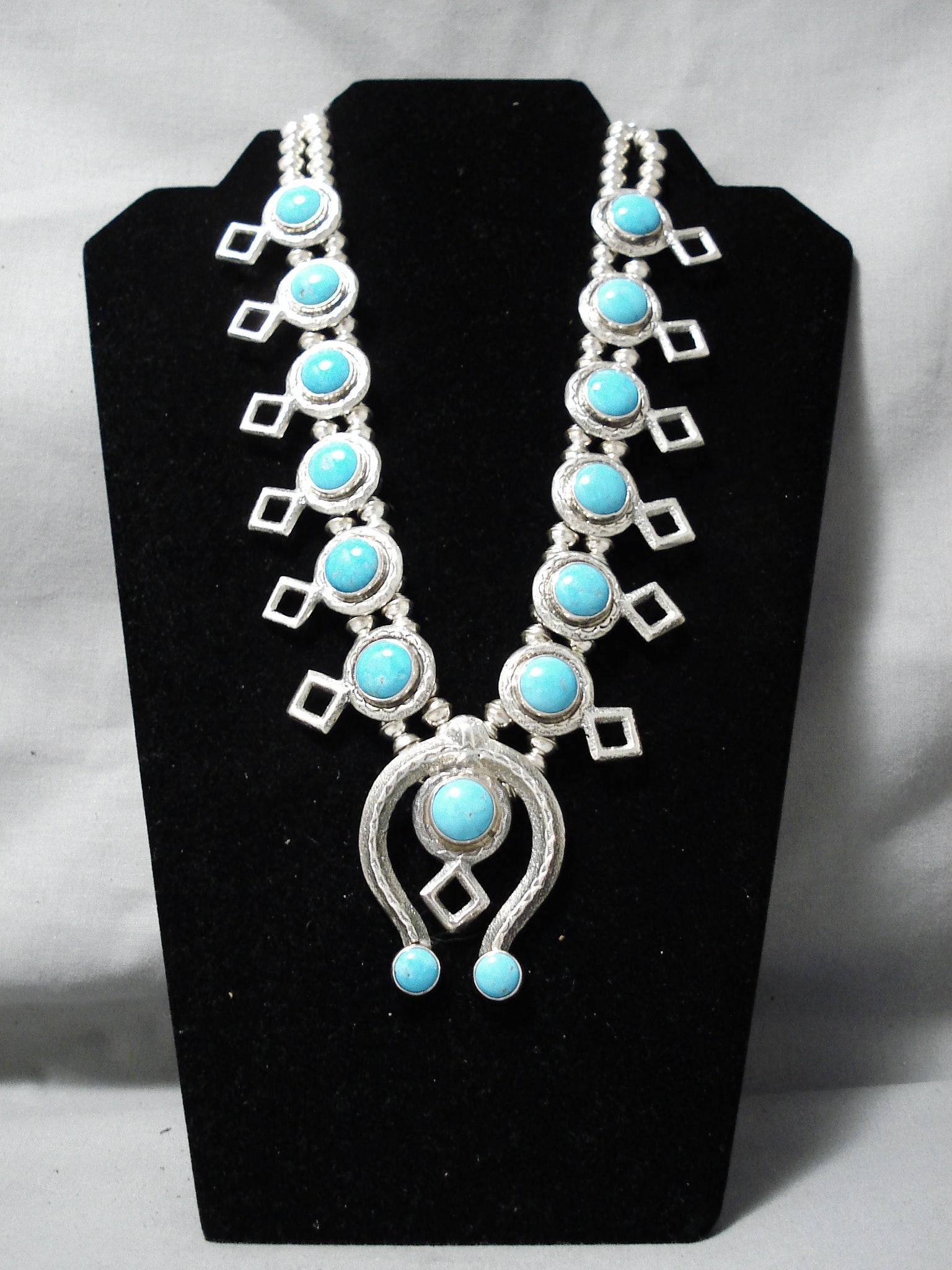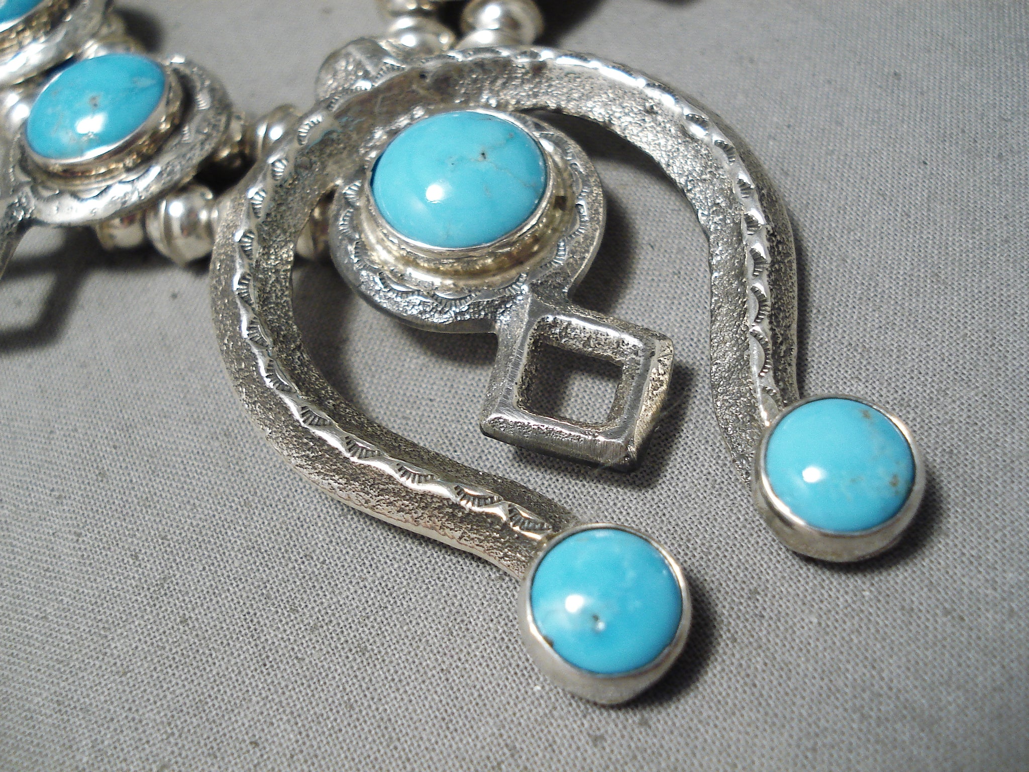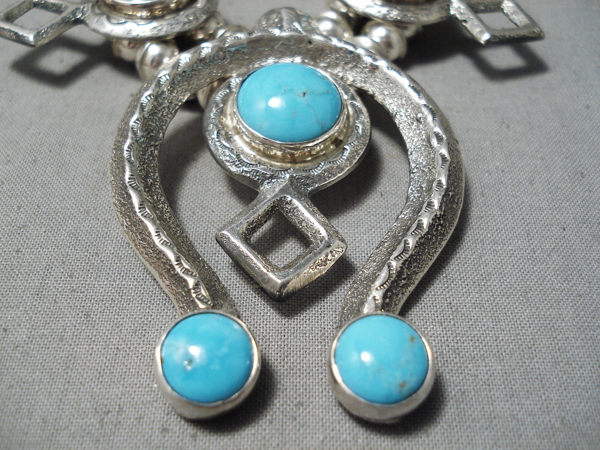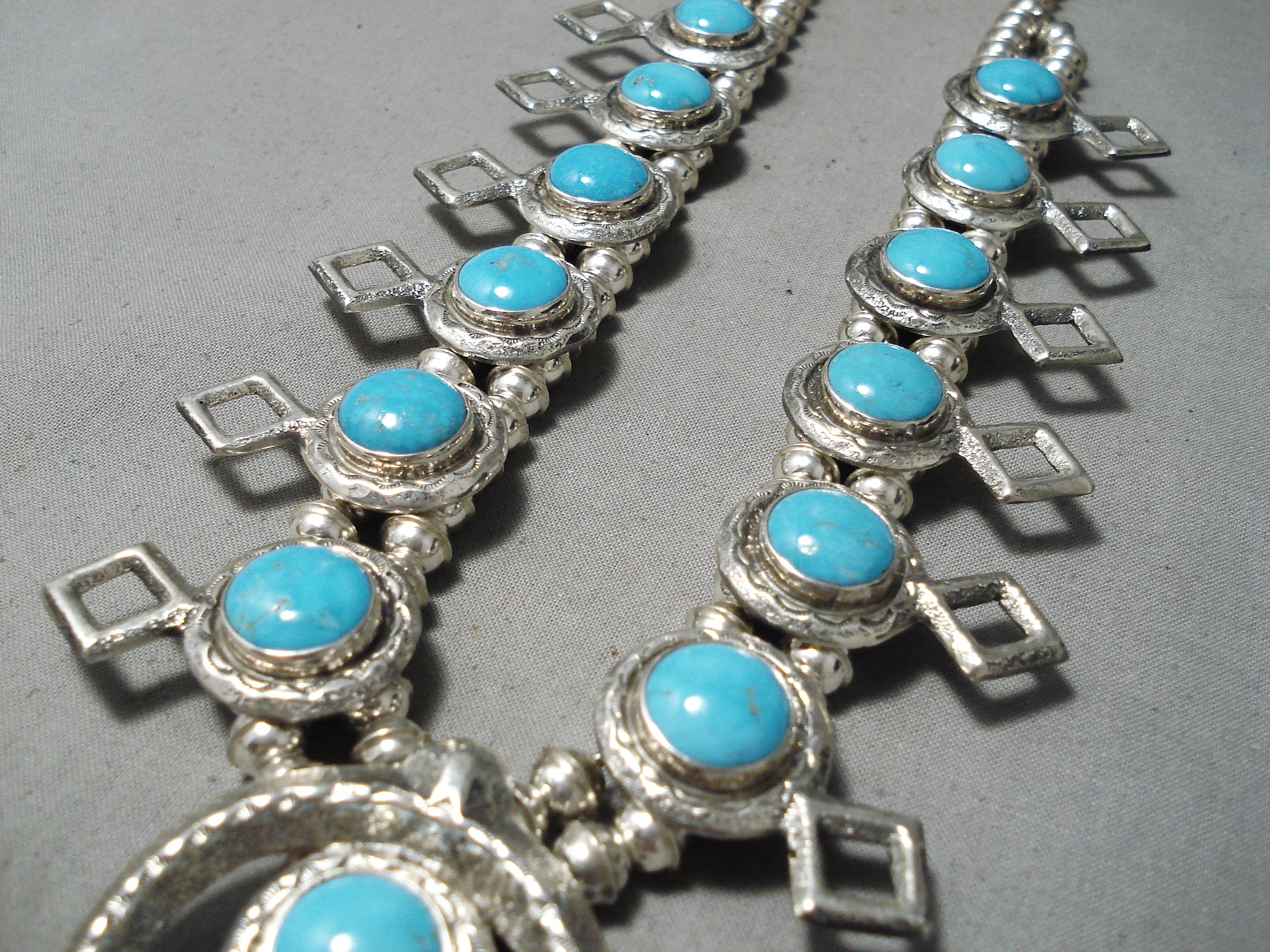 Amazing Vintage Native American Navajo Turquoise Sterling Silver Squash Blossom Necklace