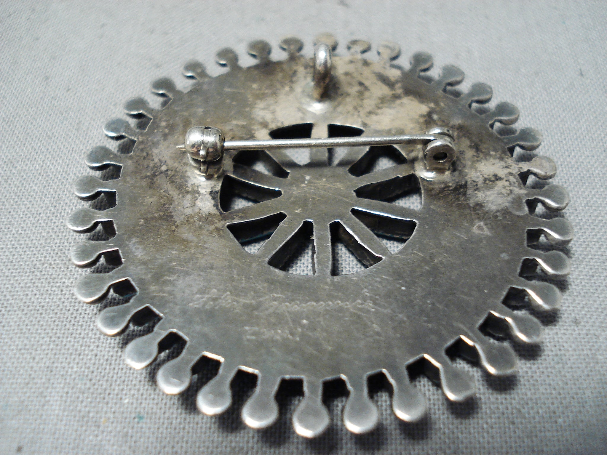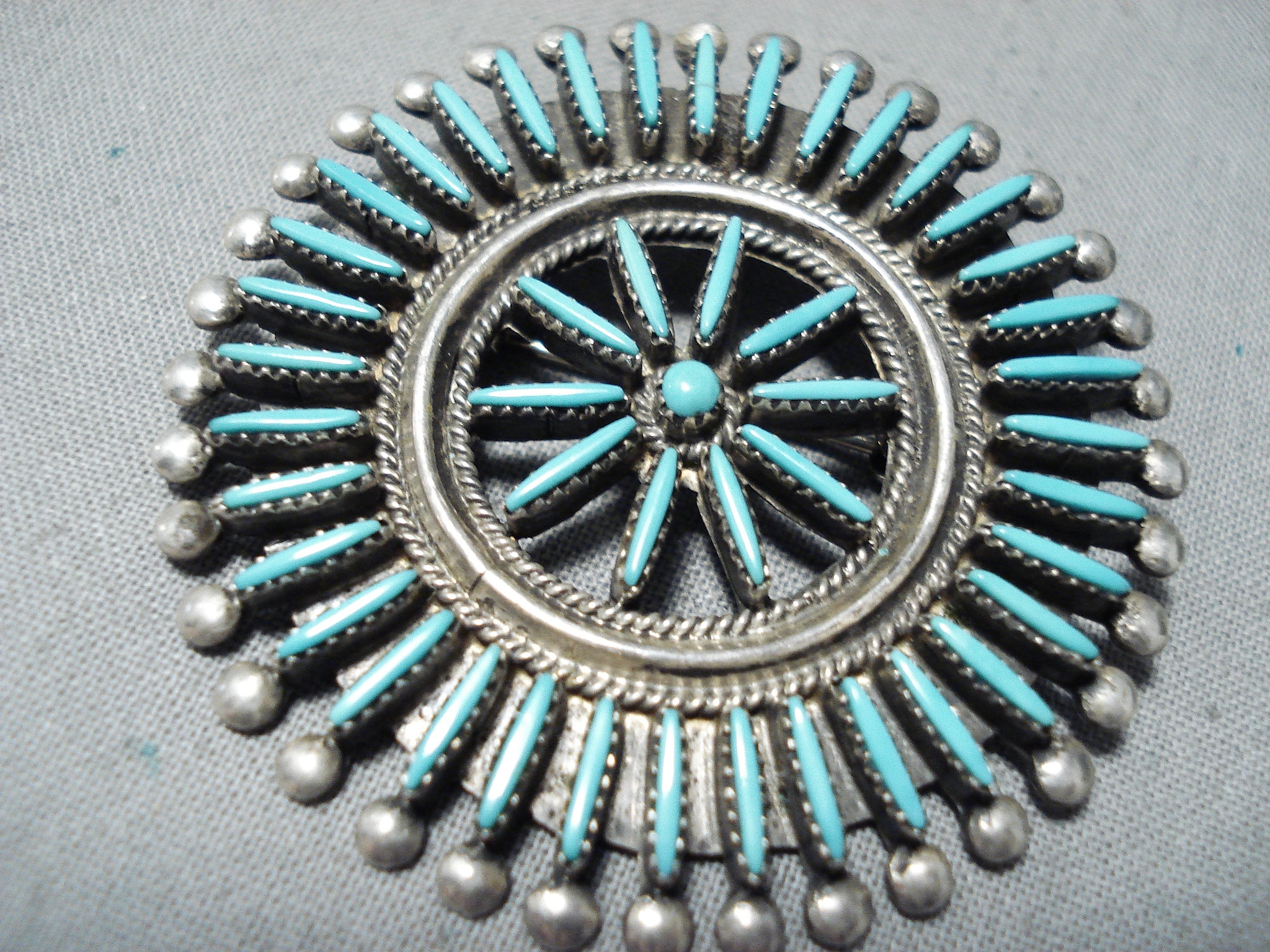 Amazing Vintage Native American Zuni Blue Gem Turquoise Needlepoint Sterling Silver Pin Pendant