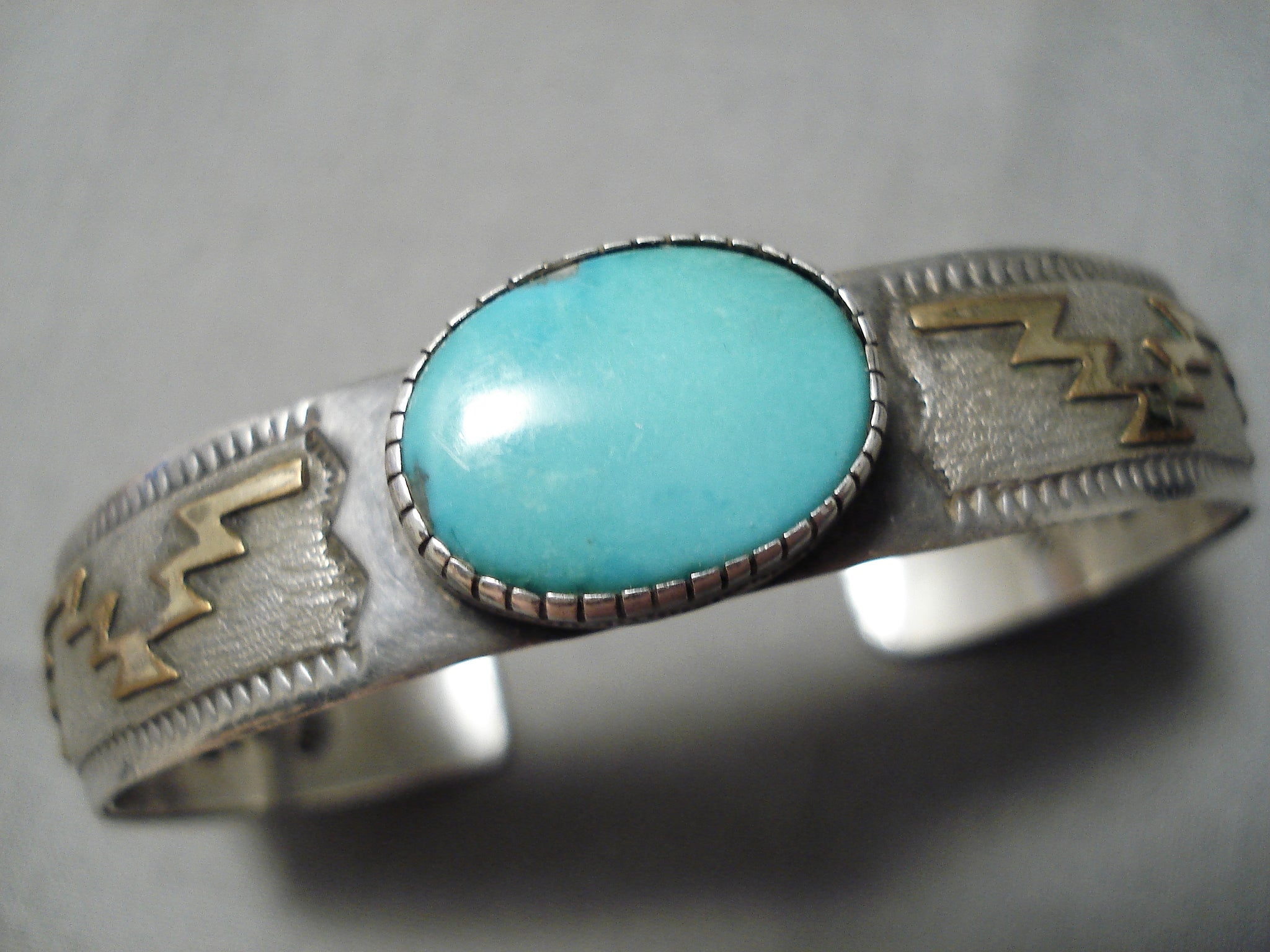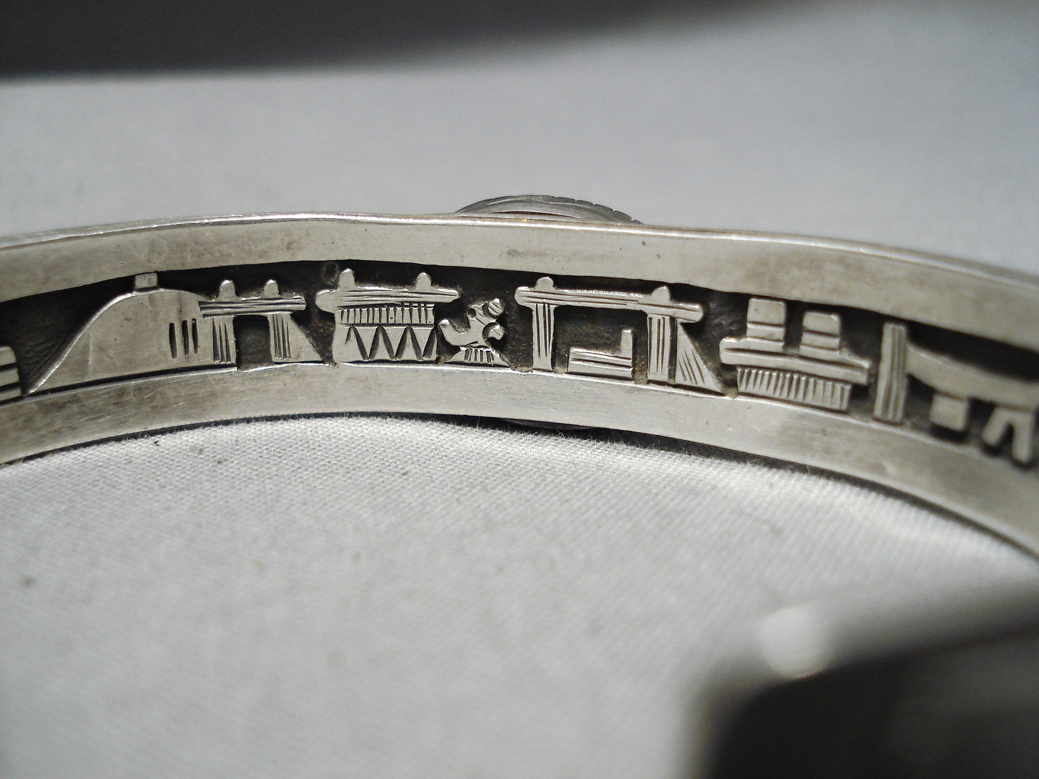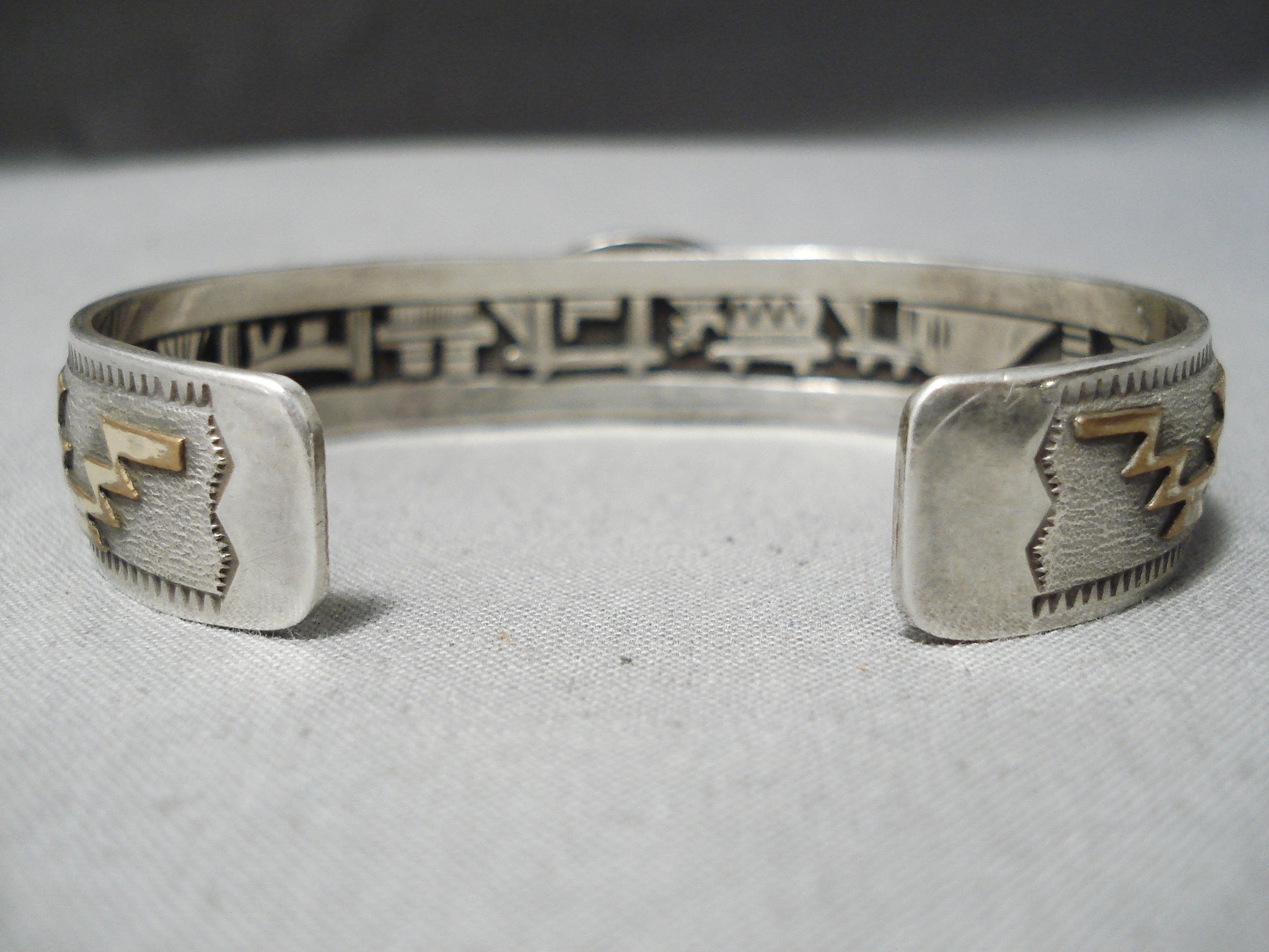 We are proud to offer this magnificent vintage Navajo silver bracelet having a large green turquoise oval centered on a handcarved solid silver cuff with handcarved 12K gold rug designs! An intricately handcarved silver storyteller scene is on the inner cuff! Truly Unique! The center stone measures around 3/4" x 1/2". The width of the bracelet measures around 1/2". Signed by Navajo artist, Randall Begay. Sterling silver, marked and 12K gold, marked. The inside end to end measures around 5-3/4" with an additional 1" gap. Sturdy 27 grams.
