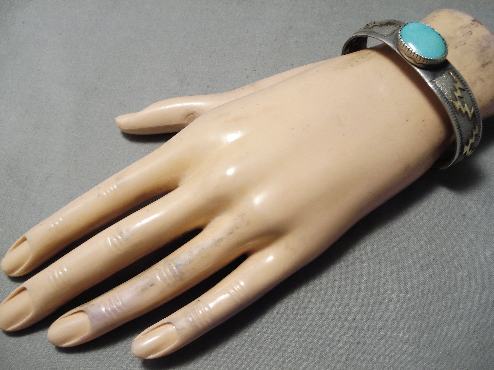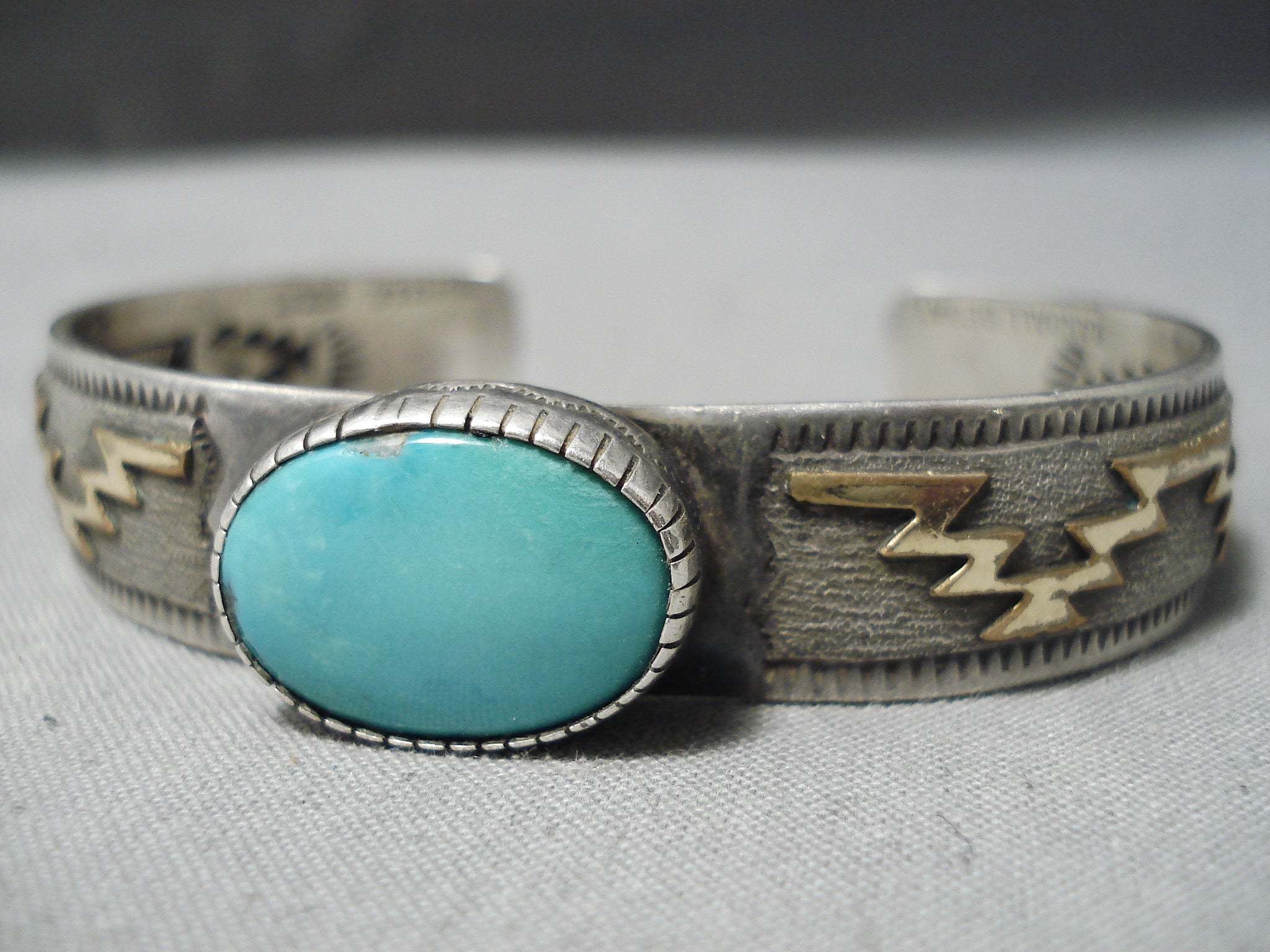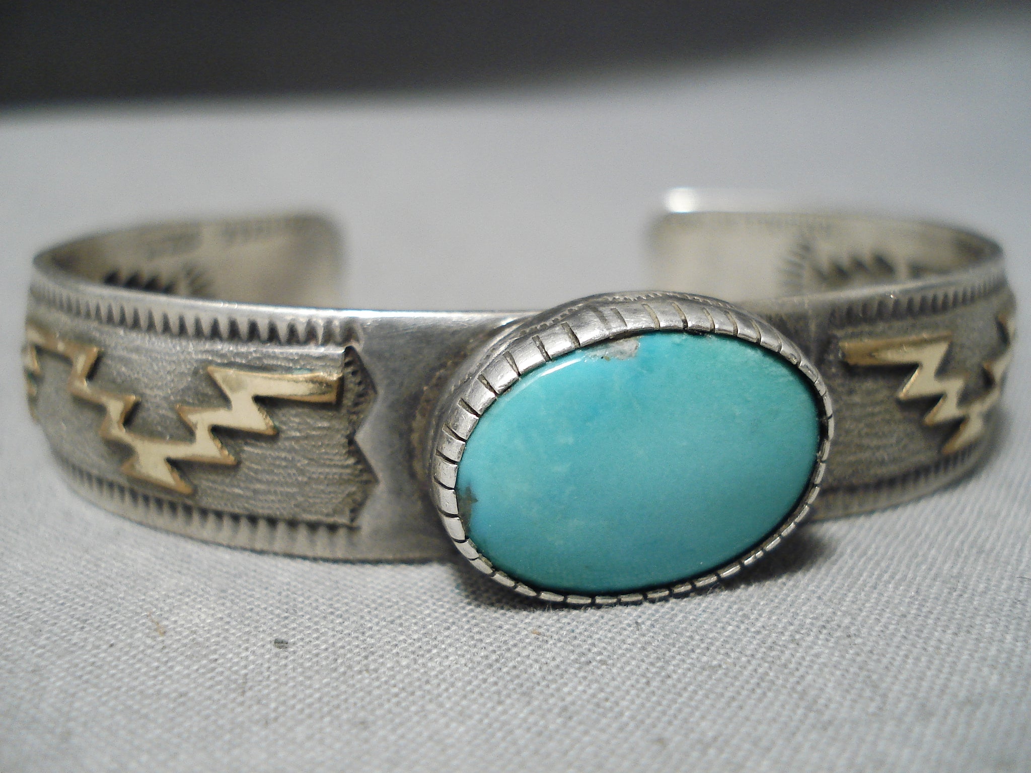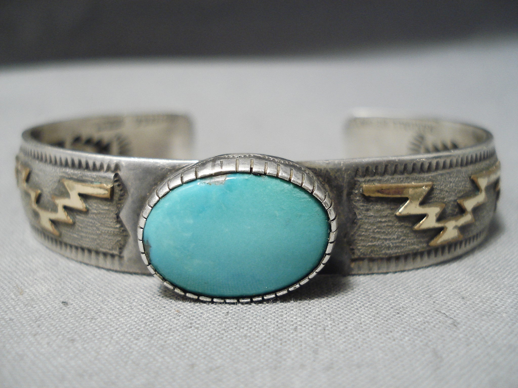 We are proud to offer this magnificent vintage Navajo silver bracelet having a large green turquoise oval centered on a handcarved solid silver cuff with handcarved 12K gold rug designs! An intricately handcarved silver storyteller scene is on the inner cuff! Truly Unique! The center stone measures around 3/4" x 1/2". The width of the bracelet measures around 1/2". Signed by Navajo artist, Randall Begay. Sterling silver, marked and 12K gold, marked. The inside end to end measures around 5-3/4" with an additional 1" gap. Sturdy 27 grams.