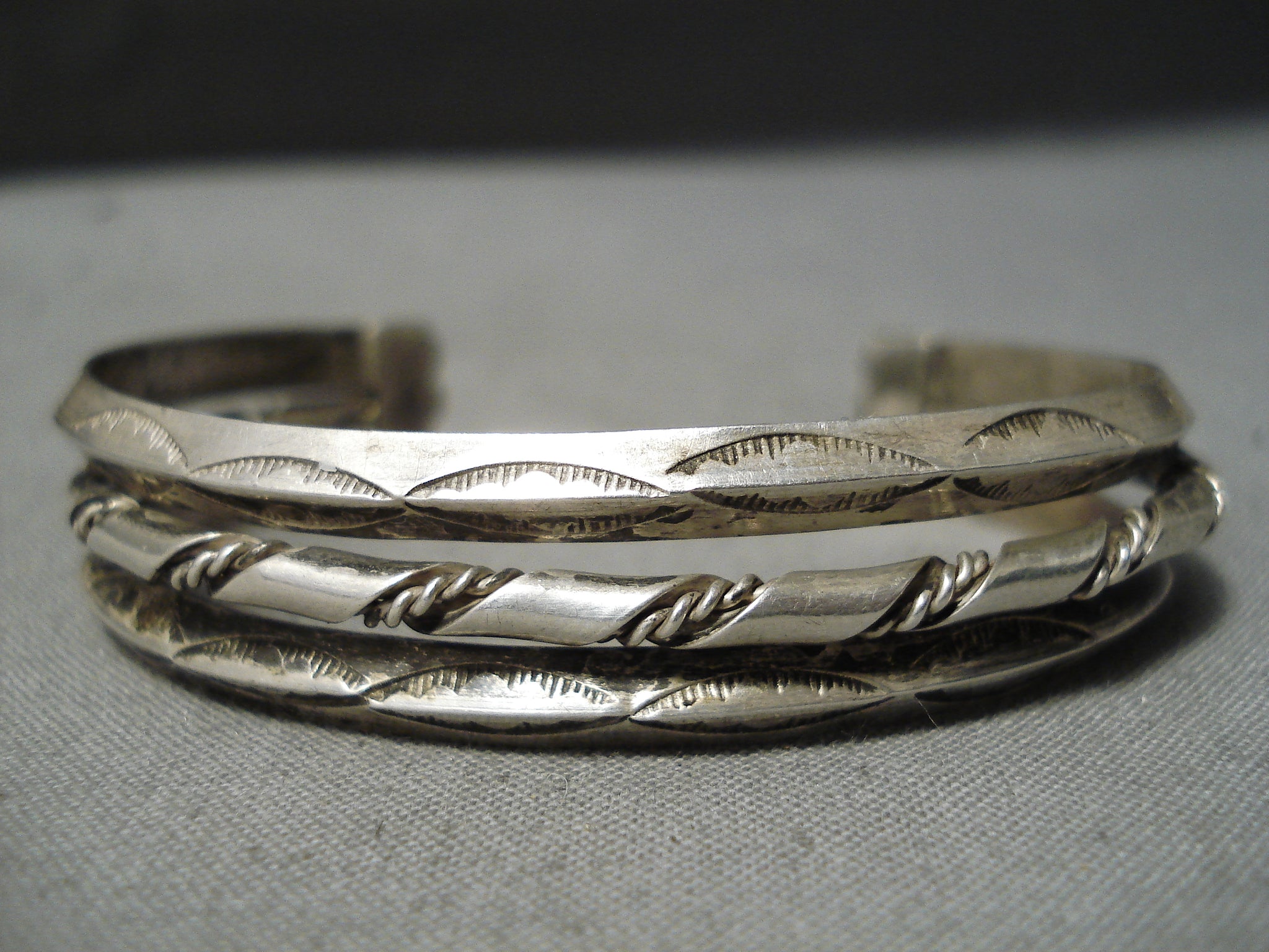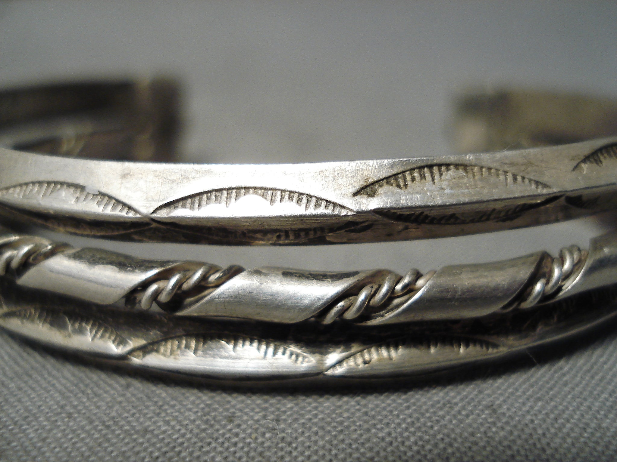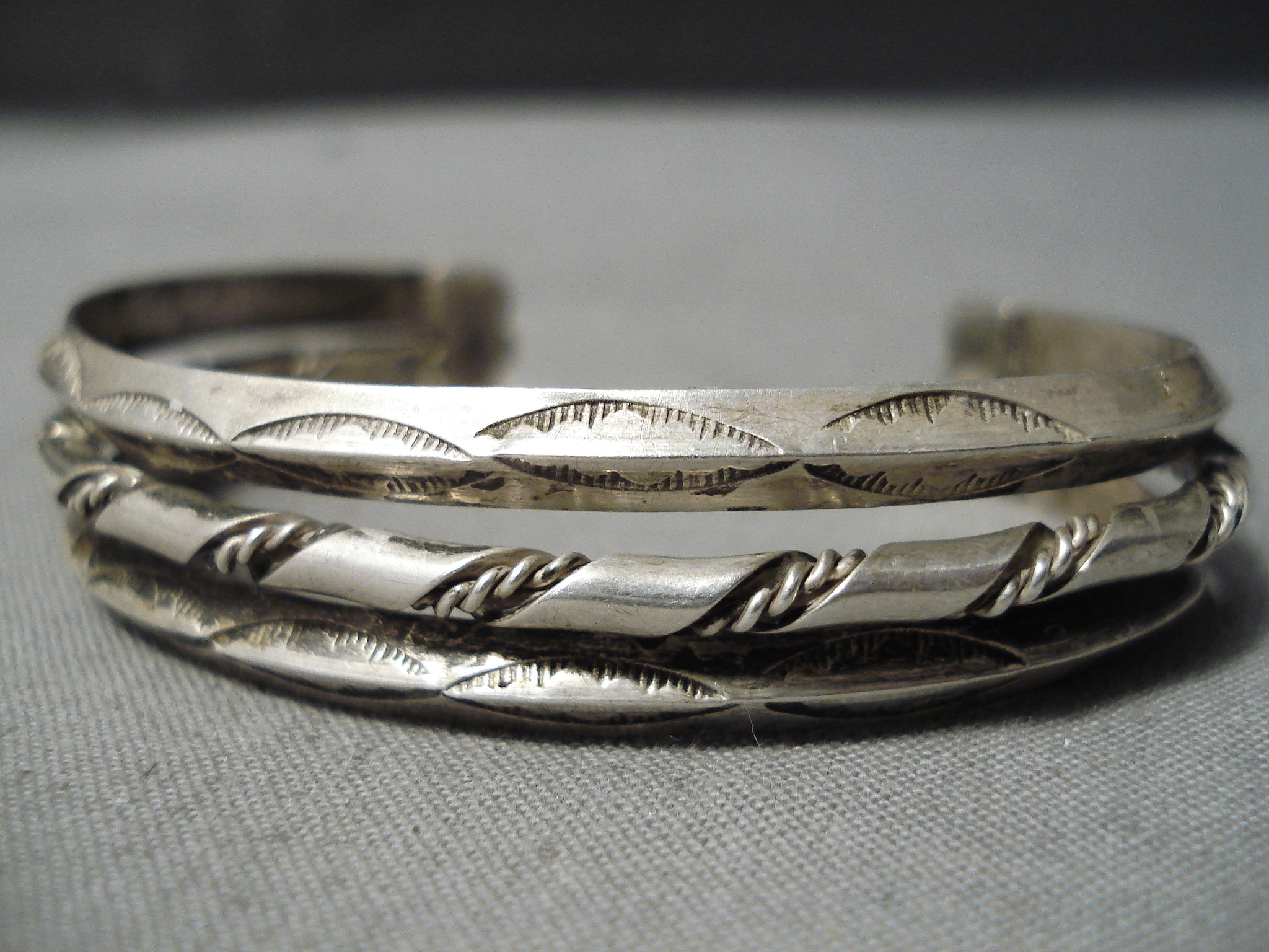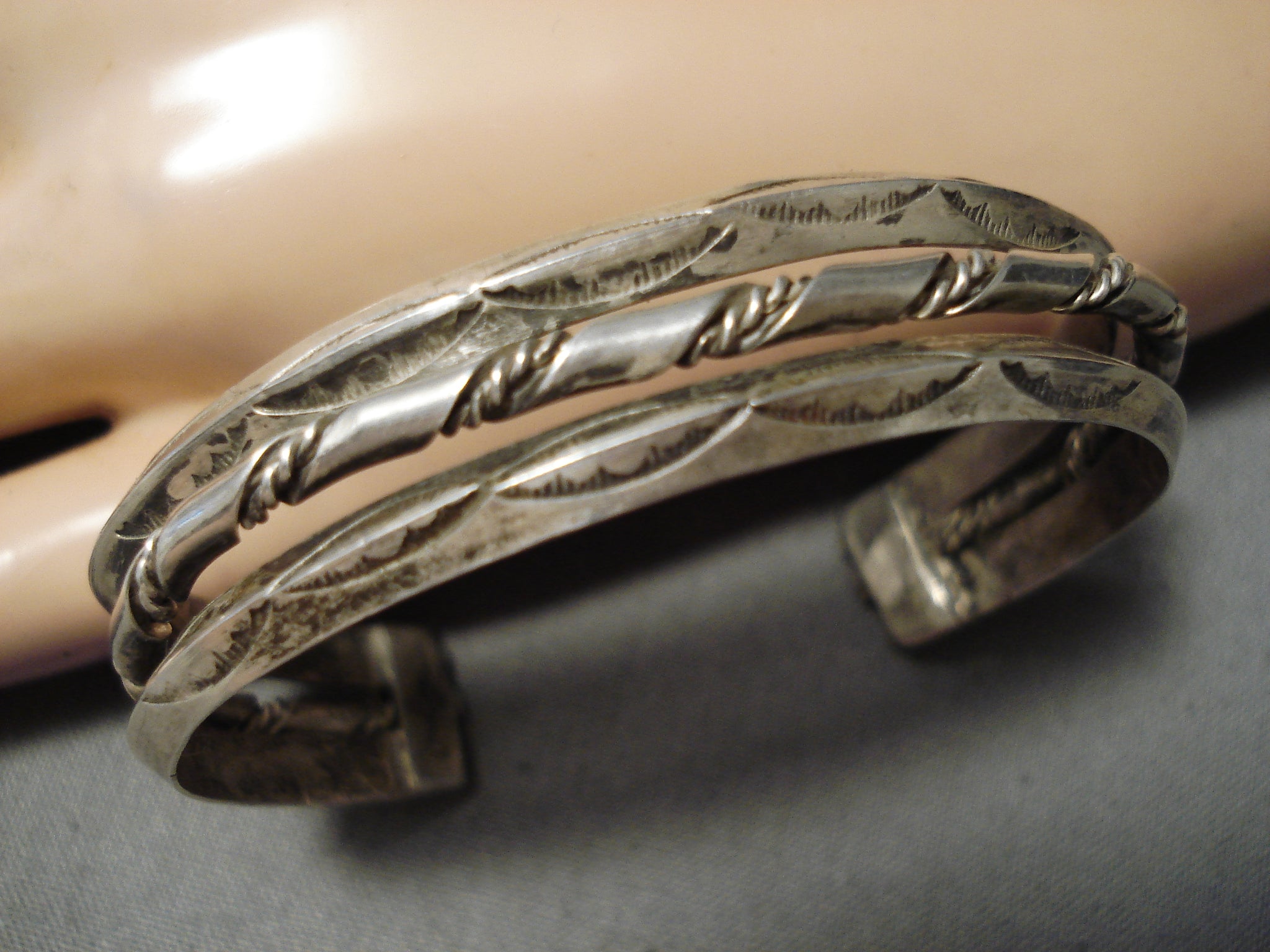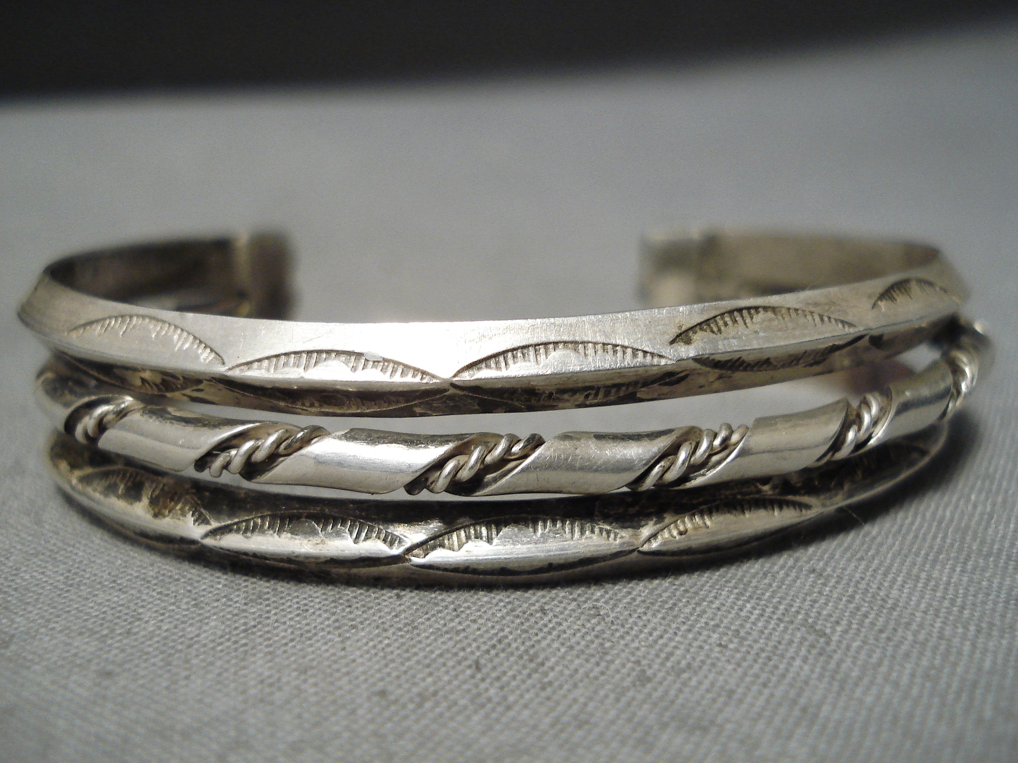 Up for sale is this superlative vintage Navajo silver bracelet. Handstamped beveled rails create the outsides of the triple rail cuff, while the center is a marvelous silver ribbon with twist design! The width of the bracelet measures around 1/2". Sterling silver. The inside end to end measures around 5" with an additional 1-1/8" gap. Sturdy 26 grams. Cir. Mid Century.