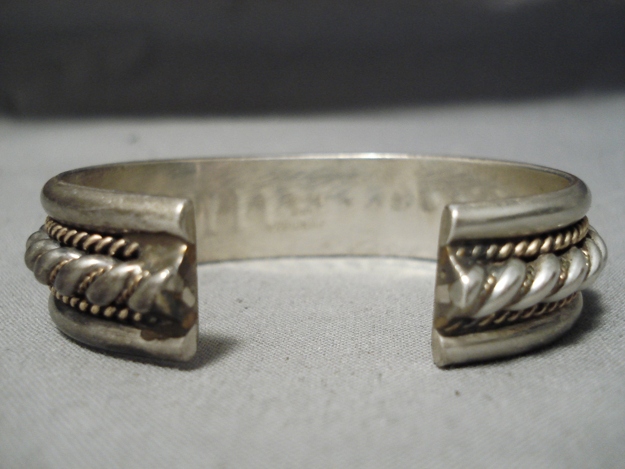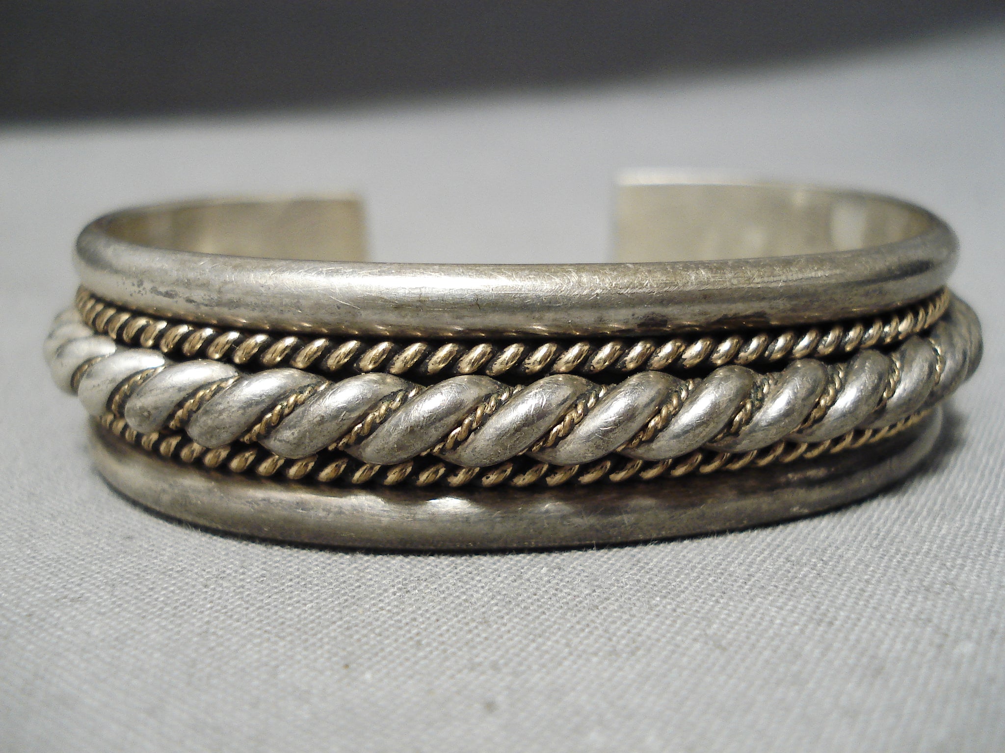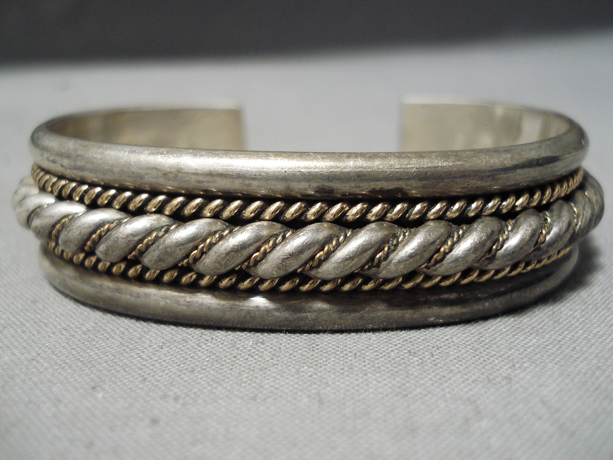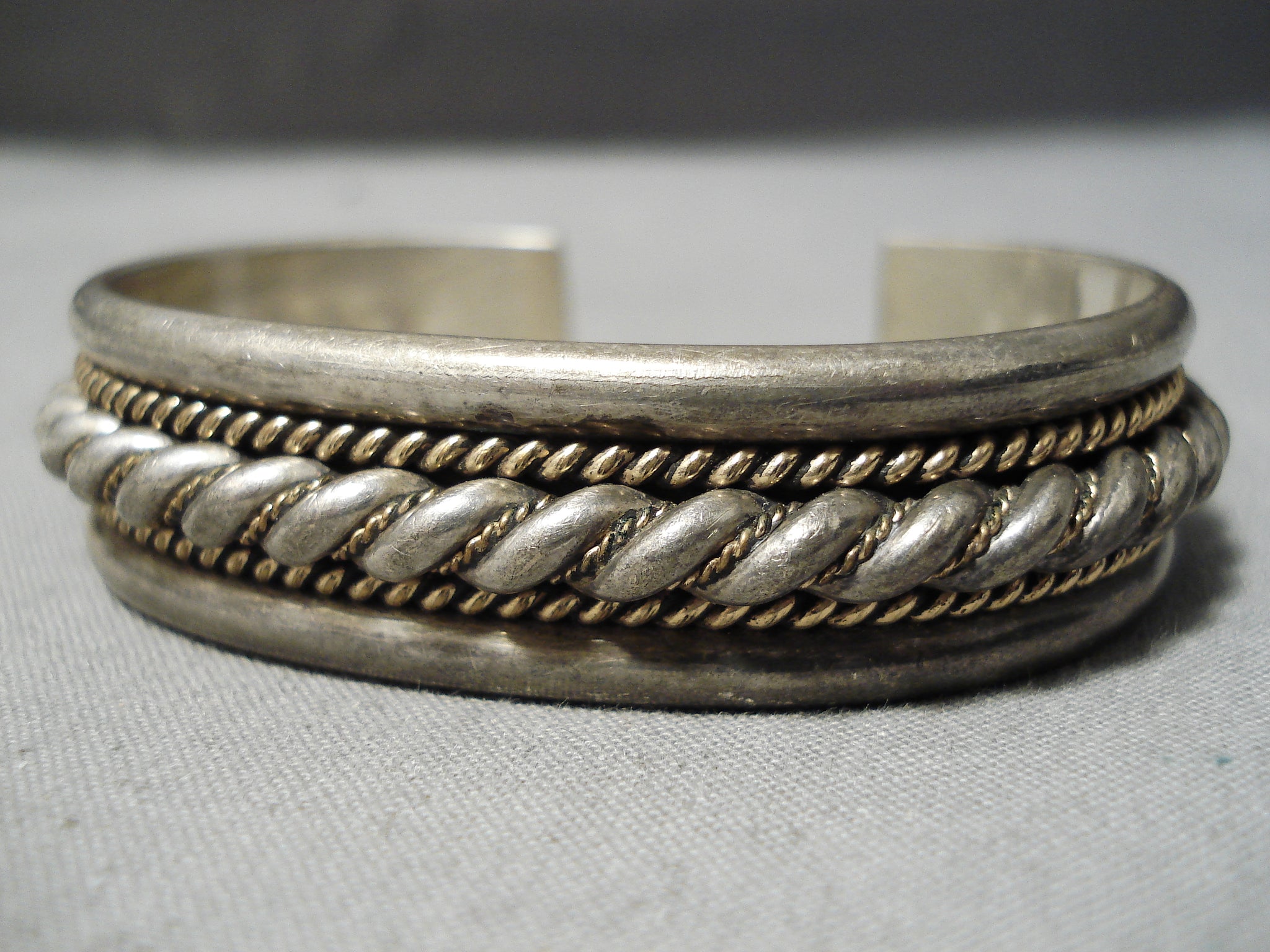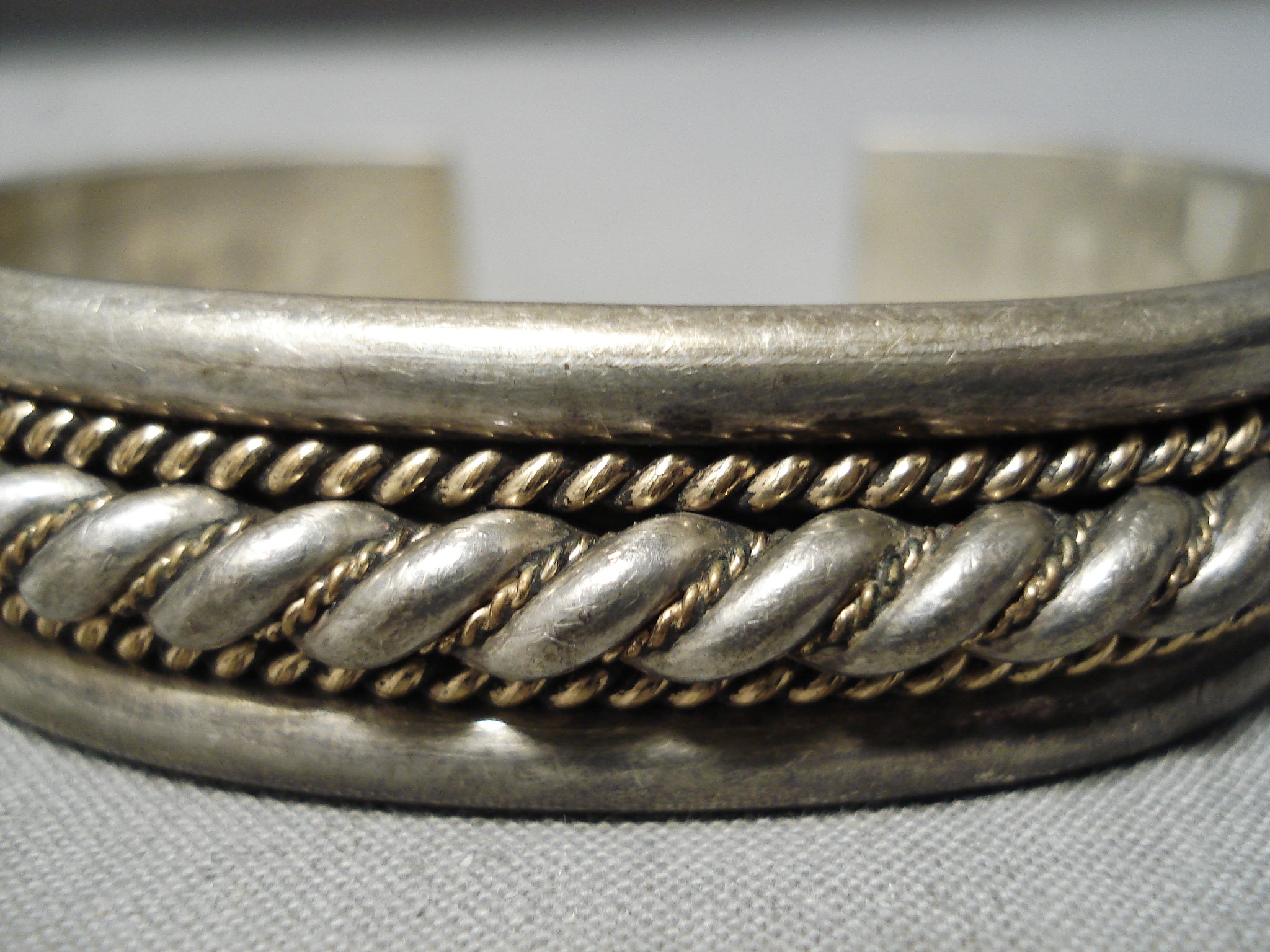A tremendous vintage Navajo silver and 12 kgf bracelet. The two-tone design of the sterling silver and 12kgf rope really bring this cuff to life! Really love the raised twist spine in the very center as it rises above all, reaching from end to end! The width of the bracelet measures around 5/8". Signed by Navajo artist, J. Tahe. Sterling silver and 12 kgf, both marked. The inside end to end measures around 5-1/2" with an additional 7/8" gap. Sturdy 56 grams. Cir Mid to late century.