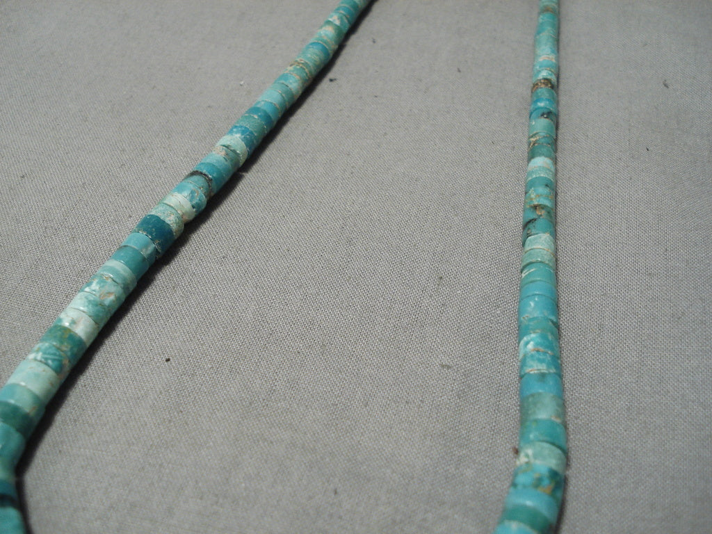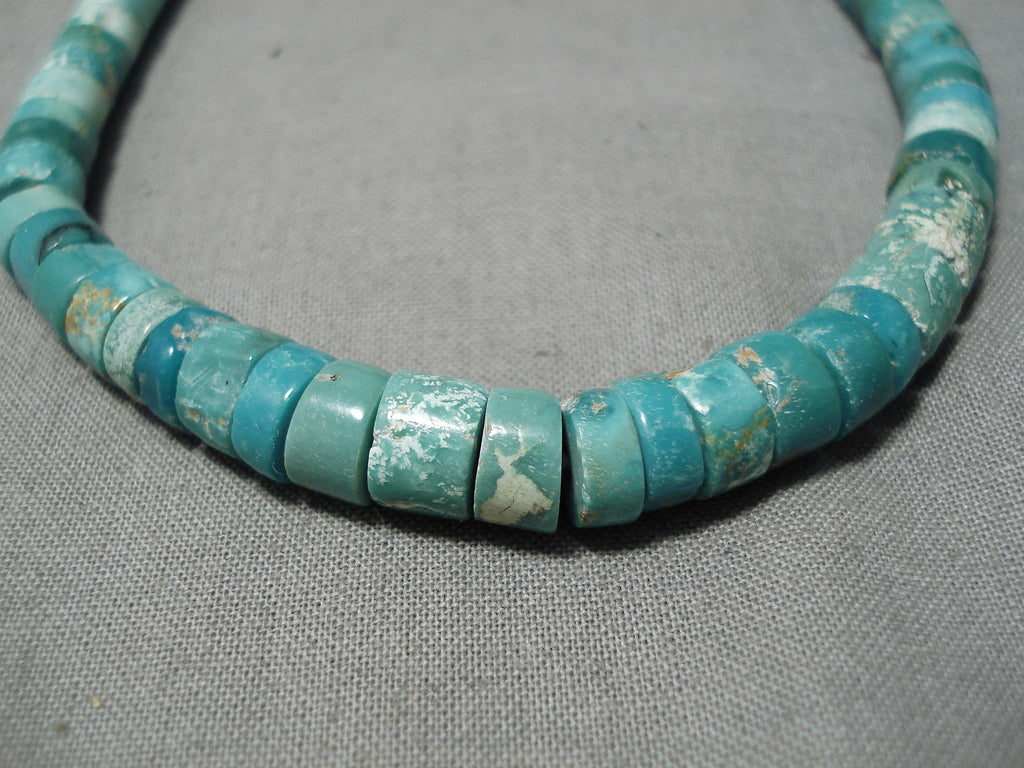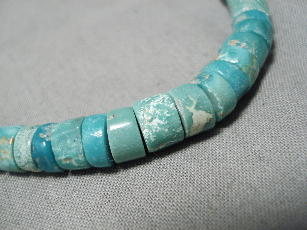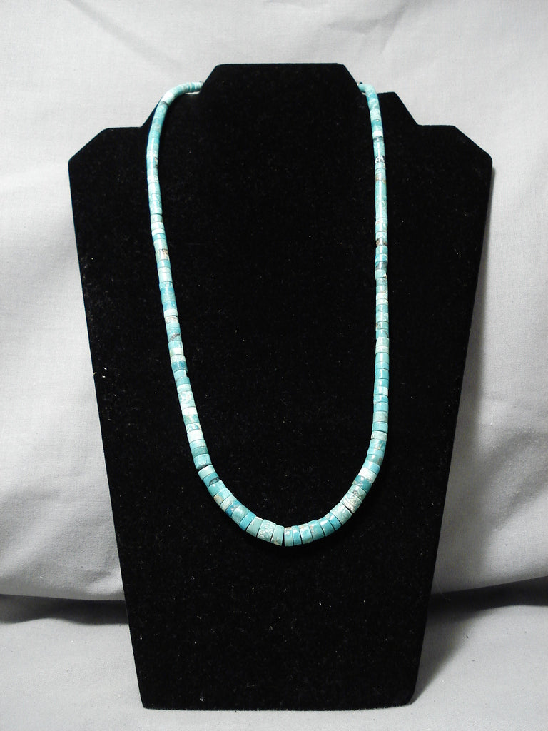 This is an amazing vintage Navajo turquoise heishi necklace. This very rare older turquoise heishi necklace contains beautiful graduating turquoise heishi with the largest measuring around 1/4" in diameter. The stones appear to be from the old Apache turquoise mine. Resting at the ends of the necklace are silver cones with a traditional silver clasp. Sterling silver. Cir. Mid century . The length of the necklace measures around 22". Sturdy 34 grams.