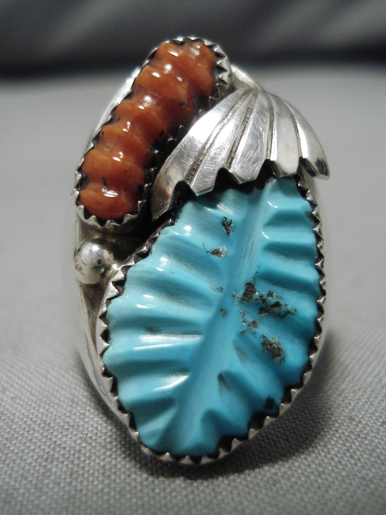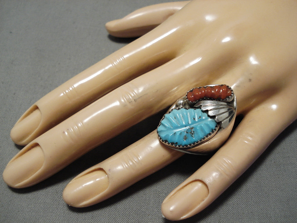 Up for sale is this fascinating vintage Zuni silver ring. The oval face of this large impressive ring is home to a beautifully carved turquoise and a coral stone as they’re nestled among a large silver fan and bead. The largest stone measures around 3/4" x 1/2". The ring face measures around 1-1/4" x 7/8". Signed by Zuni artist, Lolita Tsate. The ring size is around 10-1/2. Sterling silver. Sturdy 24 grams.