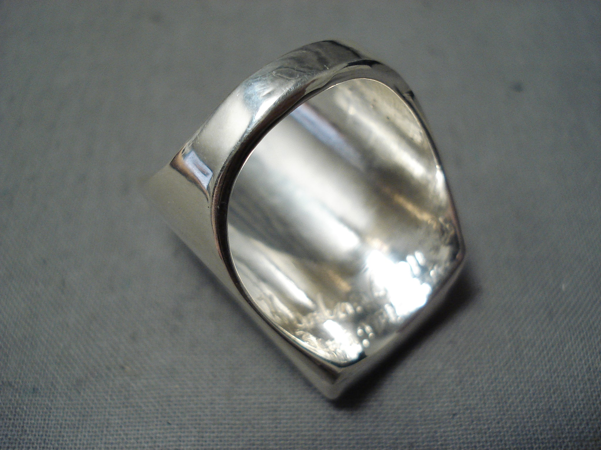 We are proud to offer this breathtaking Zuni silver ring having inlay coral and mother of pearl on an ironwood background with handcarved silver borders and a graduated solid silver band! Absolutely Extraordinary! The ring face measures around 1-1/8" x 4/8". Signed by Zuni artist, Harlan Coonsis. The ring size is around 11. Sterling silver. Sturdy 20 grams.