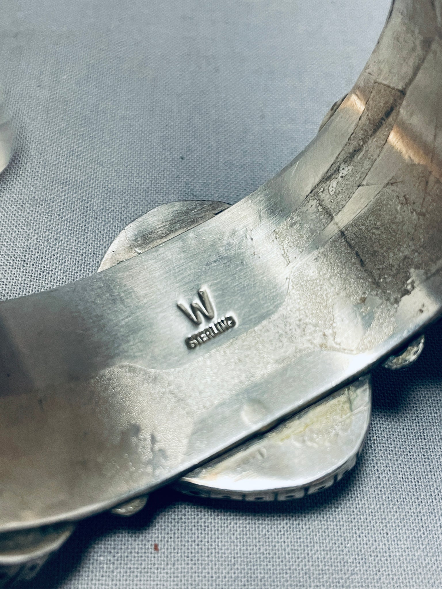 This is a tremendous vintage Navajo three stone silver cuff bracelet. This outstanding bracelet contains three very large graduating chunky green to blue colored turquoise stones appearing to be from the amazing Apache Canyon turquoise mine. The bezels surrounding the stones are amazing consisting of dotted and channel works. Situated throughout the stones are beautiful silver shells. Running down the ends of the very thick and sturdy silver cuff bracelet are impressive sun stampings with accenting sun bursting stamped silver fan flanks. The center stone measures around 1-3/8" x 1". The width of the bracelet measures around 1-1/2". Signed by Navajo artist, Wayne Etsitty . Sterling silver, marked. Cir. 1970's+. The inside end to end measures around 5-3/4" with an additional 3/4" gap. Sturdy 123 grams.