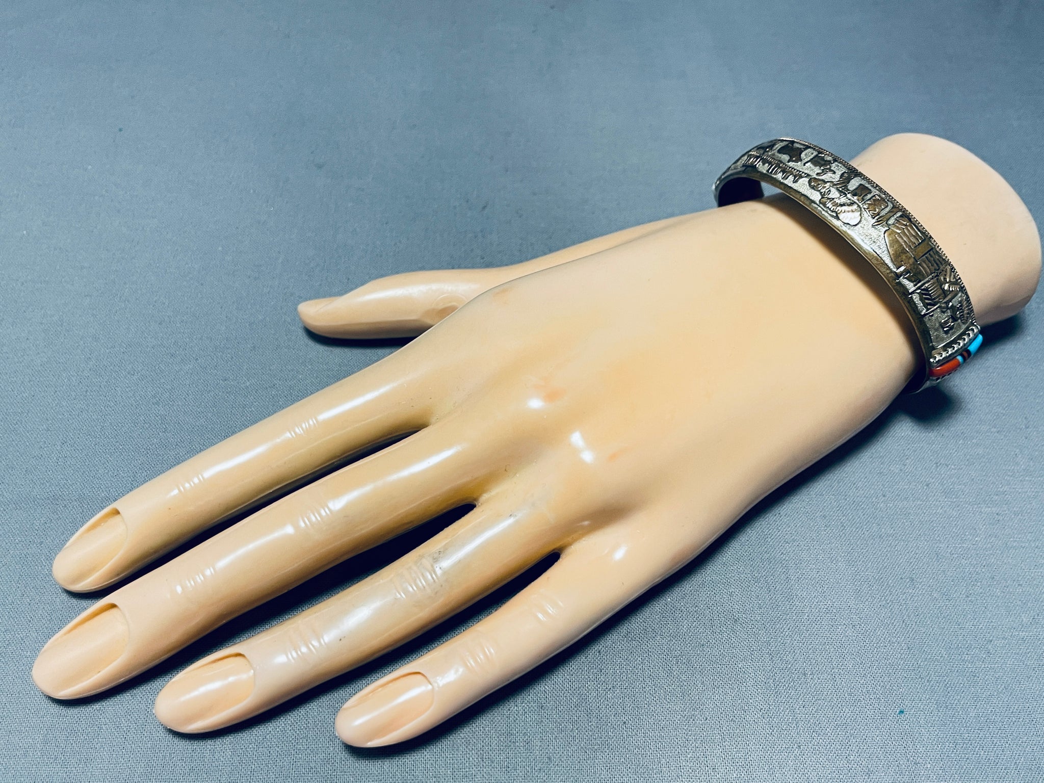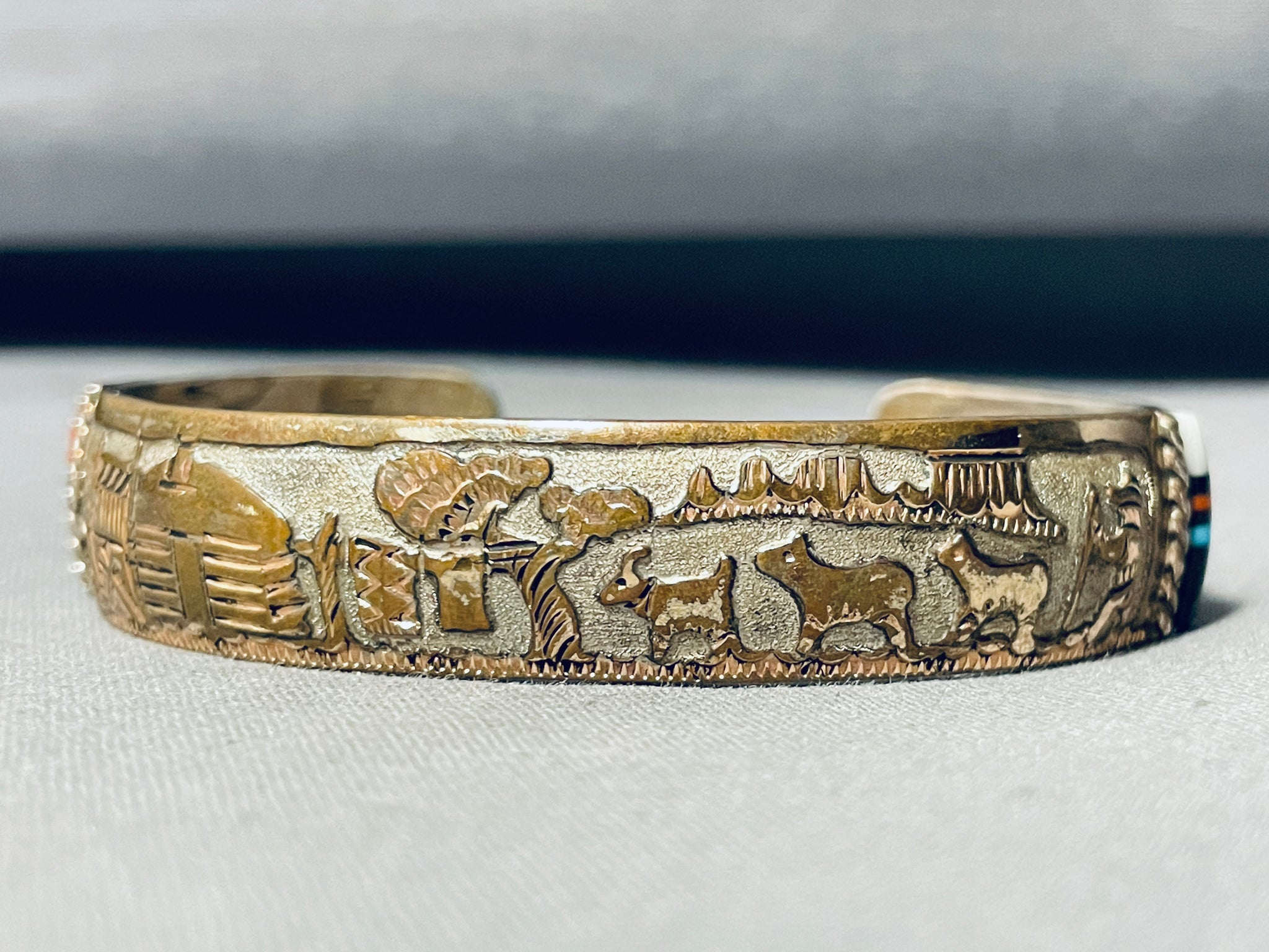 This is a superlative vintage Navajo inlaid Navajo scenery silver and gold cuff bracelet. This outstanding bracelet contains a fascinating detailed Navajo scenery. The scenery consists of a Native women weaving a rug, a hogan, laundry hung outside near a large tree, and a Native man hurding his cattle with a beautiful desert background scenery. Situated at each end of the bracelet are wonderful inlaid channel patterns that consist of coral, onyx, mother of pearl and Sleeping Beauty turquoise. Located on each end of the bracelet are sun, teepee and diamond patterns. The width of the bracelet measures around 1/2". Sterling silver and 12k gold, marked. The inside end to end measures around 5-3/4" with an additional 1" gap. Sturdy 23 grams.