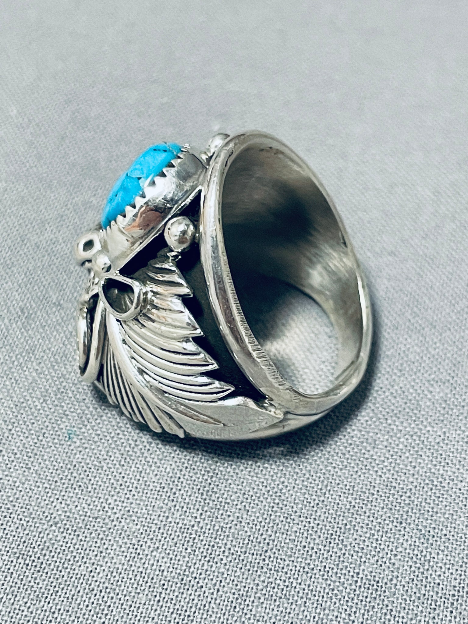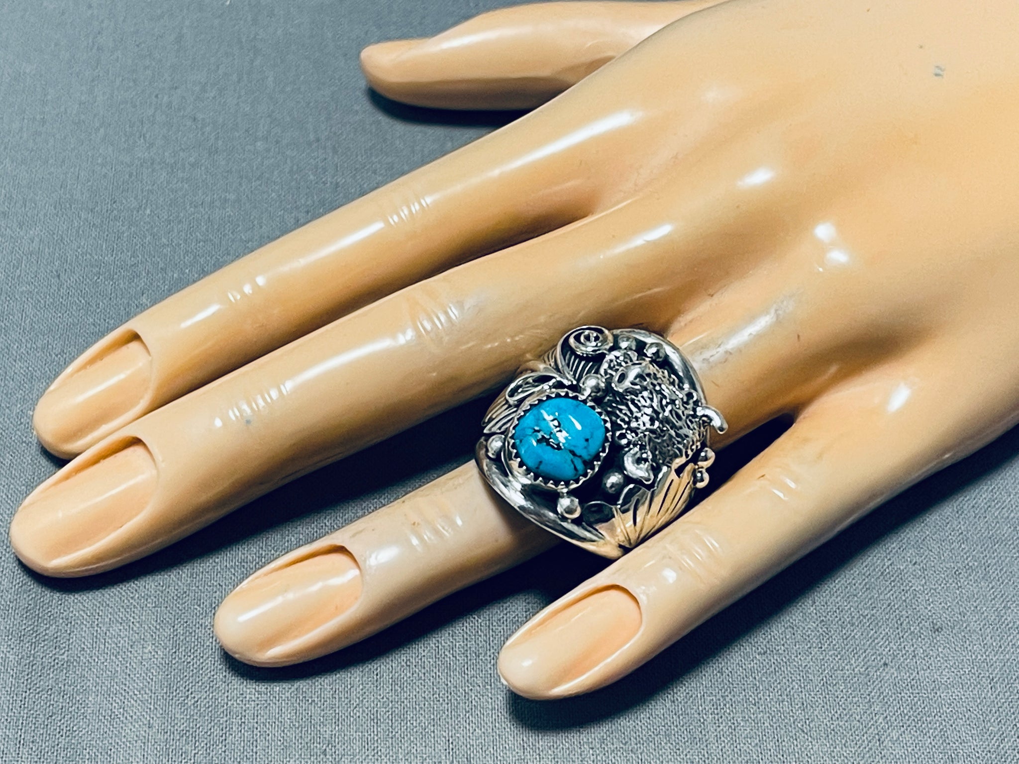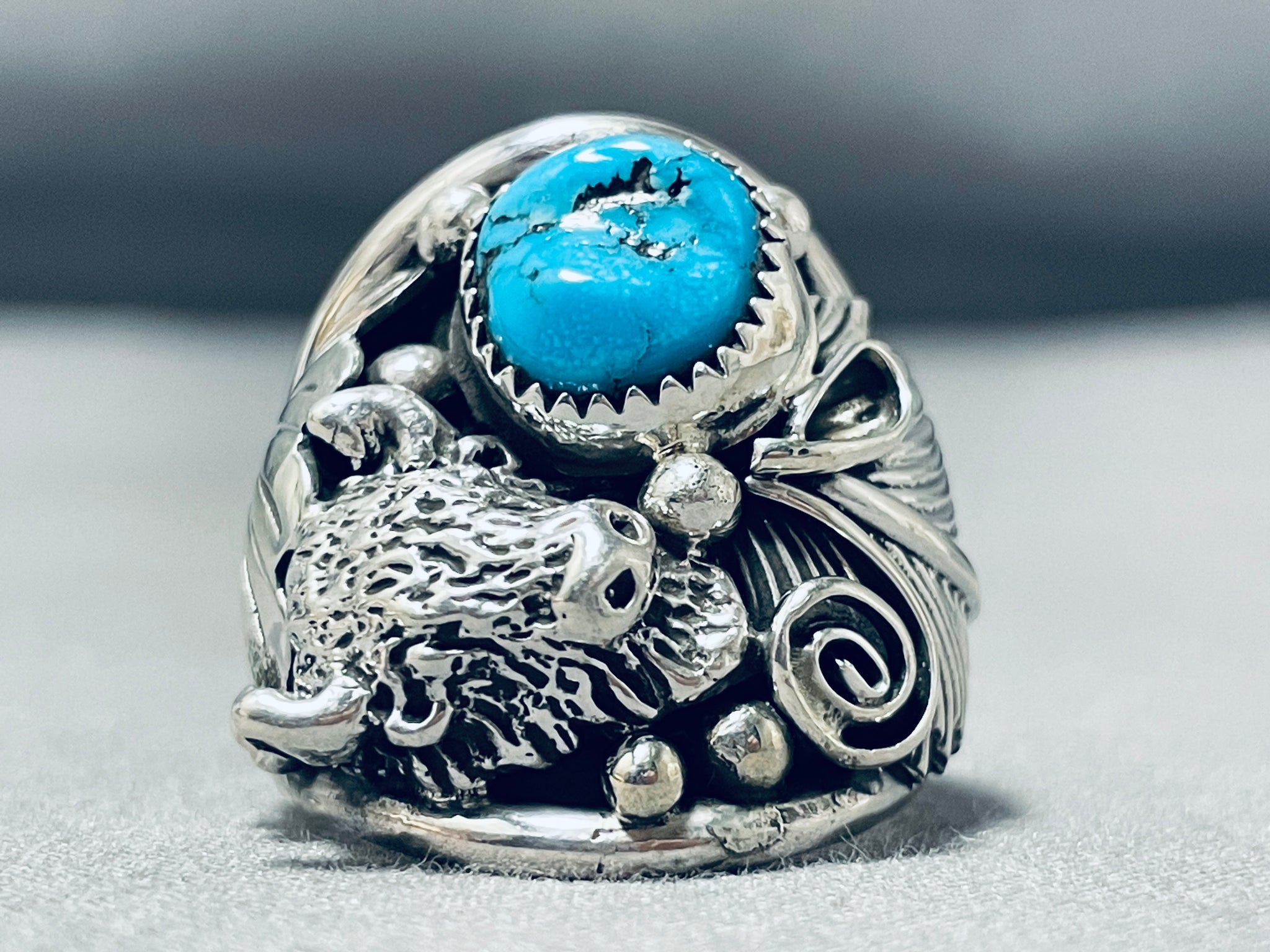 Astonishing Native American Navajo Kingman Turquoise Sterling Silver Buffalo Ring