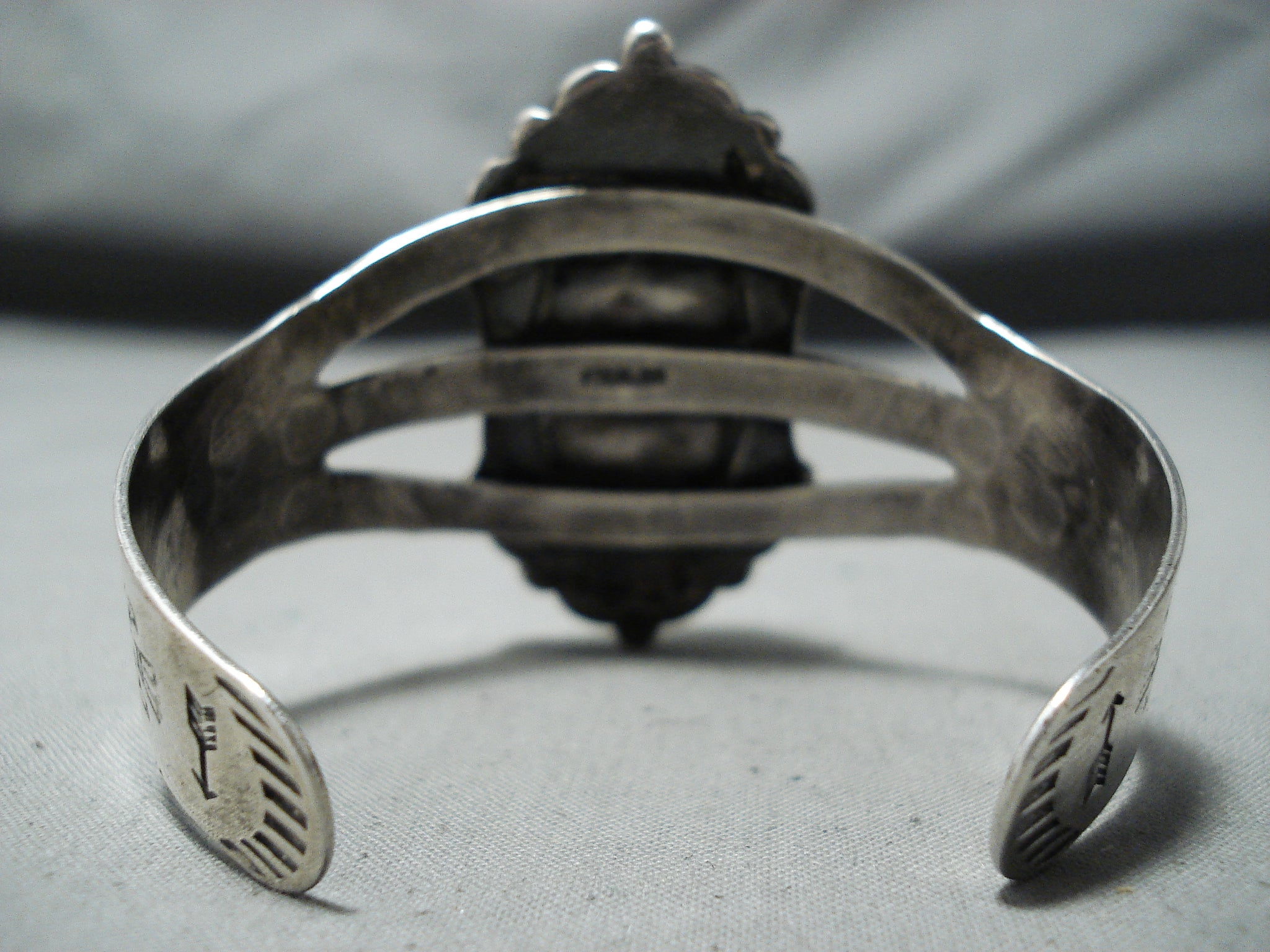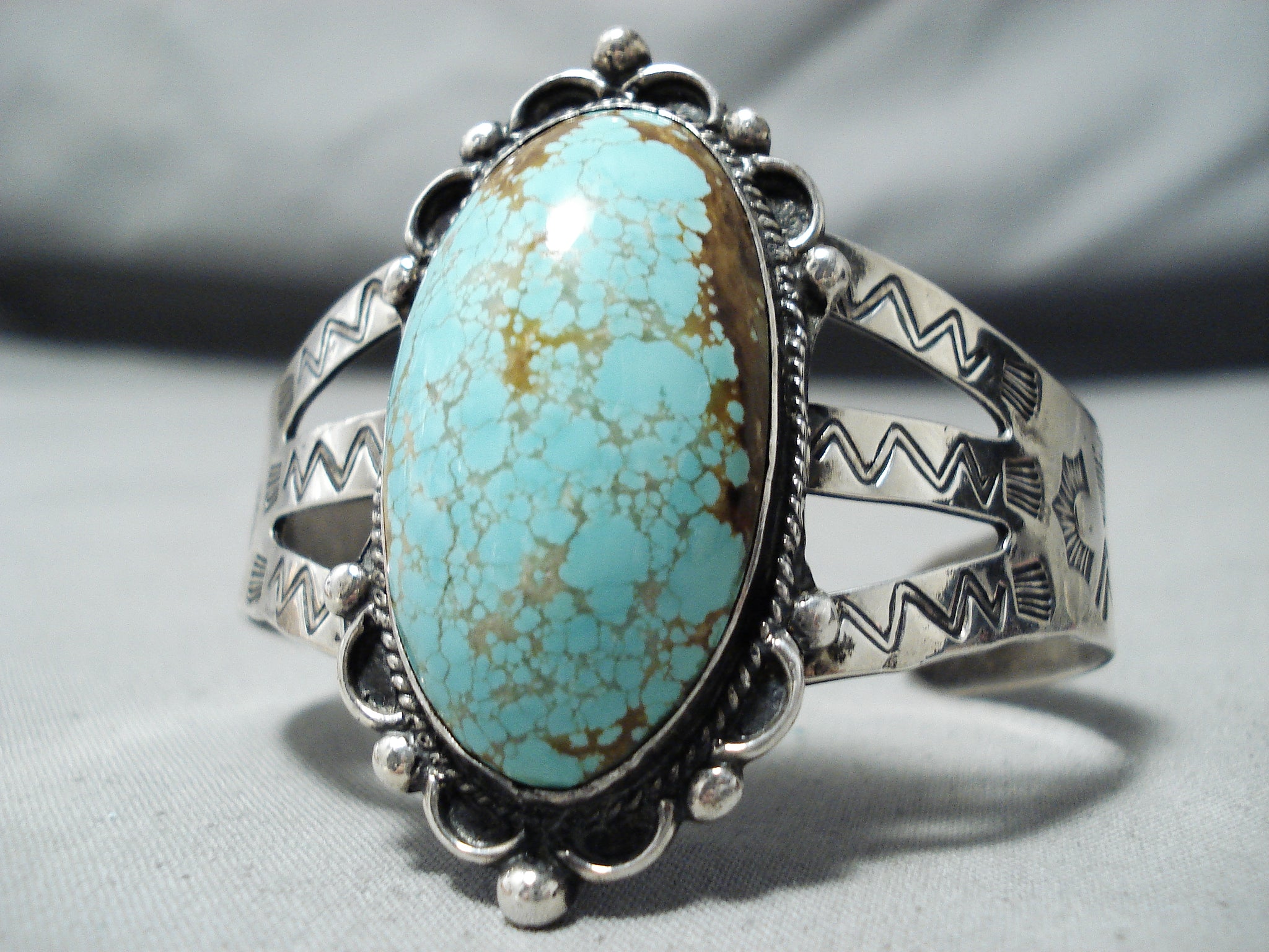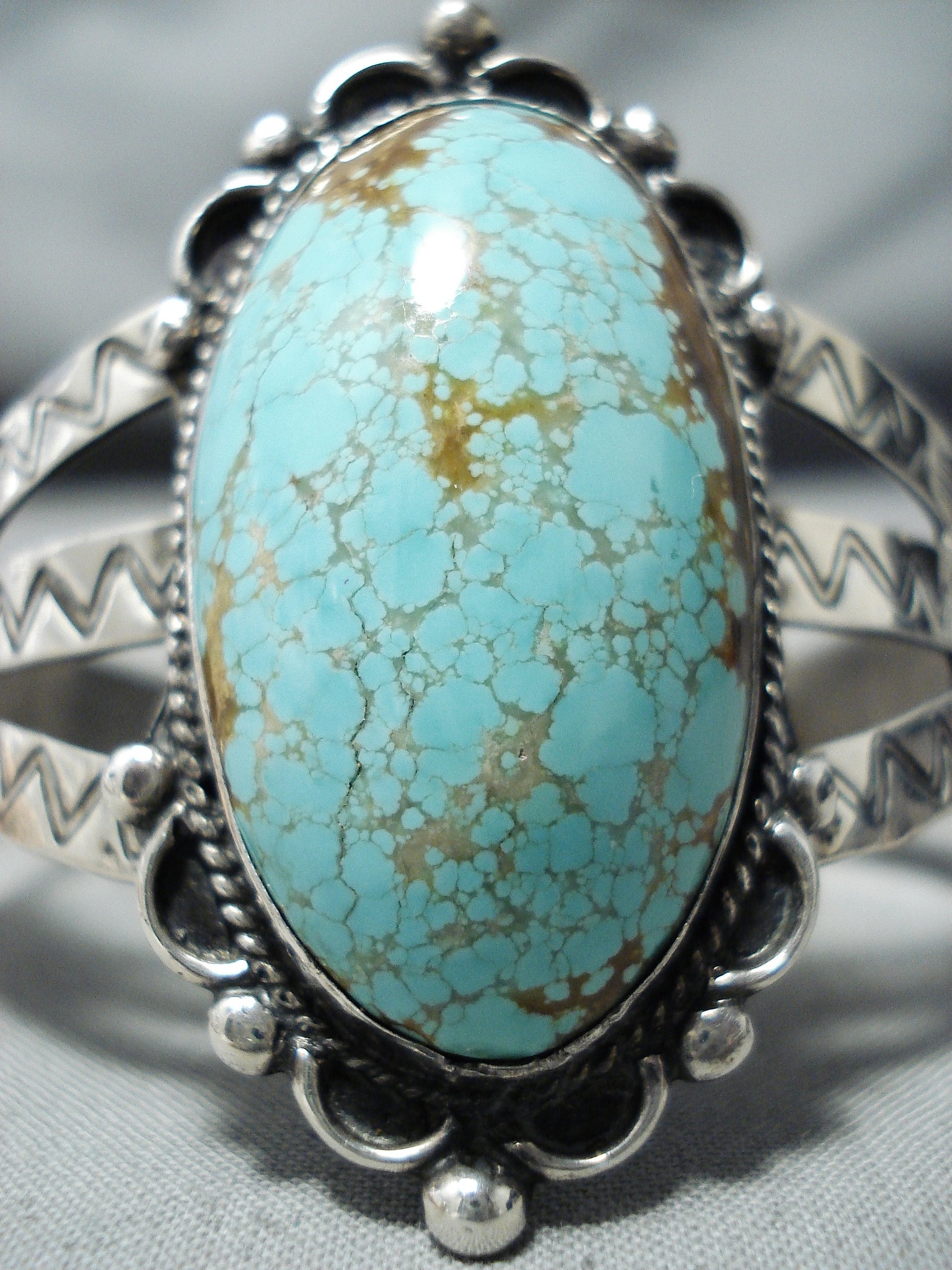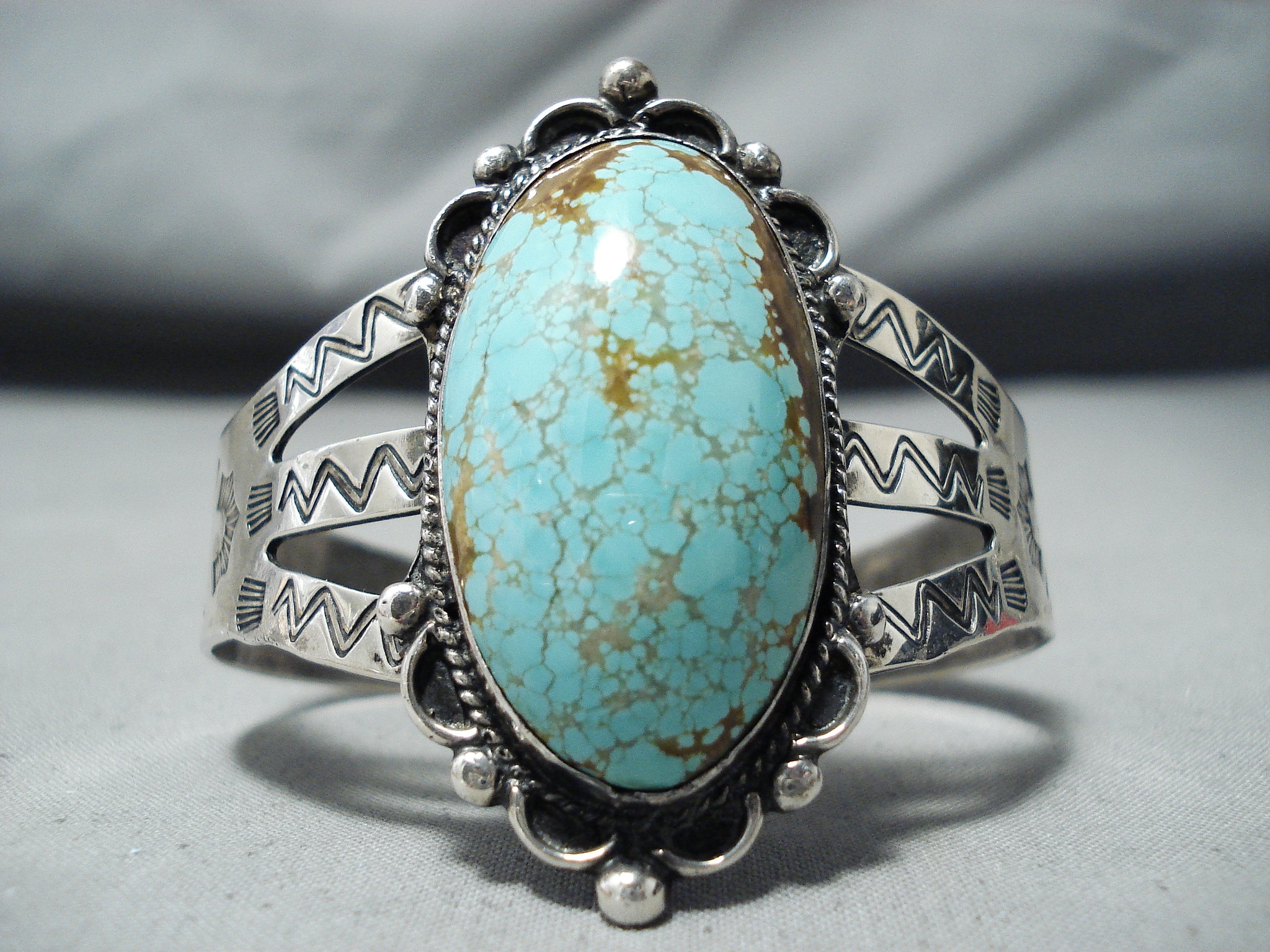 Up for sale is this fabulous Navajo silver bracelet having a large #8 turquoise oval dome surrounded by handcarved silver rope, silver scallops and silver beads! The bracelet has a handcarved graduated triple silver rail cuff with silver handstampings! Trully Amazing Piece! The center stone measures around 1-1/2" x 7/8". The width of the bracelet measures around 2". Sterling silver, marked. The inside end to end measures around 5-1/2" with an additional 1-1/4" gap. Sturdy 41 grams.
