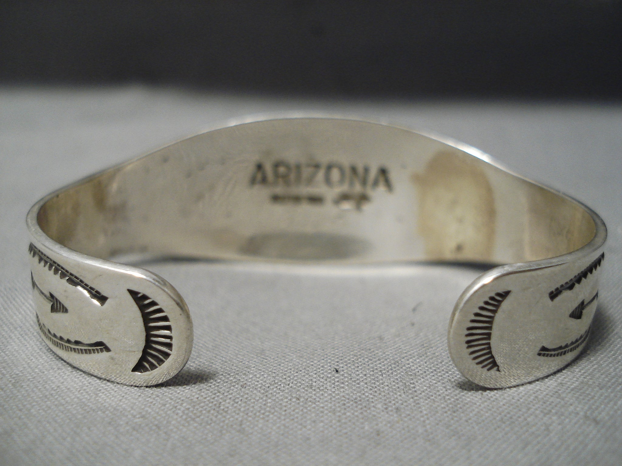 Here we have an astonishing vintage Navajo silver bracelet. The silver applique and handstamped arrows have done a fine job in accenting these 3 fabulous bright turquoise stones set at the wider face of the cuff. The center stone measures around 1/2" x 3/8". The width of the bracelet measures around 7/8". Signed by Navajo artist, H. Boyd. Sterling silver, marked. The inside end to end measures around 5-3/8" with an additional 7/8" gap. Sturdy 14 grams.