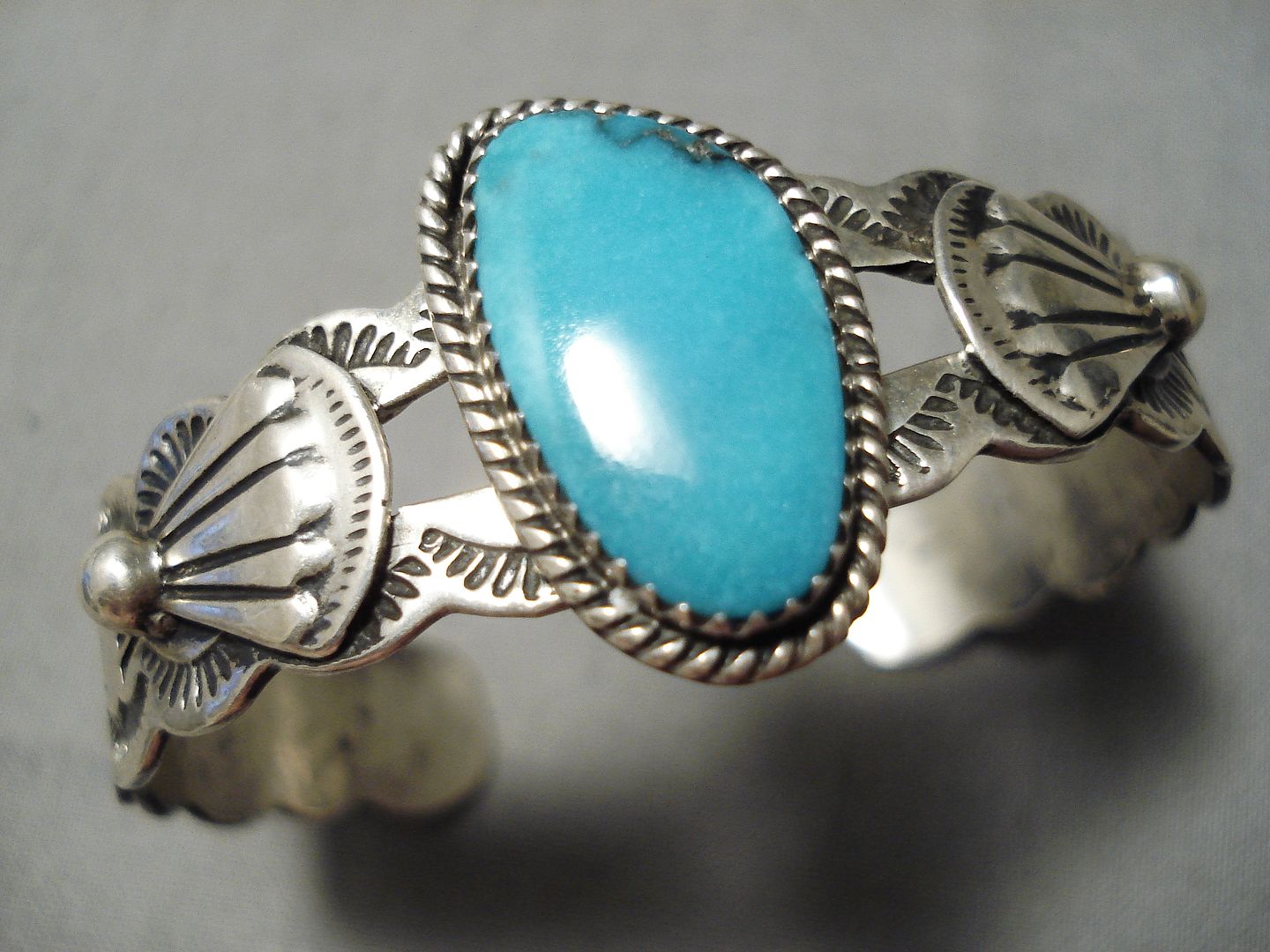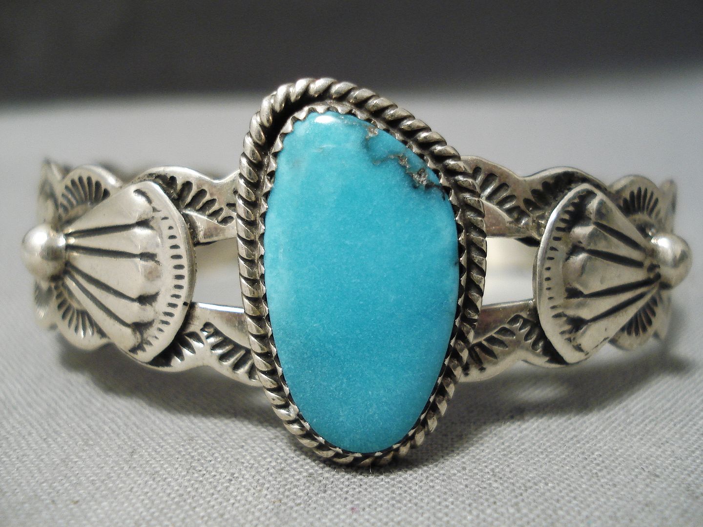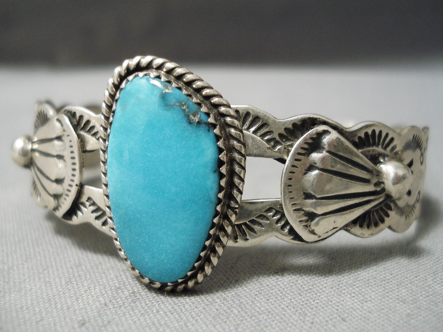 This is an astonishing vintage Navajo silver bracelet. Surrounded with silver rope and set at the heart of this wonderful scalloped cuff is the dynamic oval Carico Lake turquoise stone! Silver applique fans flank either side – and the bracelet is then completely decorated with handstamped designs. The center stone measures around 7/8" x 1/2". The width of the bracelet measures around 7/8". Signed by Navajo artist, Lester James. Sterling silver, marked. The inside end to end measures around 5-3/8" with an additional 1" gap. Sturdy 22 grams.