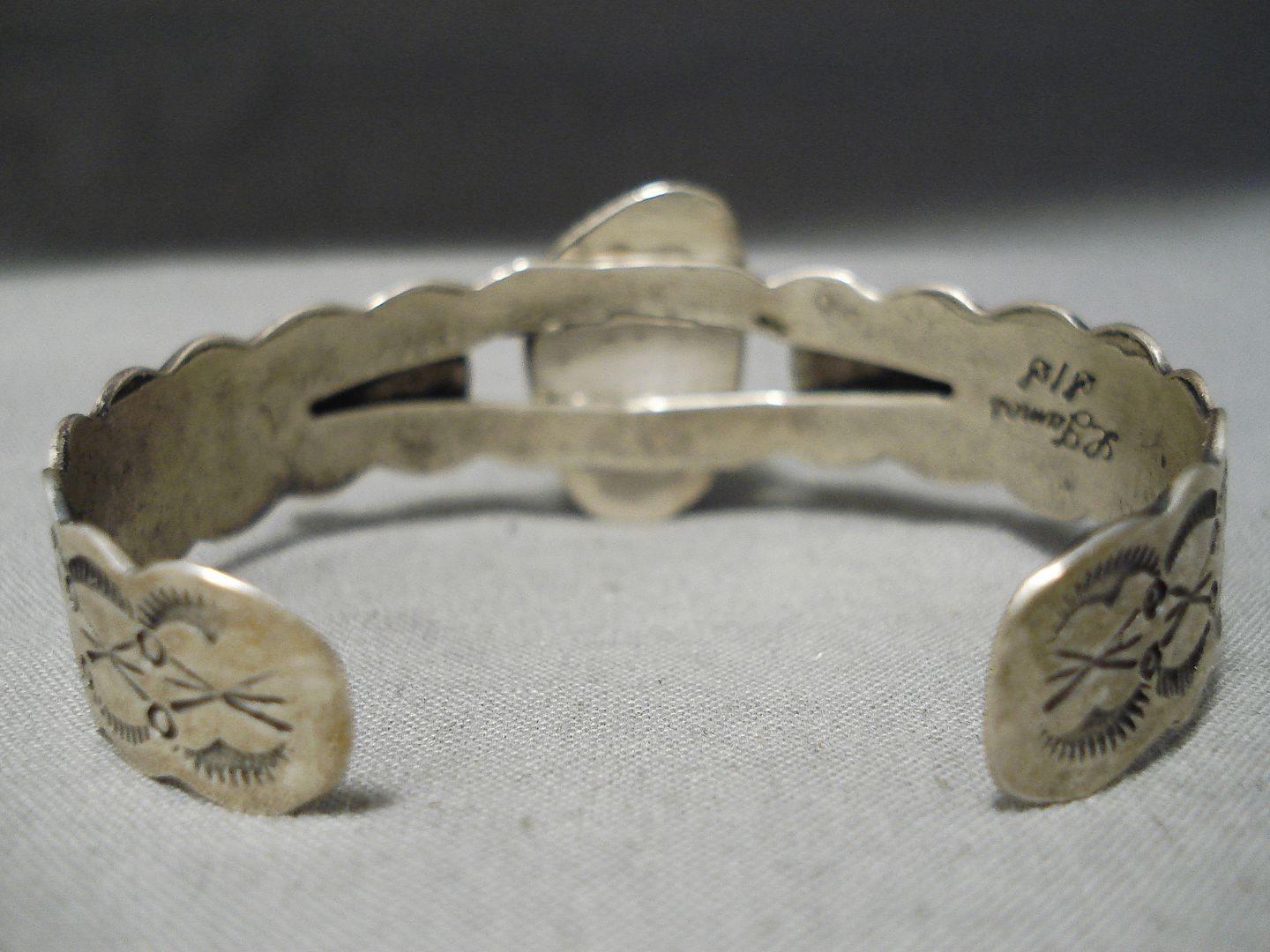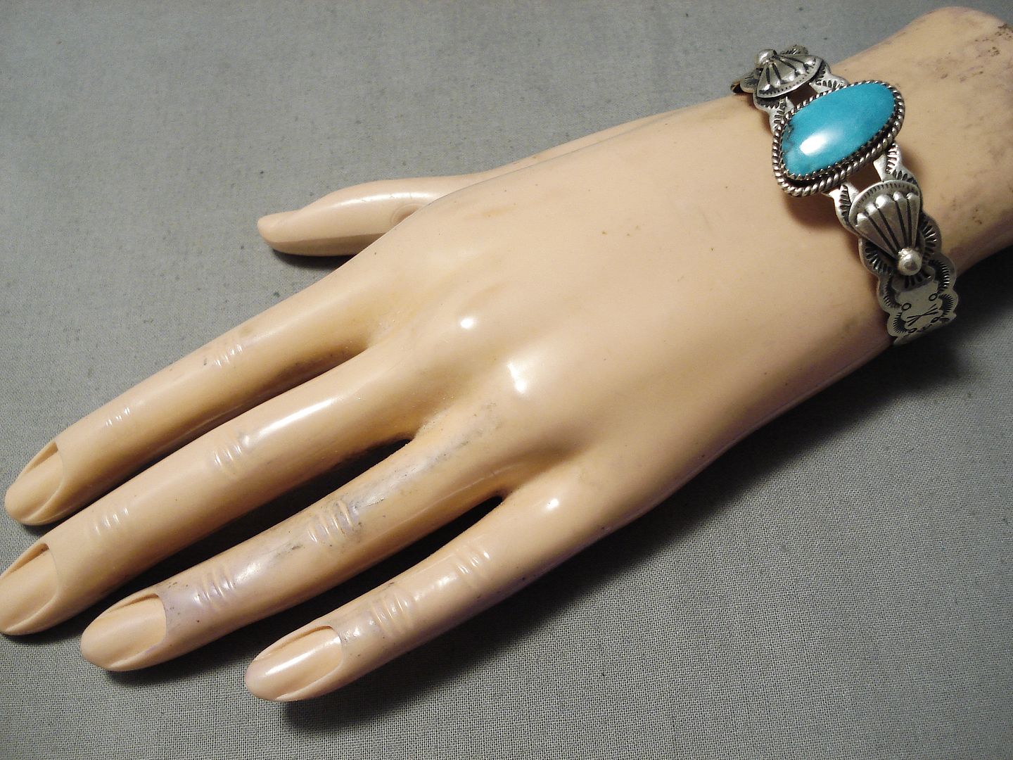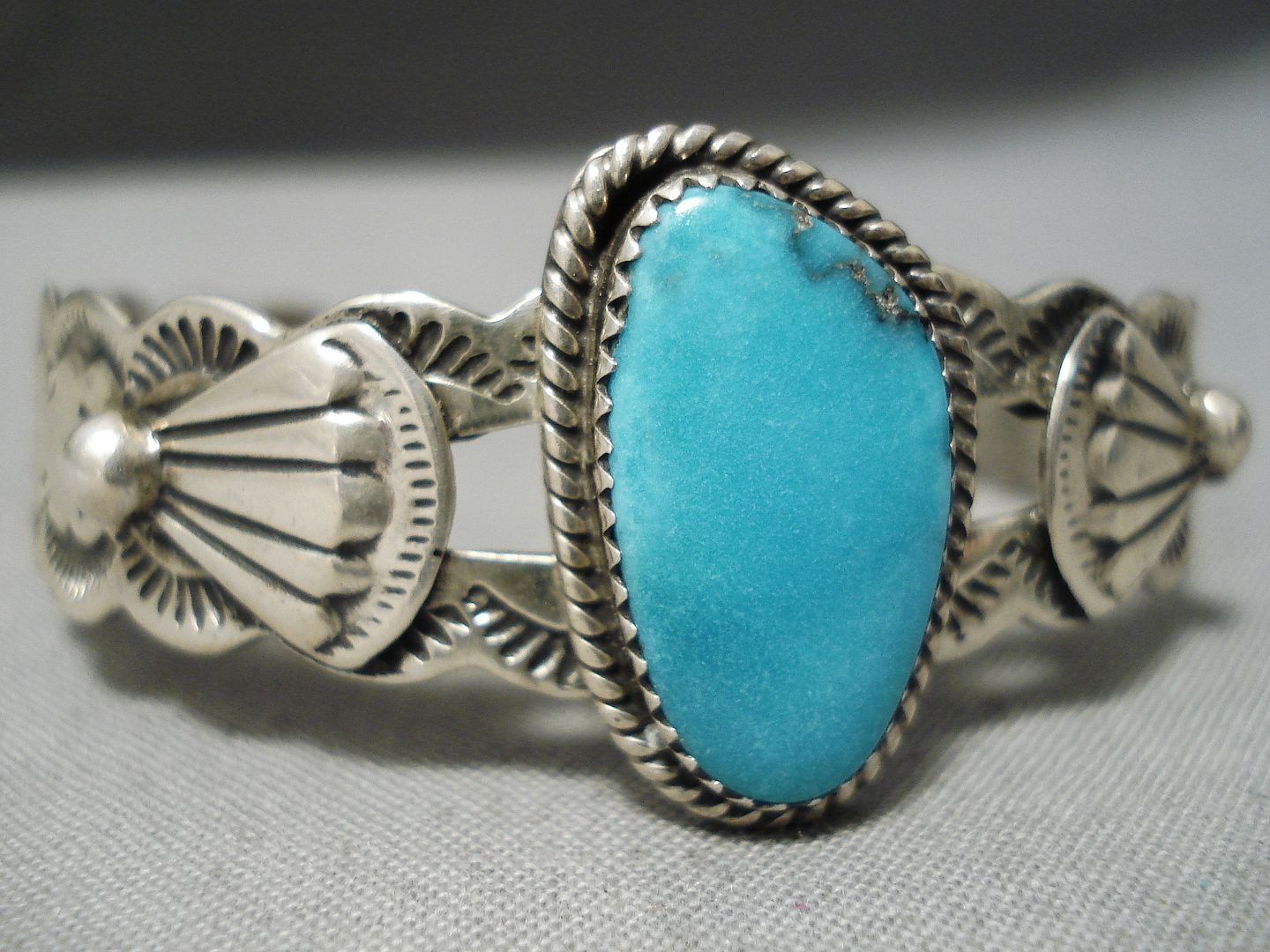 This is an astonishing vintage Navajo silver bracelet. Surrounded with silver rope and set at the heart of this wonderful scalloped cuff is the dynamic oval Carico Lake turquoise stone! Silver applique fans flank either side – and the bracelet is then completely decorated with handstamped designs. The center stone measures around 7/8" x 1/2". The width of the bracelet measures around 7/8". Signed by Navajo artist, Lester James. Sterling silver, marked. The inside end to end measures around 5-3/8" with an additional 1" gap. Sturdy 22 grams.