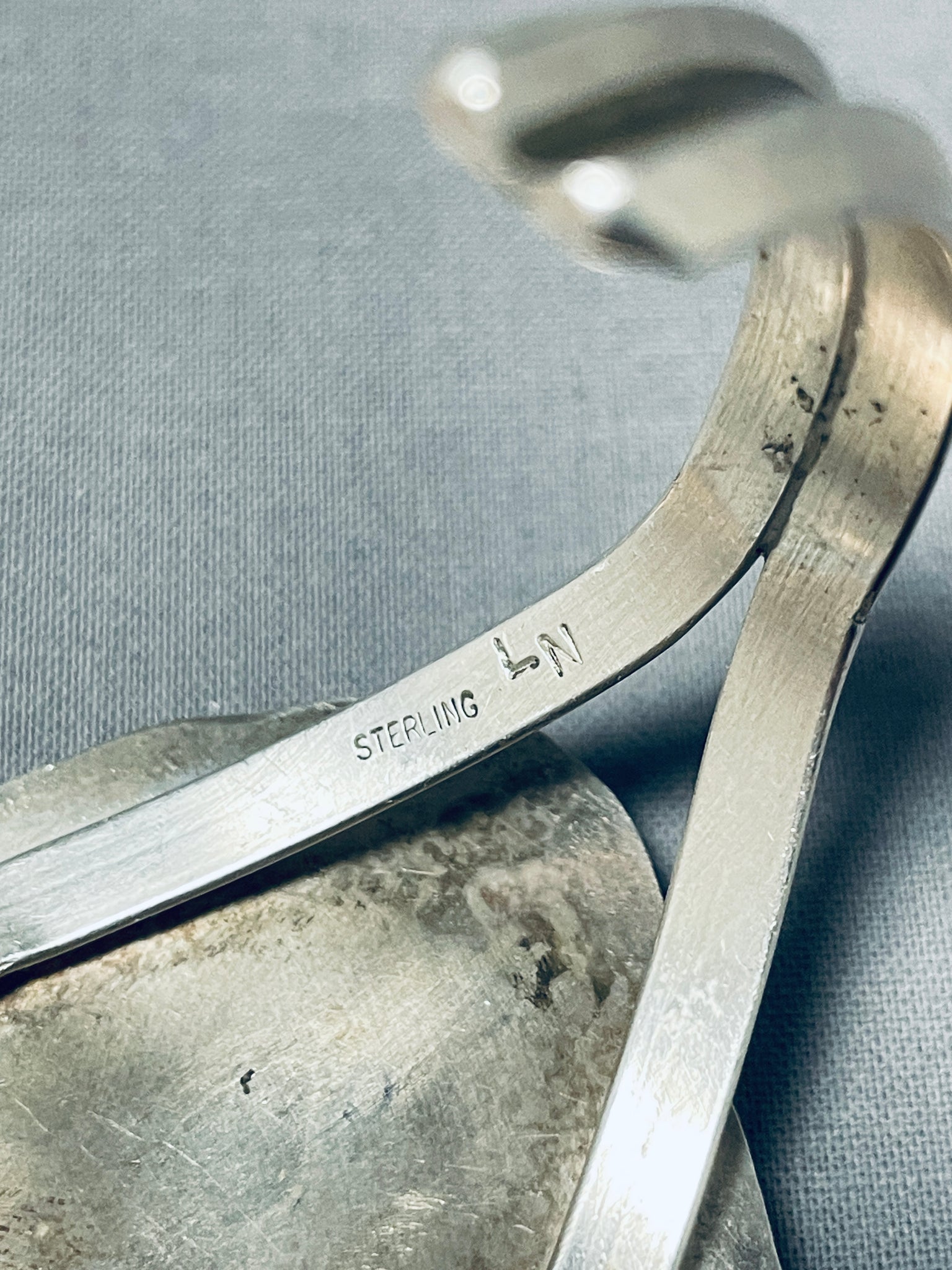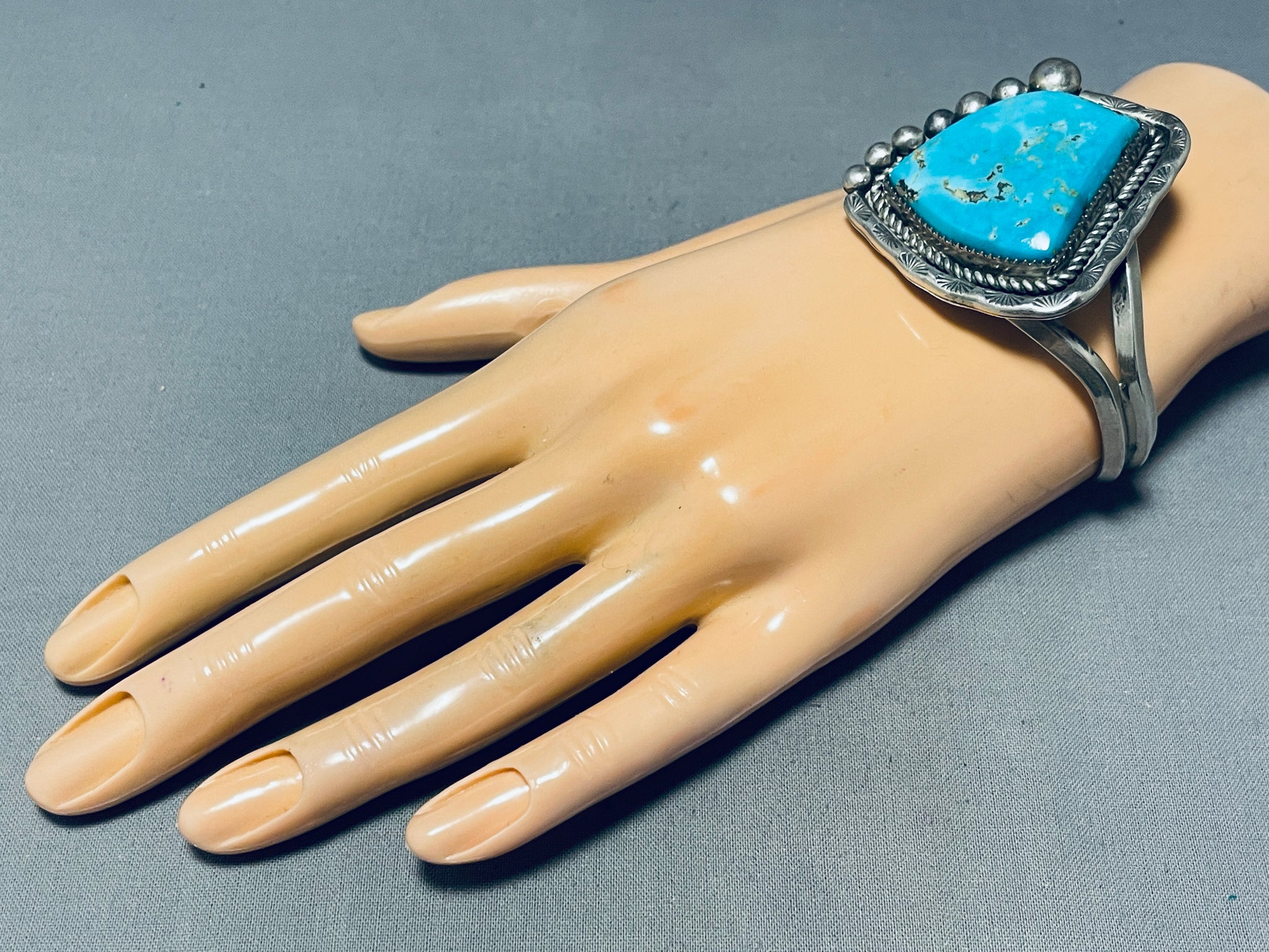 An exceptional vintage Navajo silver bracelet. Such a jaw-dropping huge Blue Gem turquoise stone! It's surrounded with thick silver rope and then a fabulous handstamped border and silver balls! The beveled double rails are split at the sides to host the wonderful turquoise station! Blue Gem turquoise is a highly sought-after variety of turquoise that originates from the Blue Gem mine in Nevada, USA. It is known for its vibrant blue color and often exhibits a fine black matrix running through the stone, adding to its beauty. It's been treasured by Native American tribes for centuries and is highly valued by collectors and jewelry enthusiasts due to its rarity and distinctive color. The center stone measures around 1-3/8" x 1-1/8". The width of the bracelet measures around 2". Sterling silver. The inside end to end measures around 5-7/8" with an additional 1-1/8" gap. Sturdy 50 grams.
