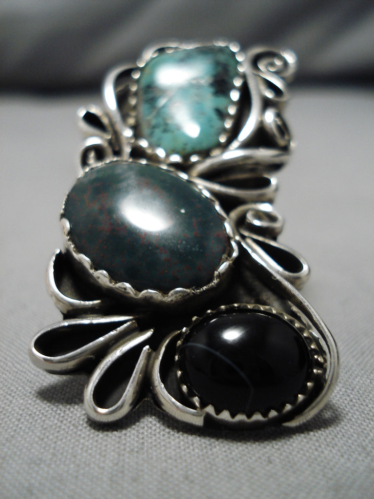This is an astounding vintage Navajo silver ring. Nestled among silver swirls, this is a big, bold, beautiful ring that boasts 3 intense stones of dramatic turquoise and jet! It has a double rail band. The largest stone measures around 3/4" x 1/2". The ring face measures around 1-7/8" x 1". Signed by Navajo artist, Liz P.M.. The ring size is around 8-1/2. Sterling silver, marked. Sturdy 18 grams.