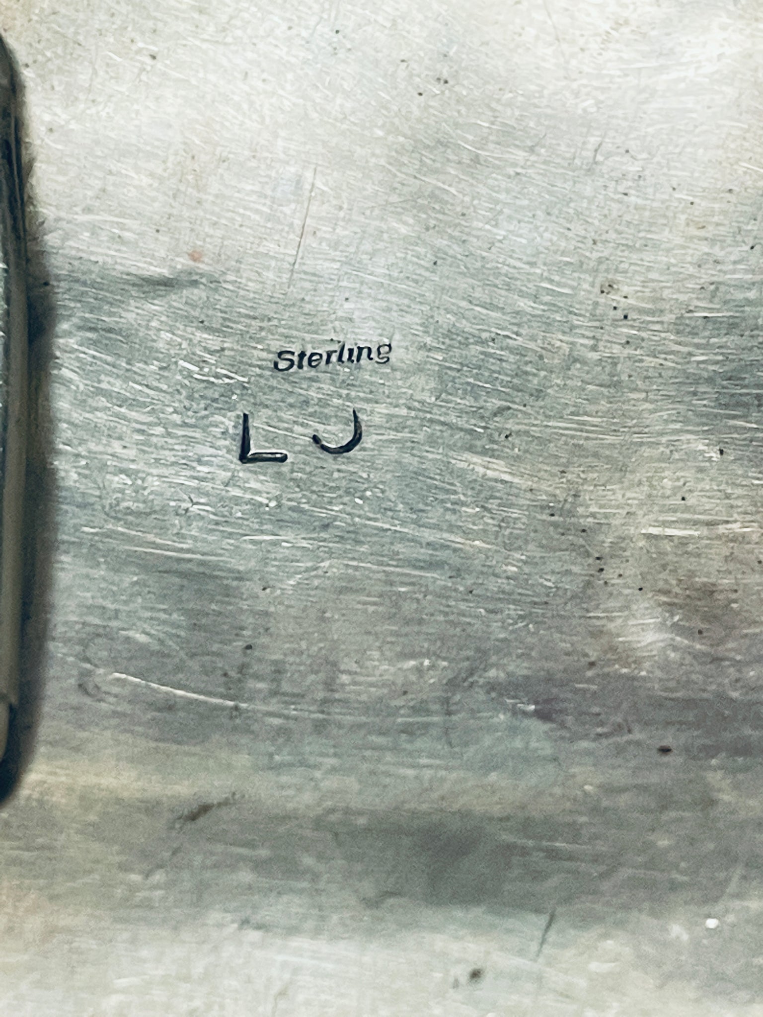 This is an incredible vintage Navajo silver buckle. Floating among silver bubbles, these 26 (wow!) dramatic Kingman turquoise stones have created quite a show-stopping belt buckle! It will fit belts 1-1/2" or less. The largest stone measures around 1/2" x 1/4". Sterling silver, marked. Signed by Navajo artist, Lest James. The buckle measures around 3-1/2" x 2-3/4". Sturdy 92 grams.