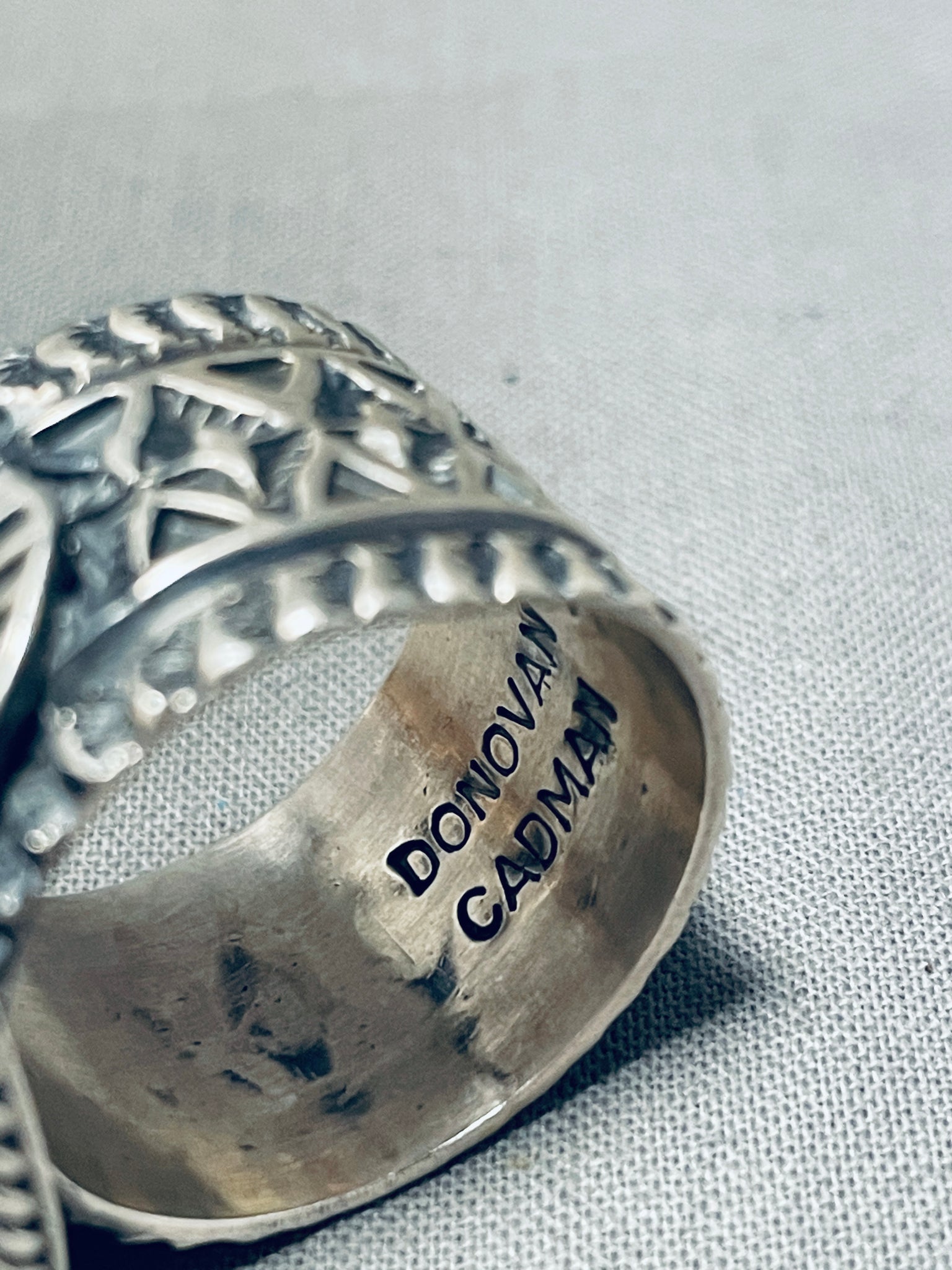Here we have an amazing vintage Navjao silver ring. What a statement ring! The excellent, large domed Candelaria turquoise stone is surrounded with an amazing handstamped crown setting as it then sets proudly upon the wide, detailed band! Candelaria turquoise is a highly prized and sought-after variety of turquoise that comes from the Candelaria mine in Nevada, USA. The Candelaria mine has a long history of producing exceptional turquoise, and it has been a source of this prized gemstone for centuries. The mine is located in an area rich in copper deposits, which contributes to the unique colors and matrix formations found in Candelaria turquoise. The center stone measures around 3/4" x 3/4". The ring face measures around 15/16" x 7/8". Signed by Navajo artist, Donovan Cadman. The ring size is around 12. Cir. 1990's+. Sterling silver, marked. Sturdy 20 grams.