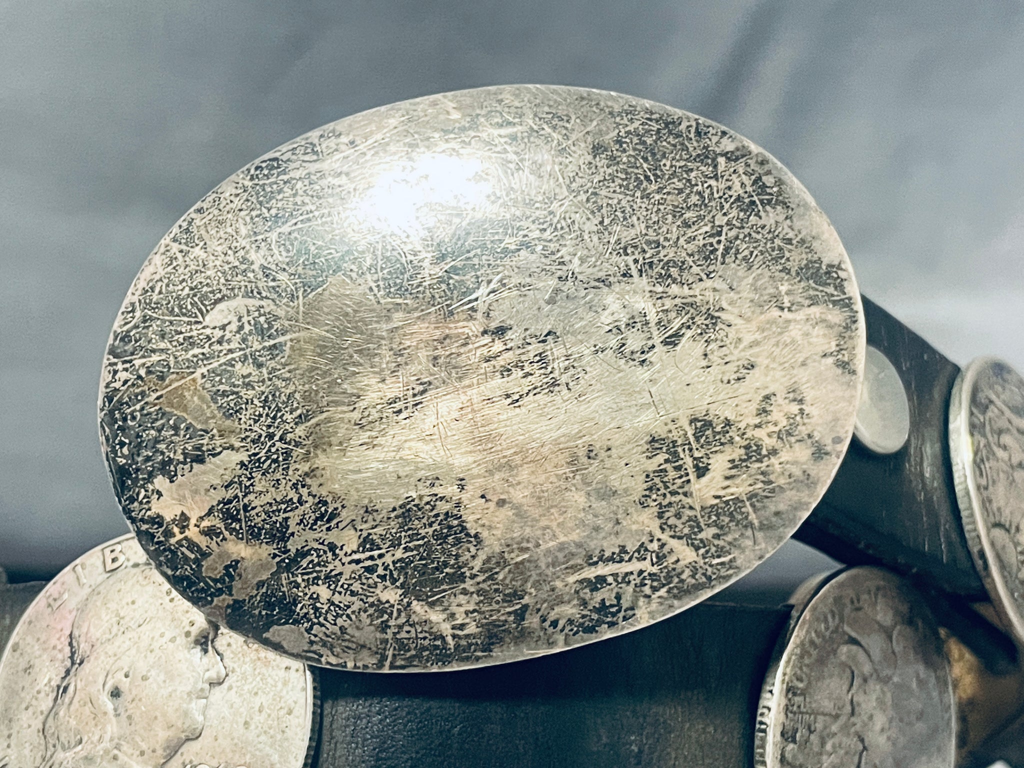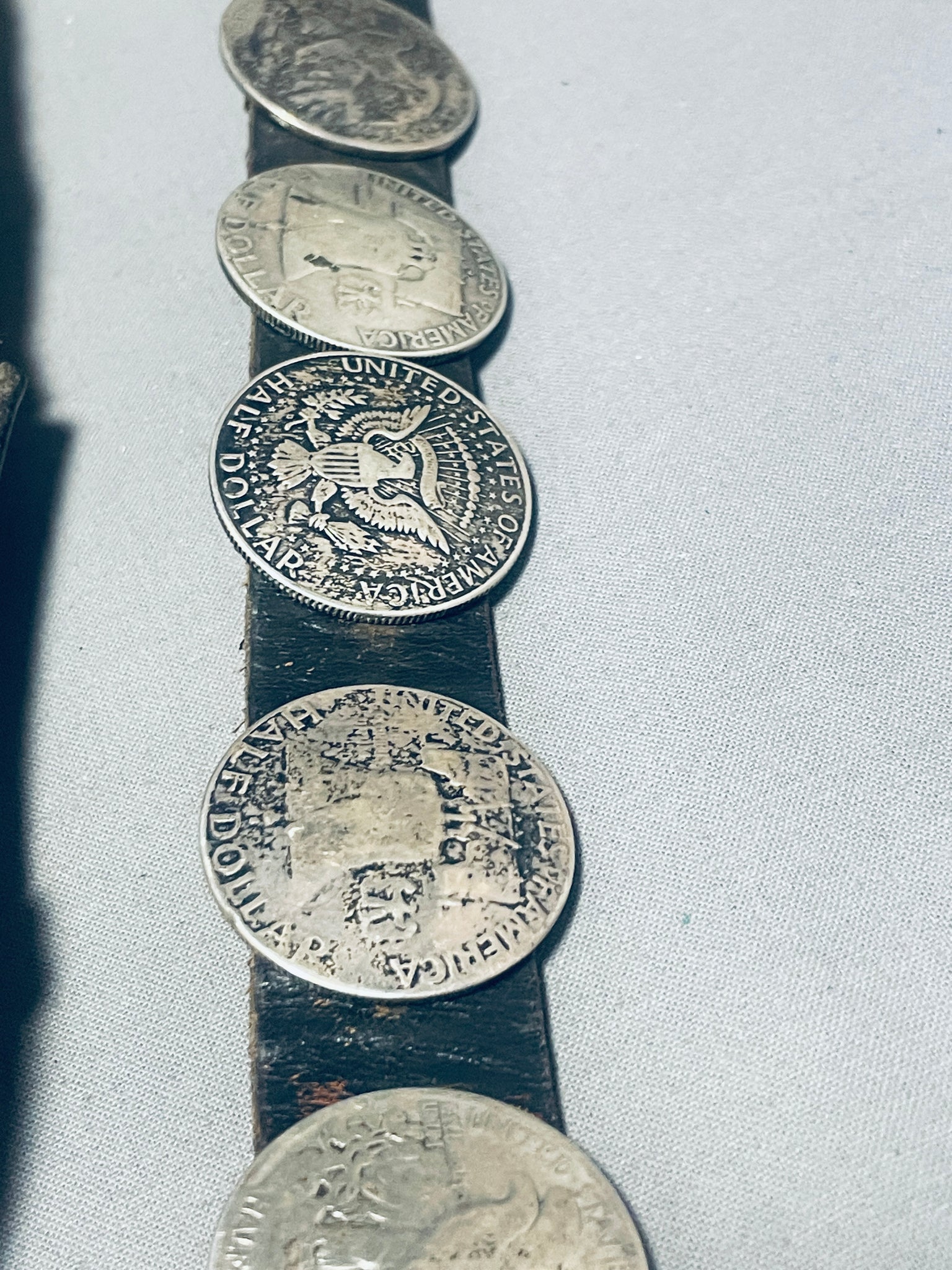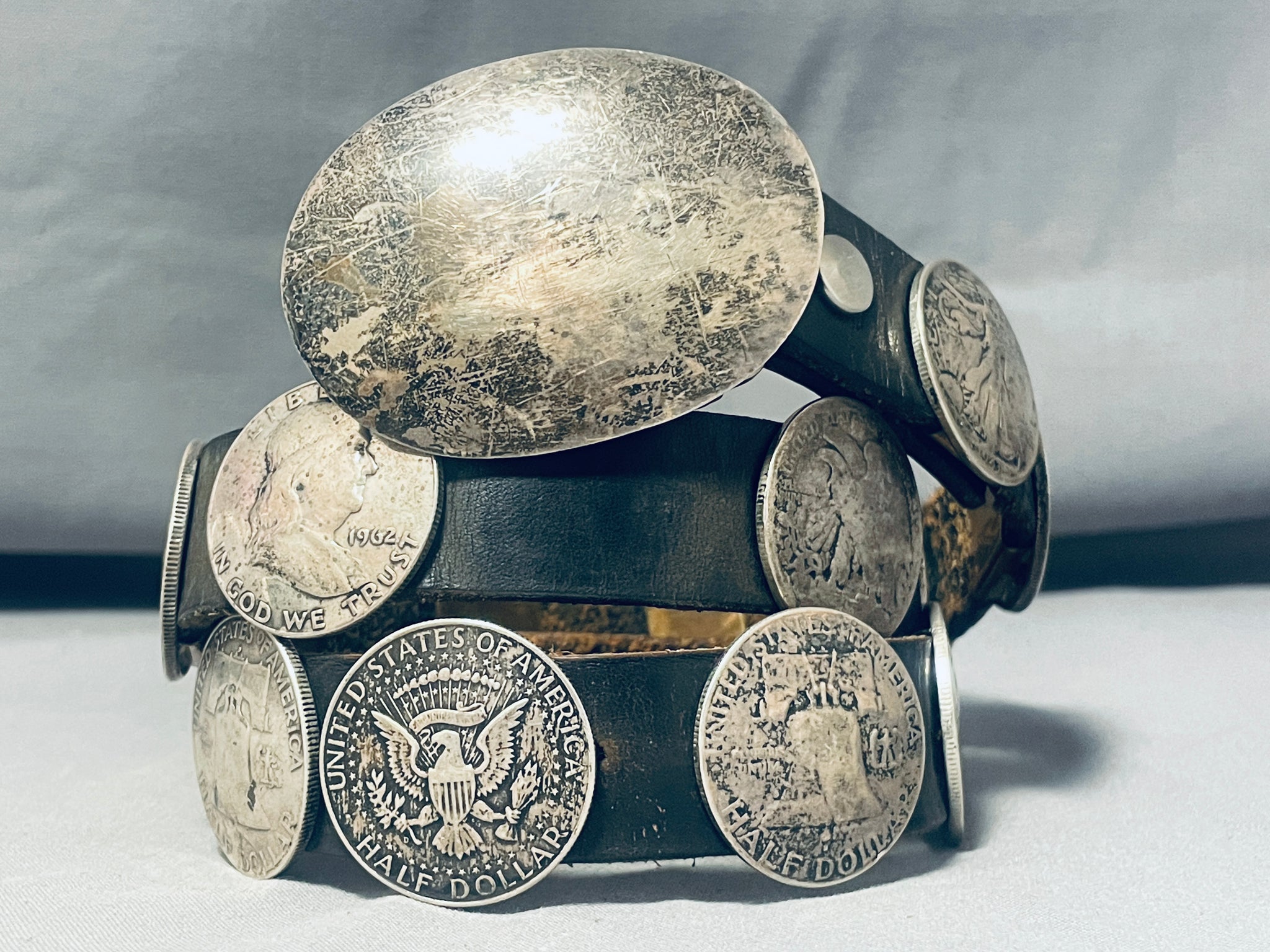 We are proud to offer this magnificent vintage Navajo silver concho. Wow! This is such a superior 7/8" leather concho belt of 17(!) vintage U.S. half dollars that range from 1943+! Each of the half dollars has a wide, secure copper retainer at the back and slide along the belt to be arranged at your choice. The concho has a large, oval silver buckle and the max length of the concho belt is about 31", with the minimum length up to you. This is truly a one-of-a-kind concho belt hosting a piece of history! Incredible! The concho is a distinctive style of jewelry and is a significant element in Native American jewelry, particularly in Southwestern Native American traditions. Concho jewelry has a rich history in Native American cultures, particularly among tribes in the Southwestern United States. Each concho measures around 2-3/8" x 1-7/8". Both Sterling silver, marked and Coin silver. Sturdy 312 grams.