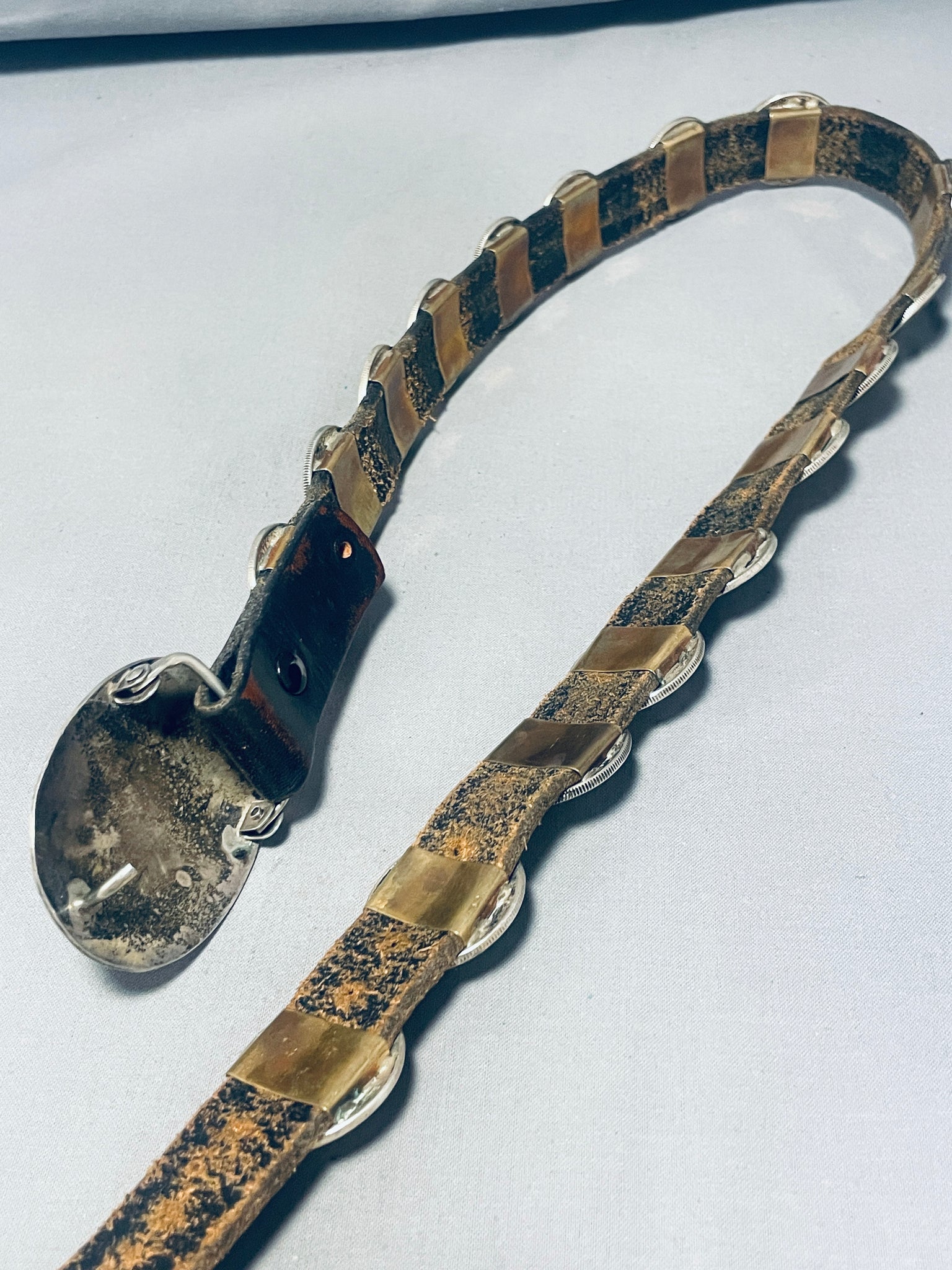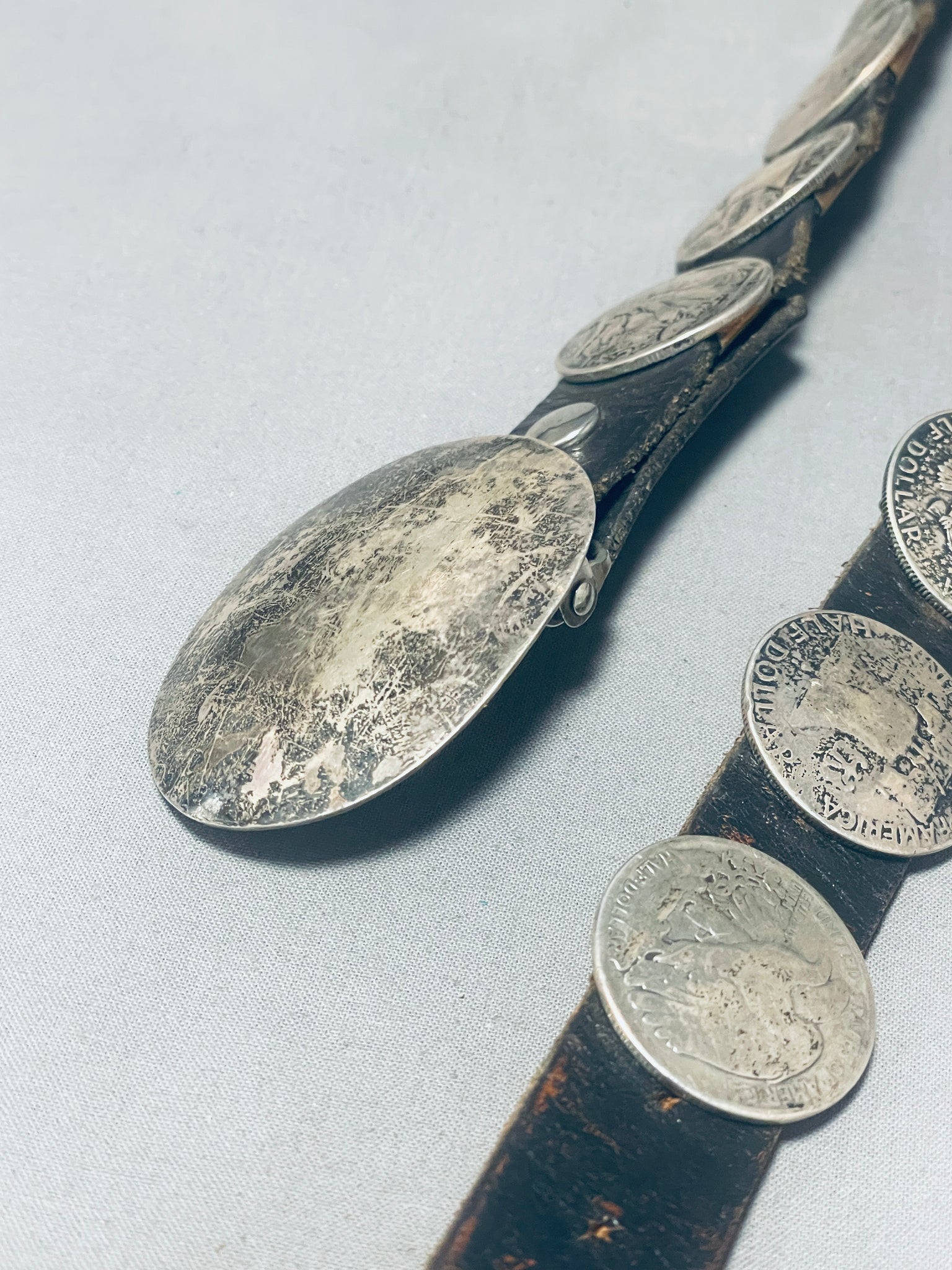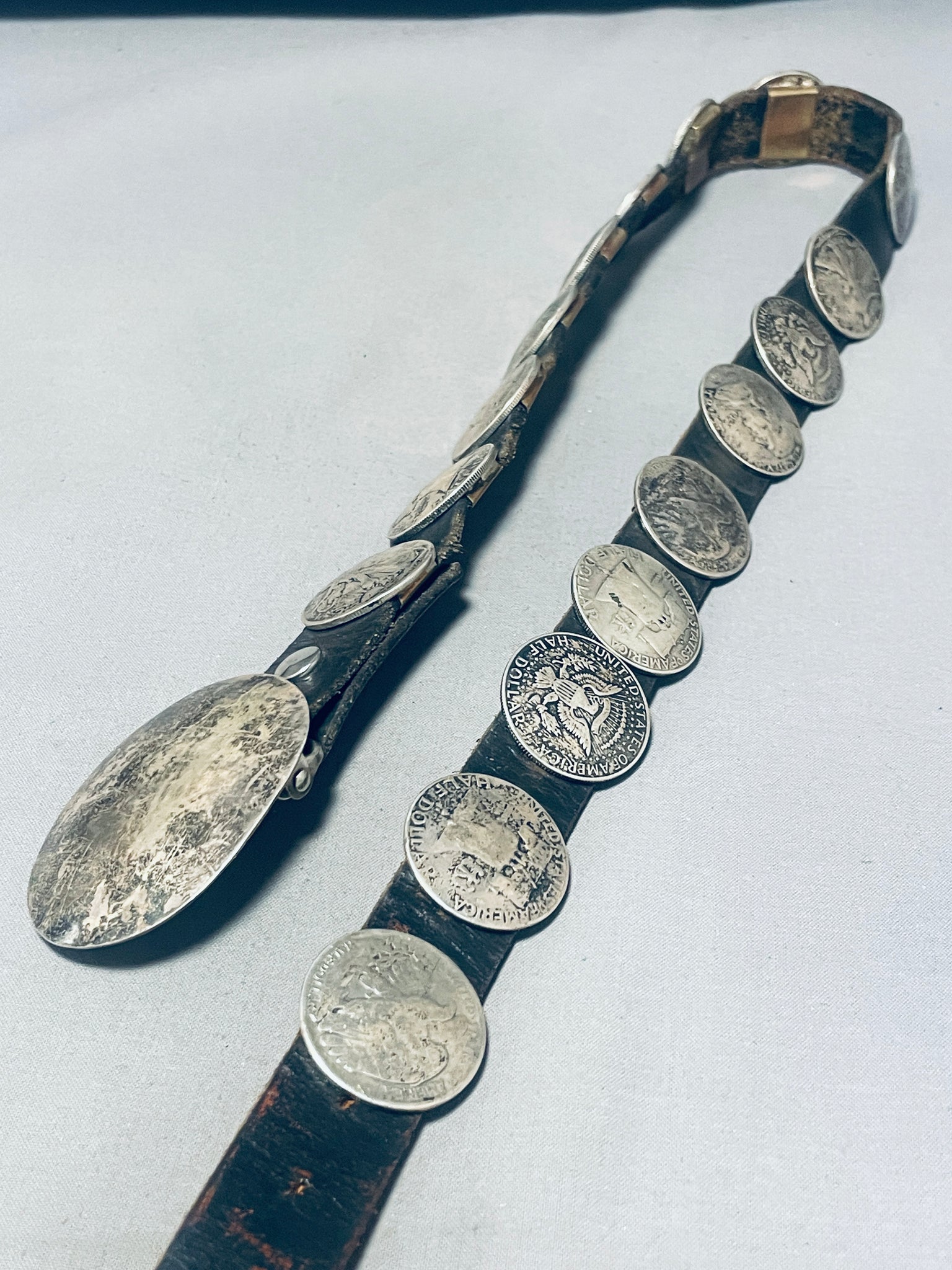 We are proud to offer this magnificent vintage Navajo silver concho. Wow! This is such a superior 7/8" leather concho belt of 17(!) vintage U.S. half dollars that range from 1943+! Each of the half dollars has a wide, secure copper retainer at the back and slide along the belt to be arranged at your choice. The concho has a large, oval silver buckle and the max length of the concho belt is about 31", with the minimum length up to you. This is truly a one-of-a-kind concho belt hosting a piece of history! Incredible! The concho is a distinctive style of jewelry and is a significant element in Native American jewelry, particularly in Southwestern Native American traditions. Concho jewelry has a rich history in Native American cultures, particularly among tribes in the Southwestern United States. Each concho measures around 2-3/8" x 1-7/8". Both Sterling silver, marked and Coin silver. Sturdy 312 grams.