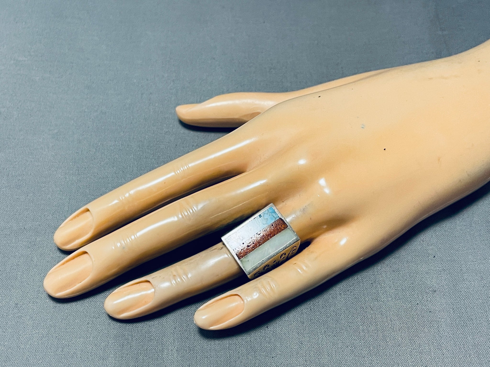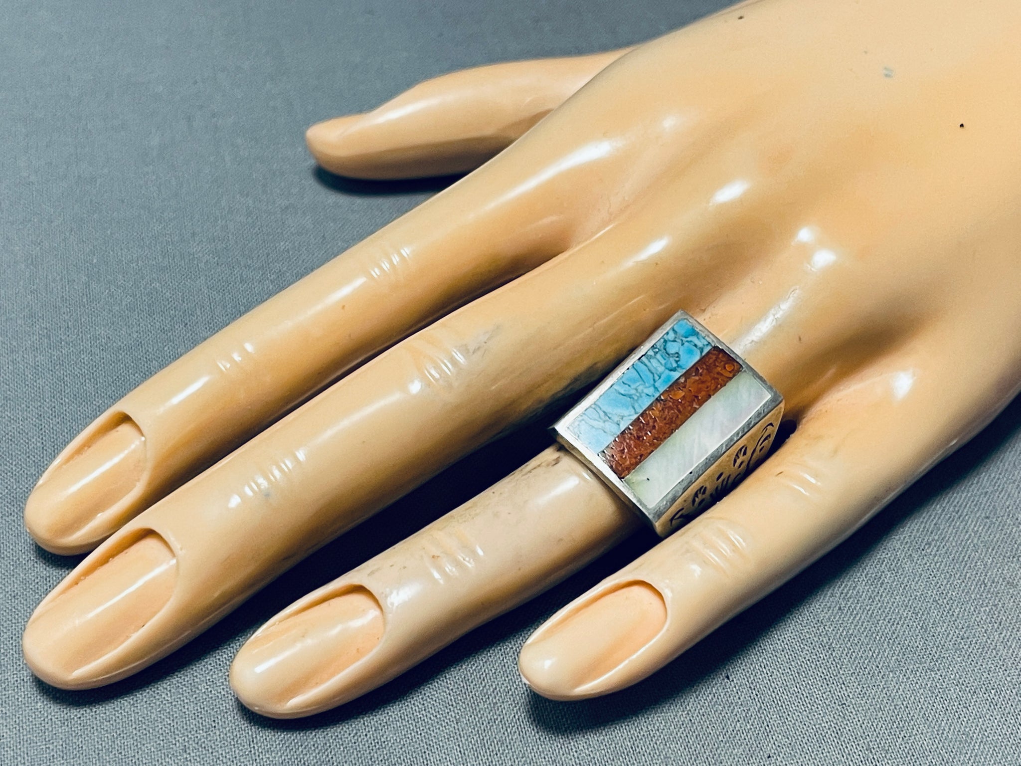 A superior vintage Navajo silver ring. Vertical columns of inlay turquoise, coral and mother of pearl make up the unique face of this wide ring, as incredible handstamped designs decorate the sides of the band! The ring face measures around 7/8" x 3/4". The ring size is around 7-1/2. Sterling silver. Sturdy 16 grams.