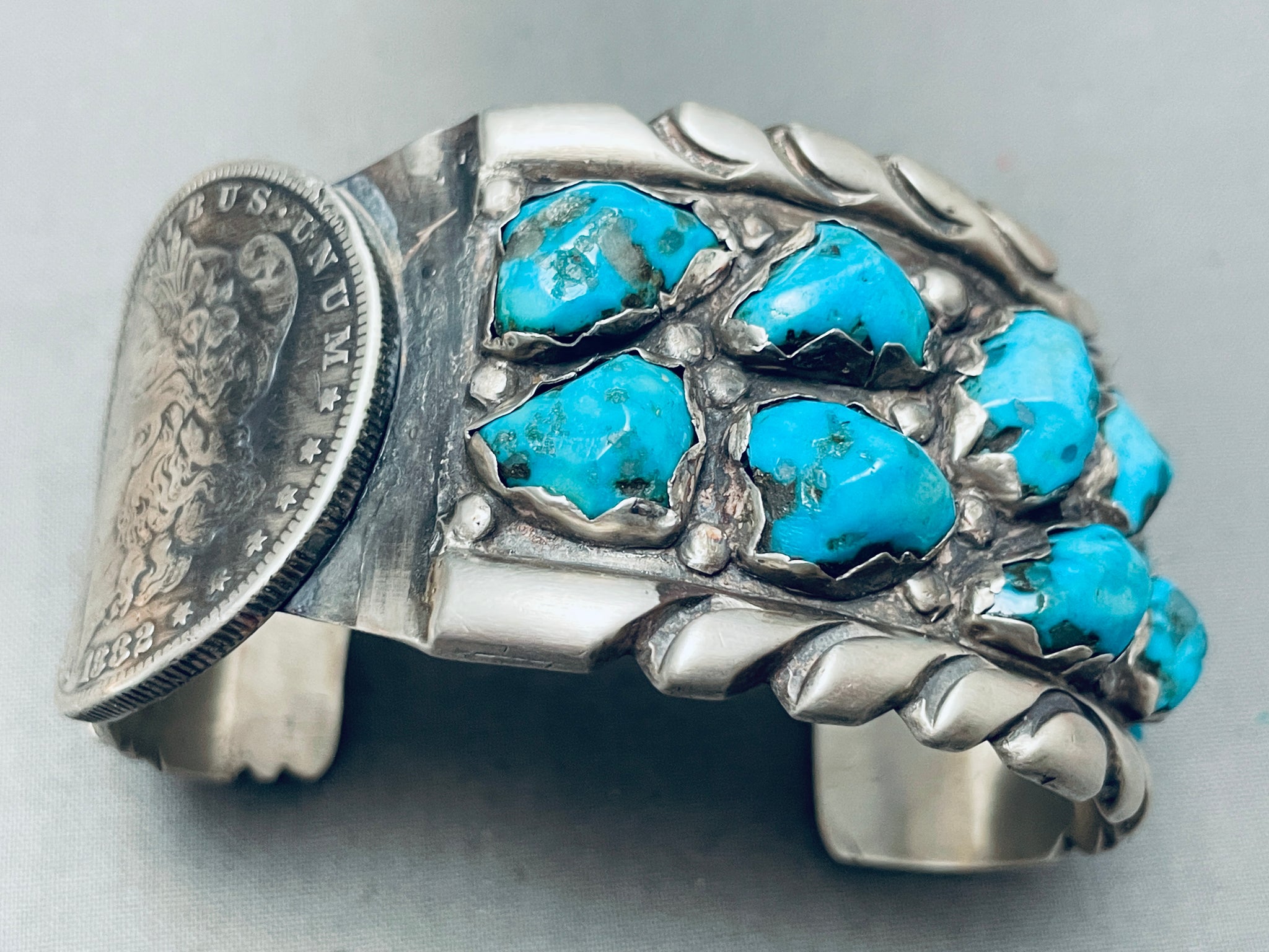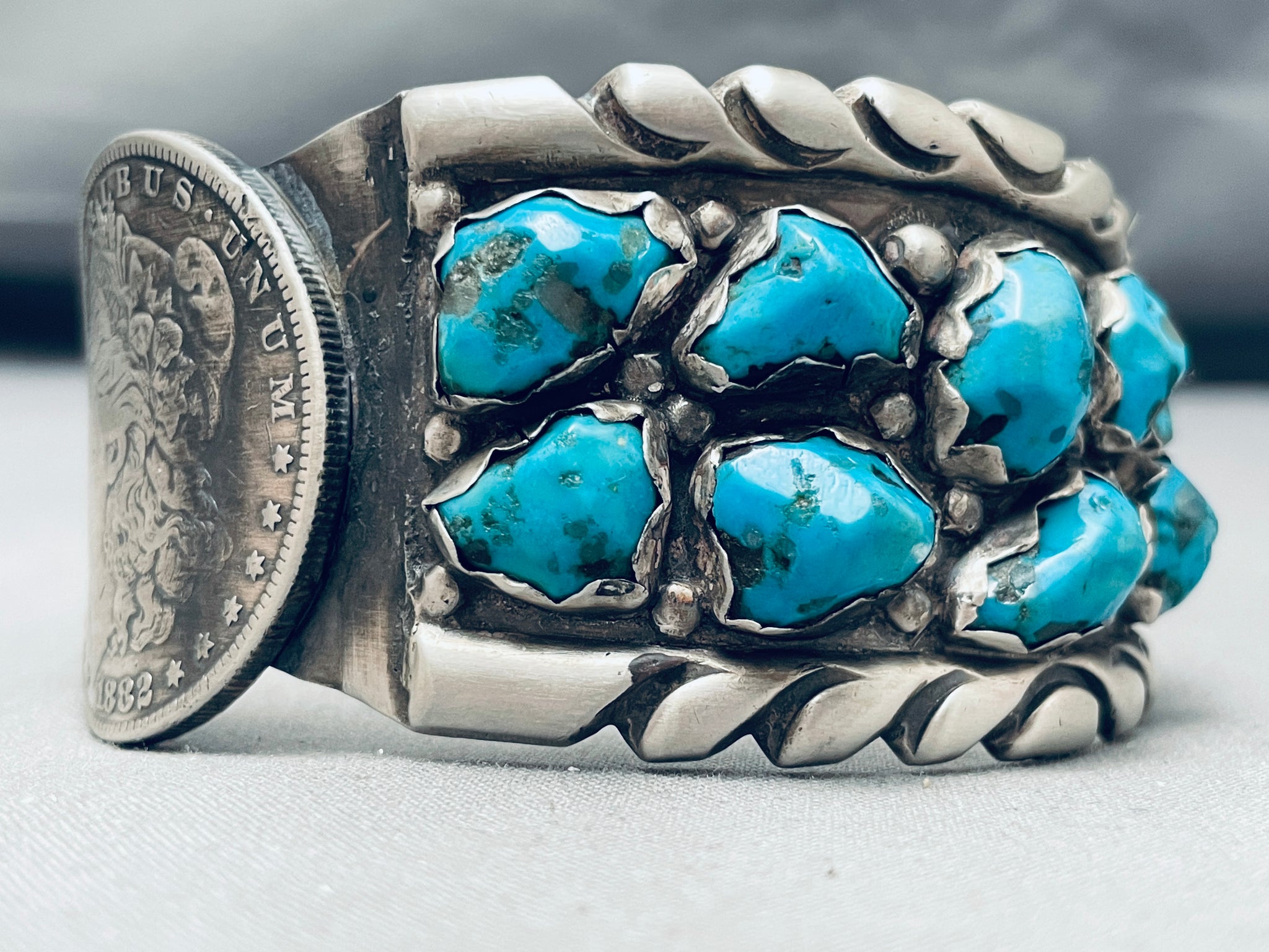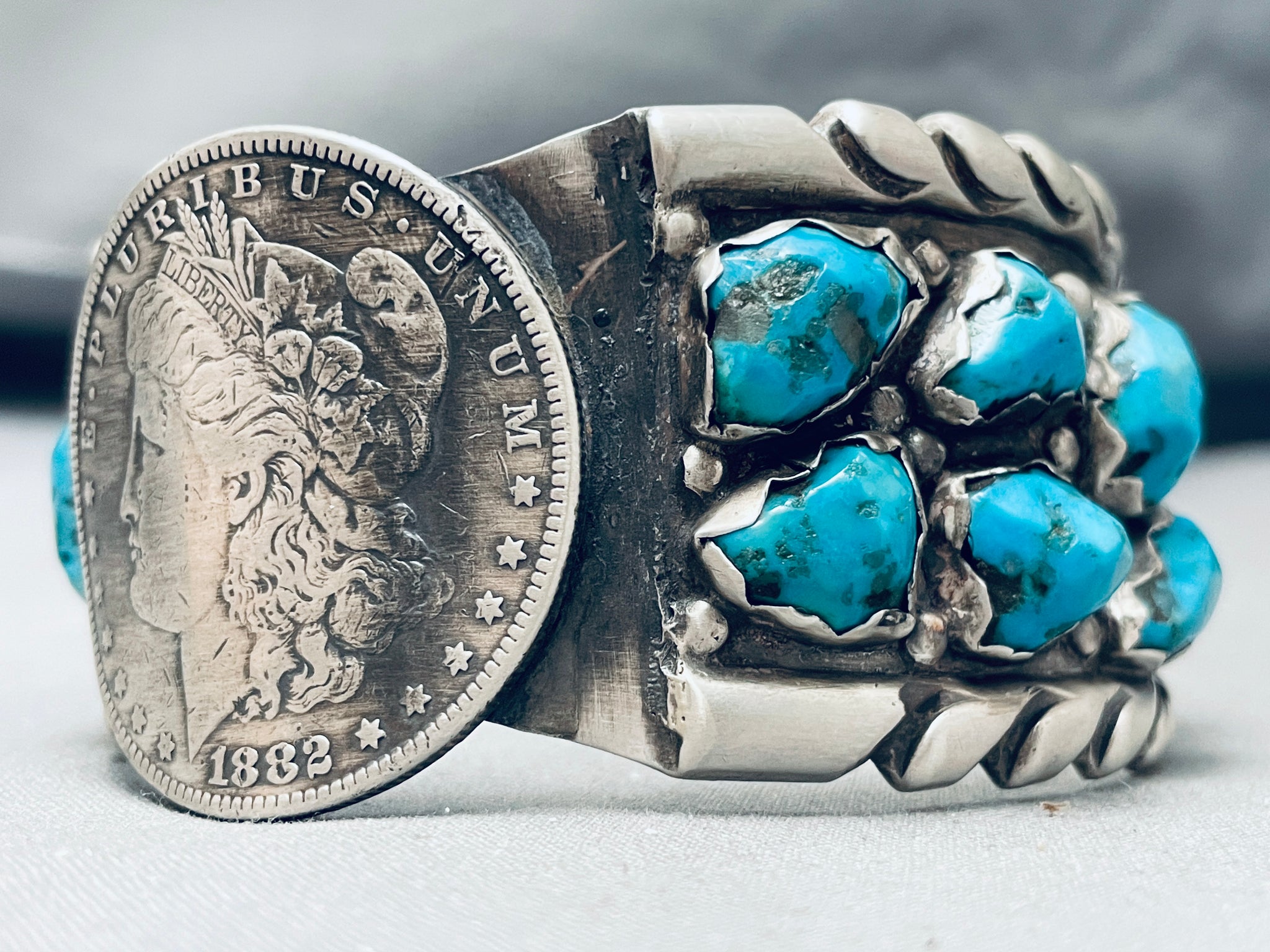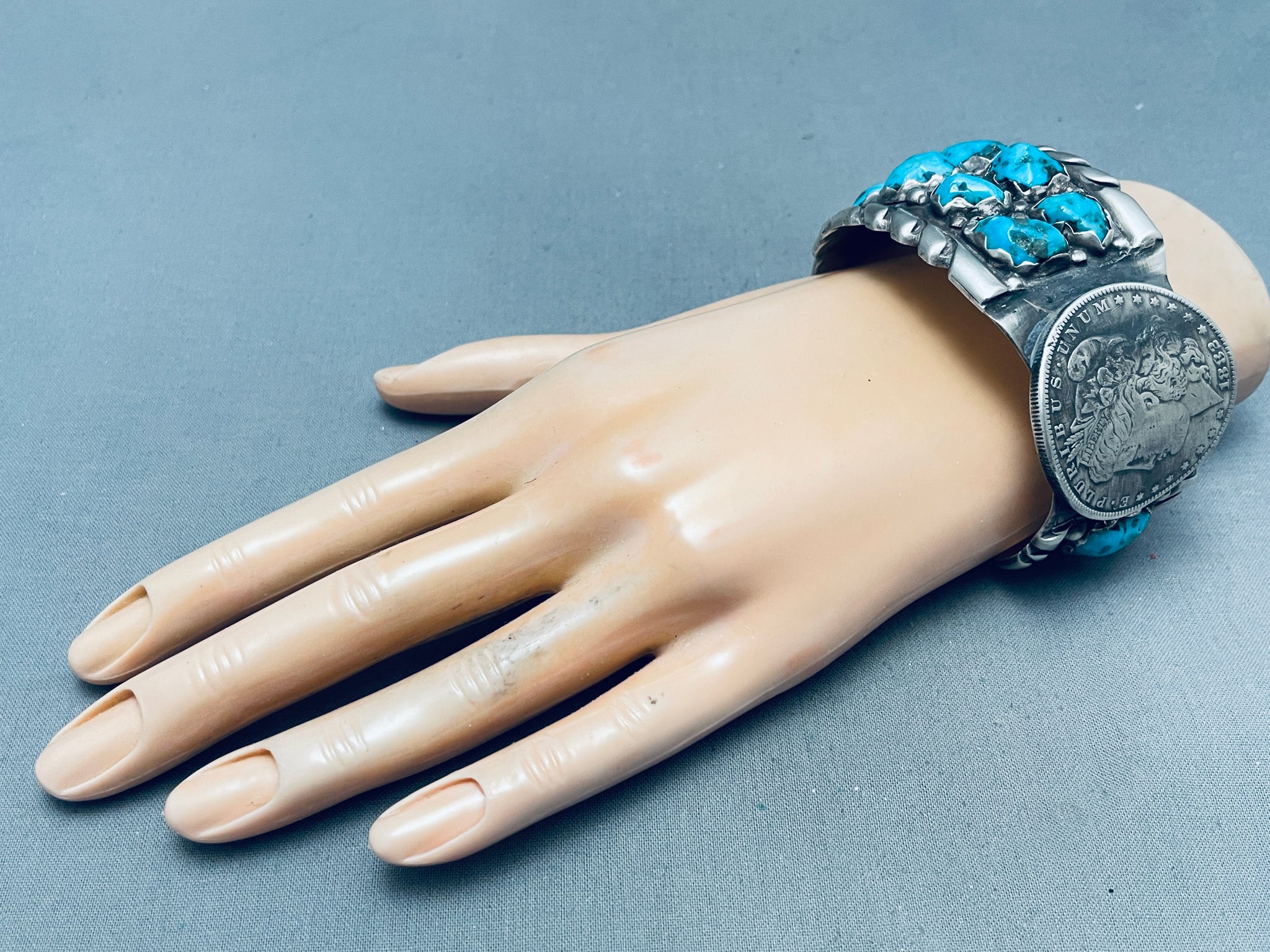 Astounding Vintage Native American Zuni Usa Silver Dollar & Turquoise Sterling Silver Bracelet